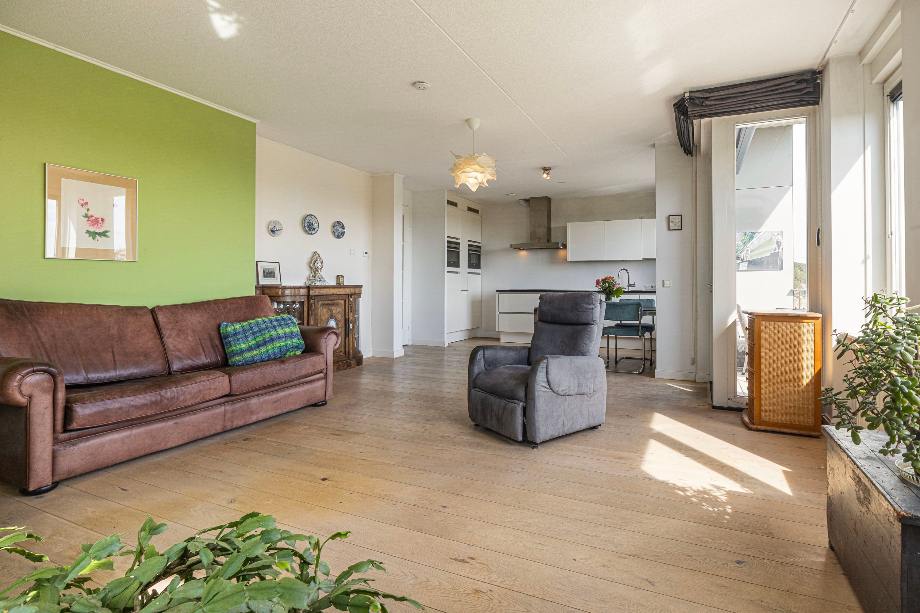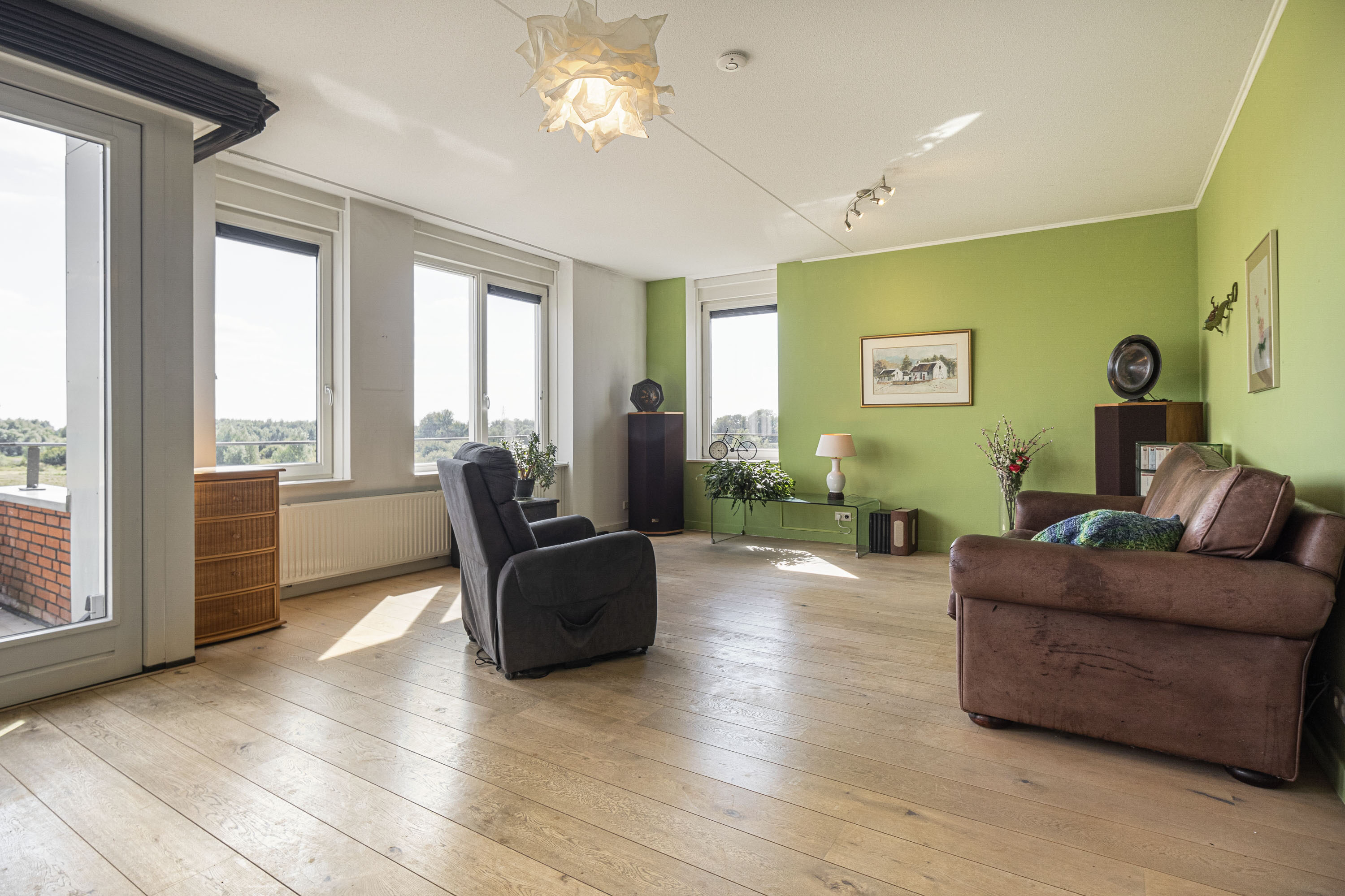 Het appartement bereik je via de lift of trappengang. Bij binnenkomst vind je de meterkast, garderobekast en het seperate toilet. De lichte woonkamer valt direct op door het vrije uitzicht en de open indeling, met voldoende ruimte voor verschillende zitjes. Vanuit hier stap je het balkon op, gelegen op het zuiden en voorzien van zonnescherm.