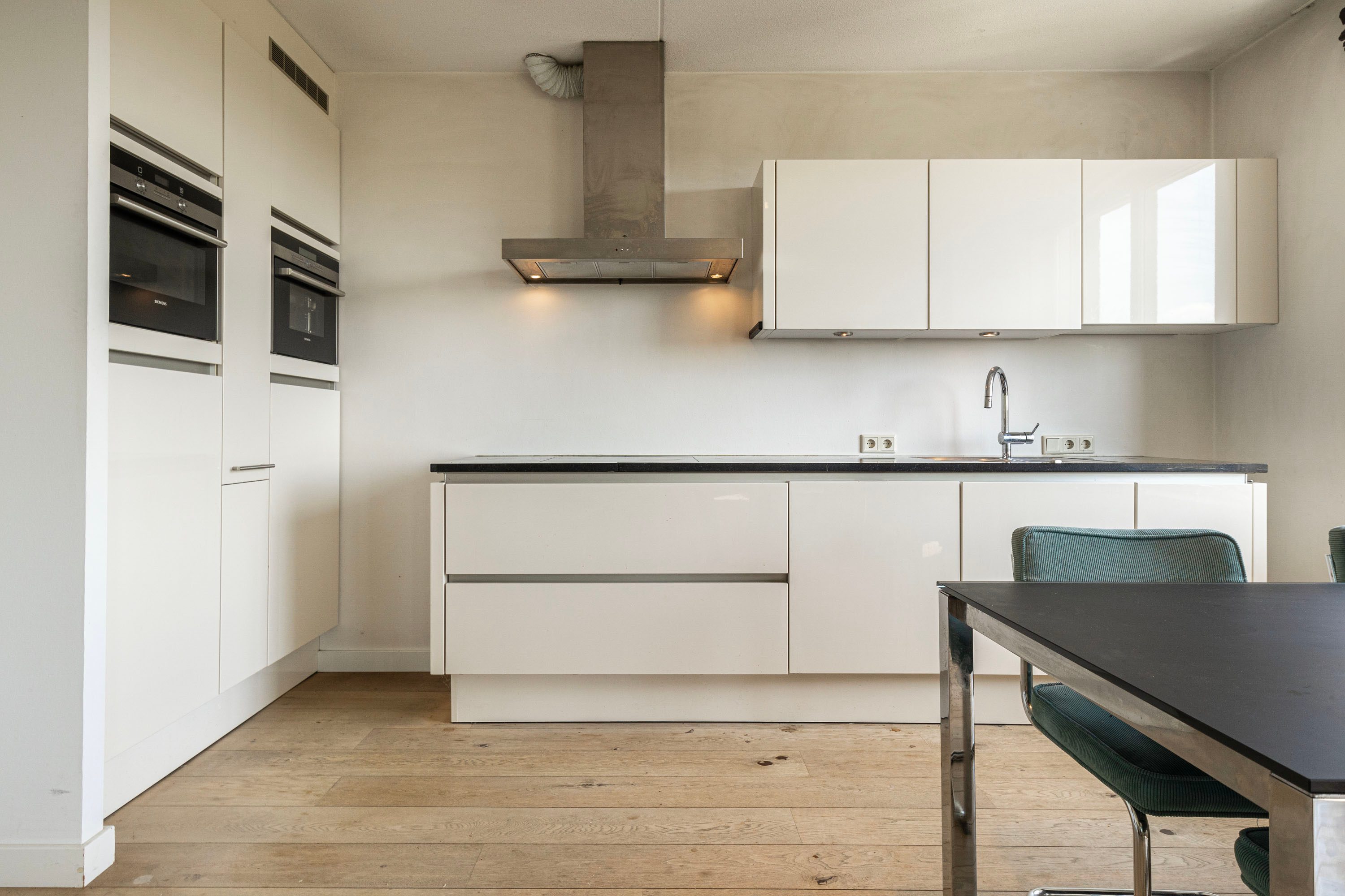 De open keuken is uitgerust met een inductiekookplaat, afzuigkap, oven, stoomoven, vaatwasser, koelkast en vriezer.