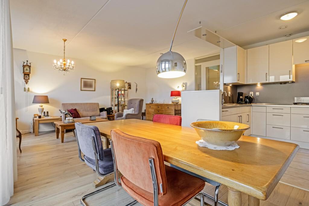 Via de entree en ruime hal met meterkast en toilet krijg je toegang tot alle vertrekken. De ruime woon-eetkamer heeft een afmeting van 33,6m², is voorzien van een laminaatvloer en heerlijk veel lichtinval door de grote raampartijen. Door de fijne afmeting is er ruimte genoeg voor een eettafel. De keuken is opgesteld in een lichte kleurstelling en beschikt over diverse inbouwapparatuur, te weten: een gasfornuis, afzuigkap, oven, magnetron en een koelkast.