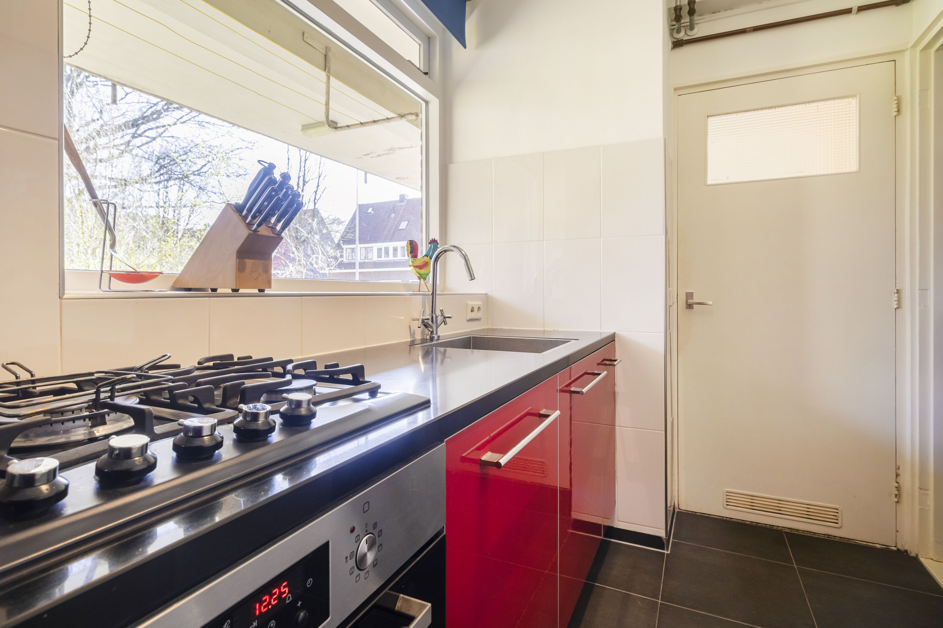 De dichte keuken is bereikbaar vanuit de hal. Met een raam aan de voorzijde is er veel daglicht en kijk je leuk weg op het groen. De keuken is uitgerust met diverse inbouwapparatuur, te weten: