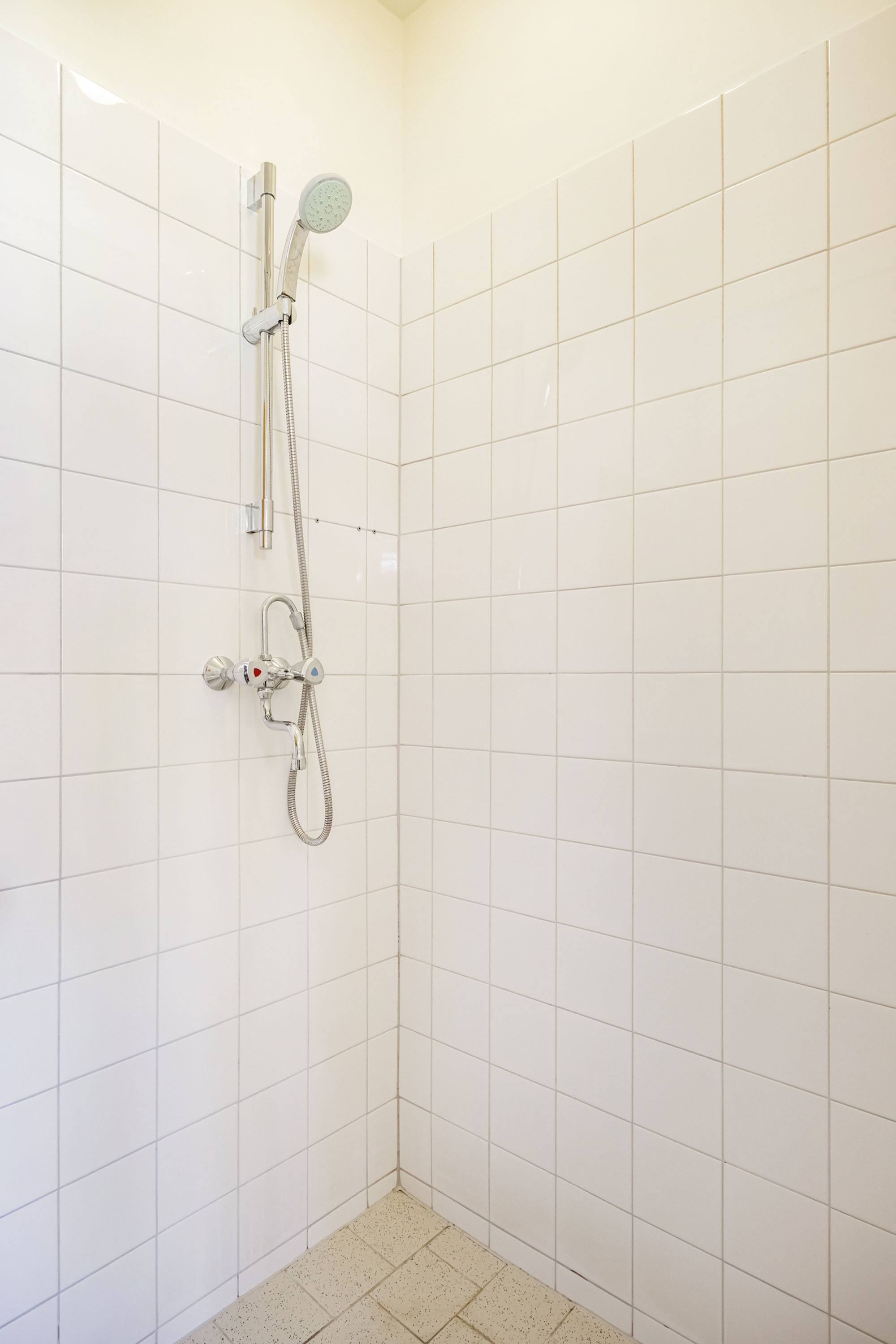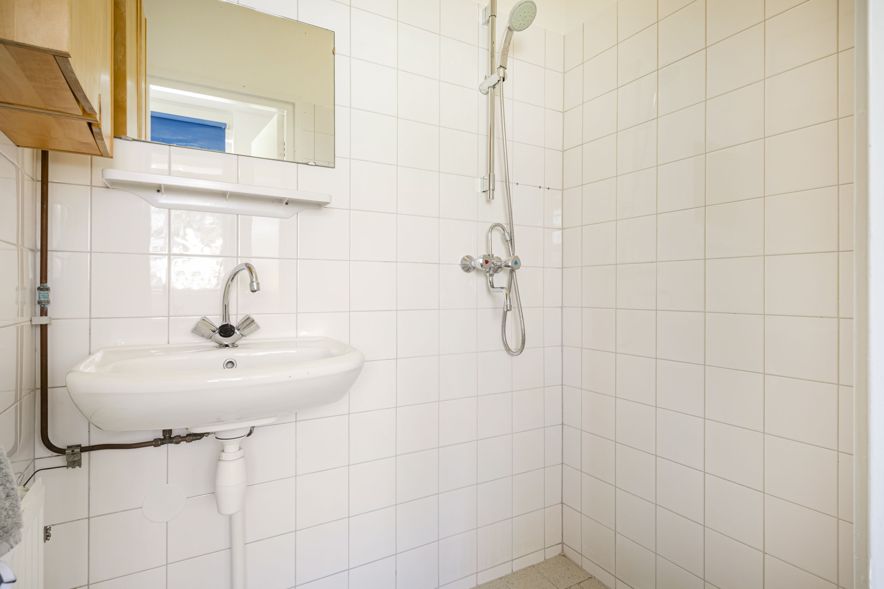 Vanuit de keuken is de badkamer te bereiken, die voorzien is van een douche, wastafel en radiator.