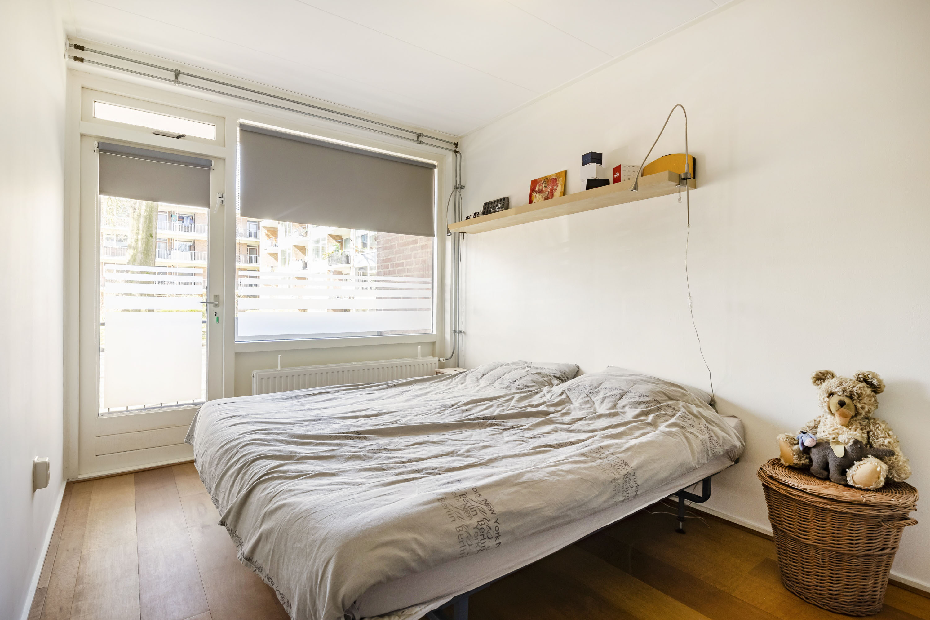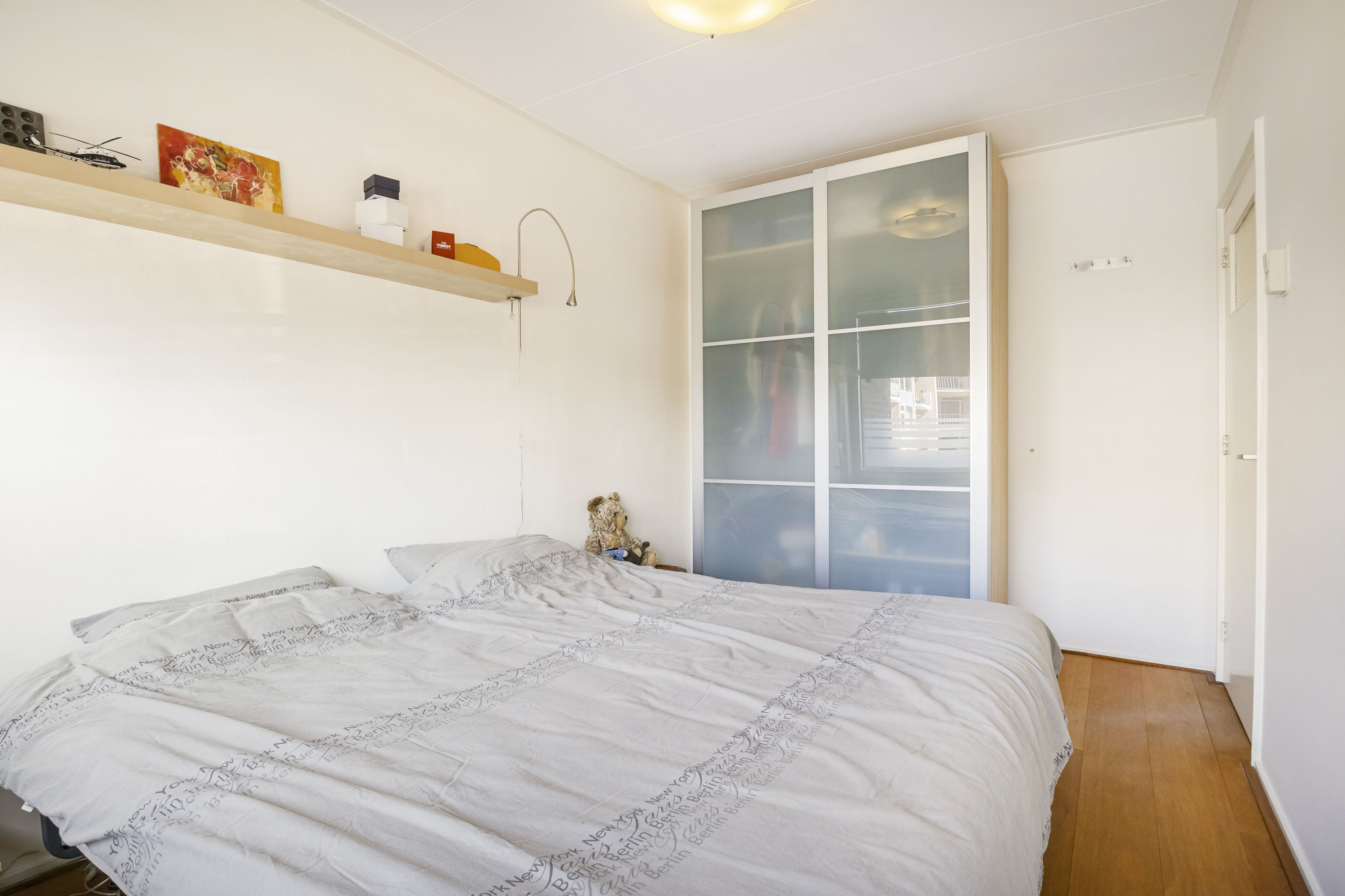 Bij binnenkomst in de hal is er toegang tot de moderne meterkast (6 groepen), de opbergkast, de keuken, de toiletruimte, de slaapkamers, de woonkamer en een vaste kast welke perfect als ruime kapstok fungeert. De woonkamer is een fijne, lichte ruimte dankzij de grote raampartij aan de voorzijde. Daarnaast beschikt de woonkamer over een praktische vaste kast en biedt deze toegang tot het balkon, dat gelegen is op het westen en zorgt voor heerlijk veel zon in de middag en avond. De woonkamer, de hal en de grote slaapkamer aan de balkonzijde zijn voorzien van een doorlopende parketvloer. Het parket in de hal is in 2025 nog een keer gewaxt.