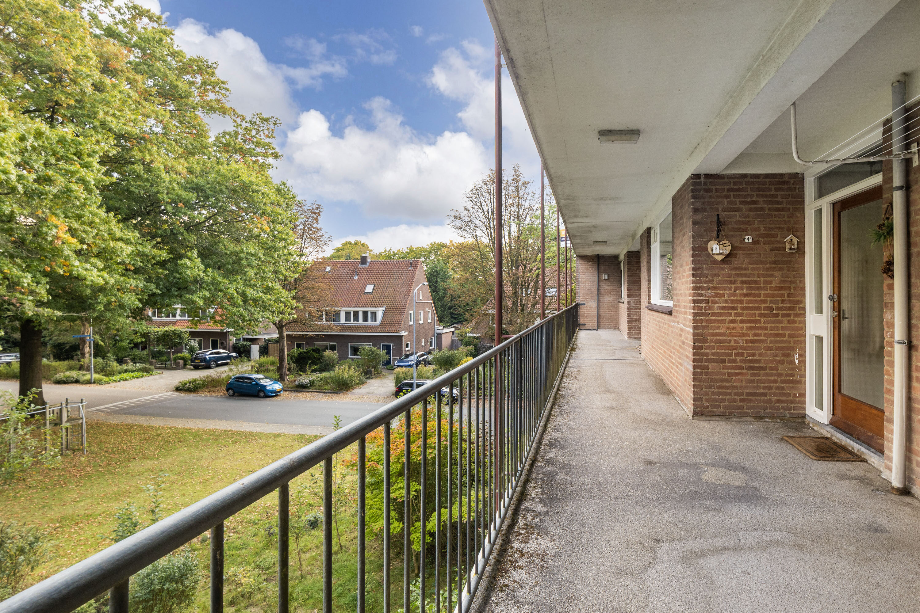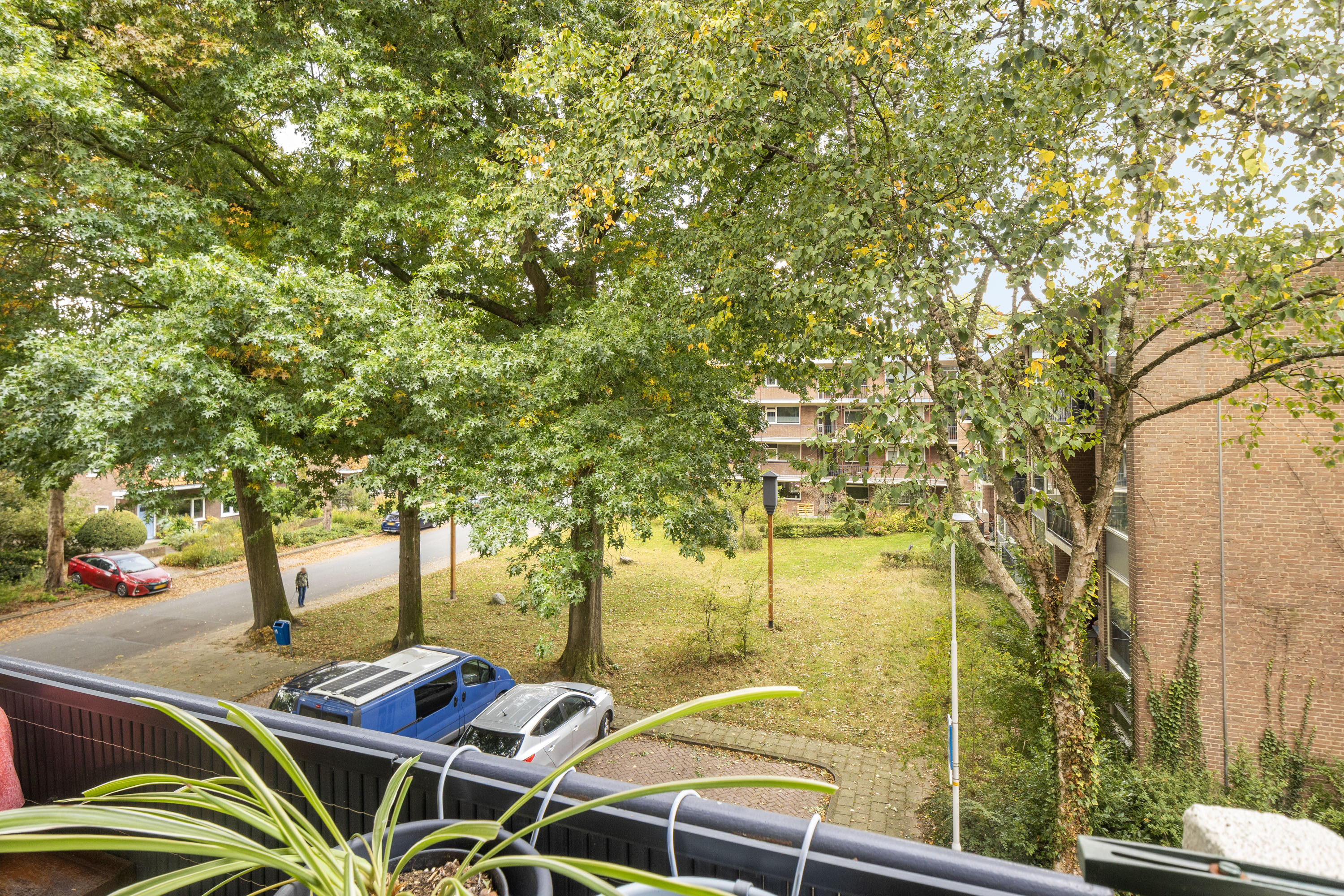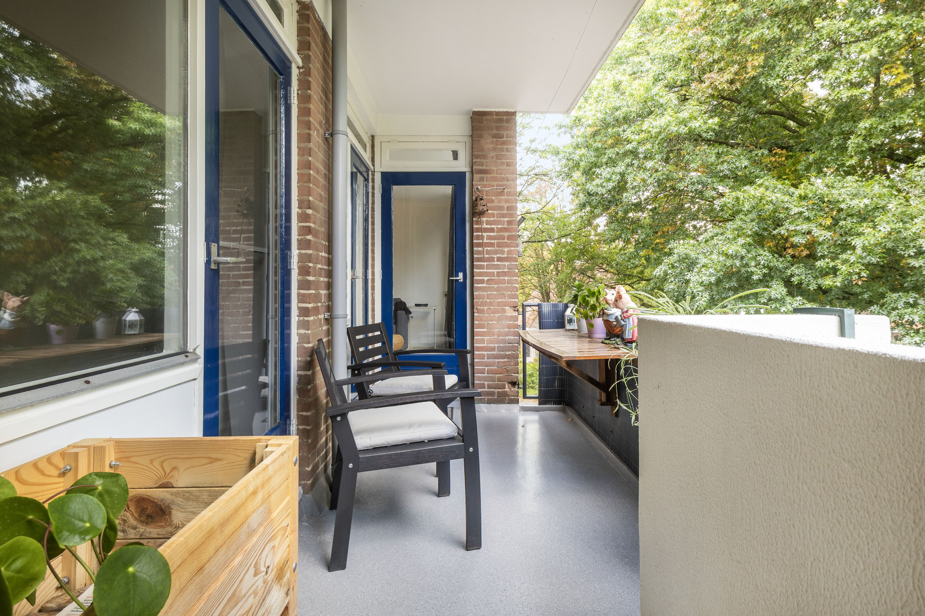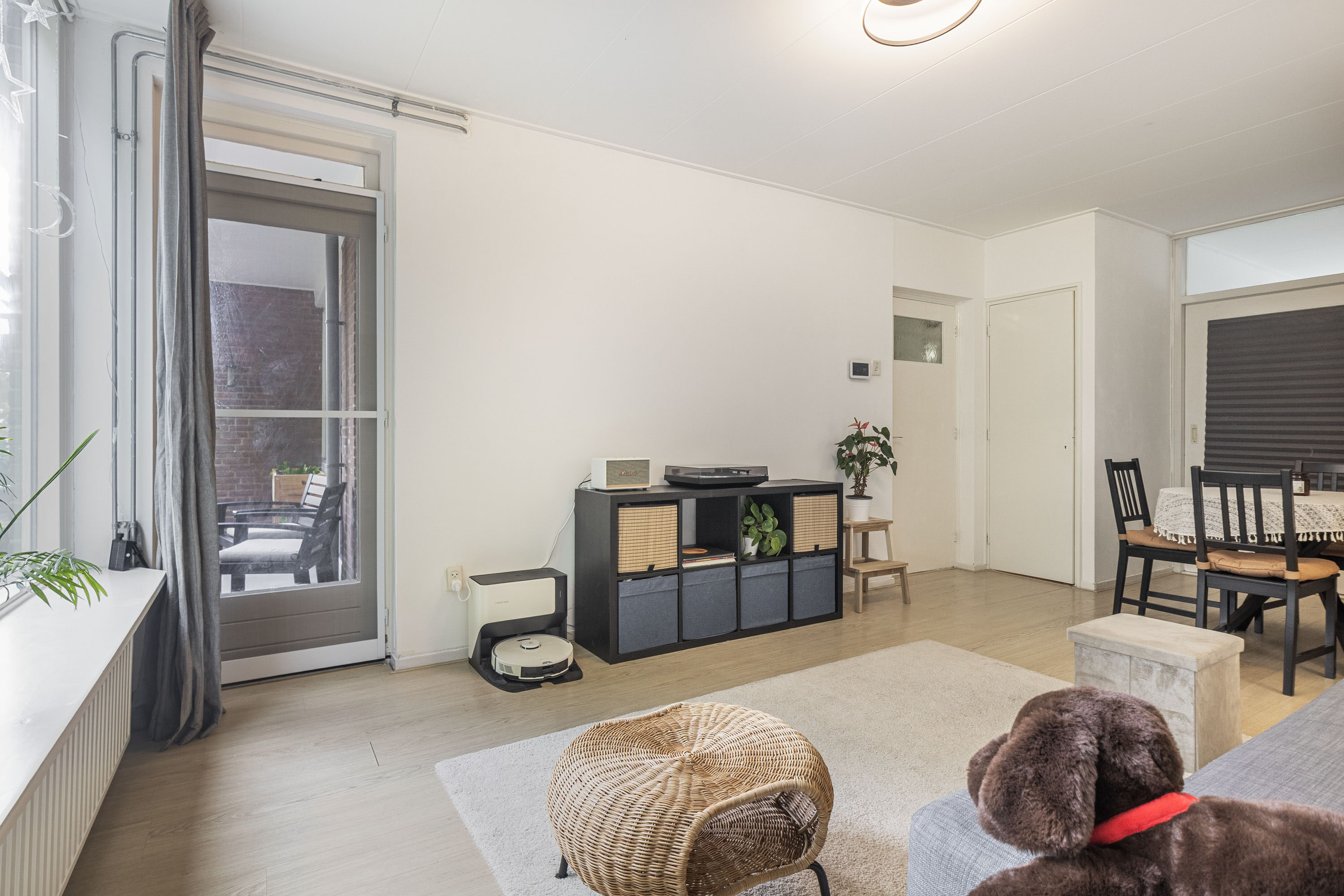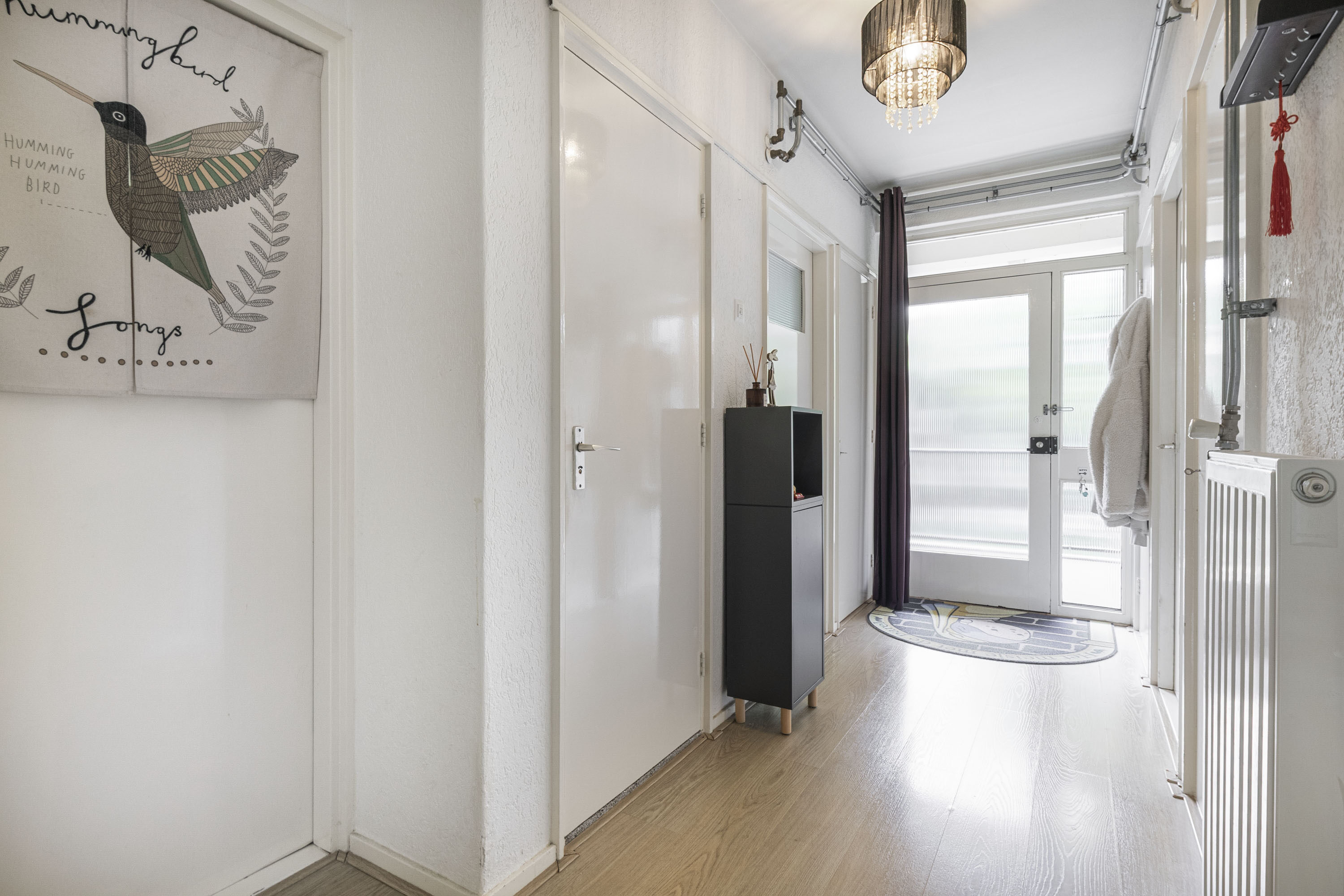 De hal met meterkast, toilet en bergruimte biedt toegang tot alle vertrekken. De woonkamer is ruim en licht dankzij de grote ramen en het uitzicht over de groene omgeving. Vanuit de woonkamer stap je direct het balkon op, waar je volop kunt genieten van de avondzon.