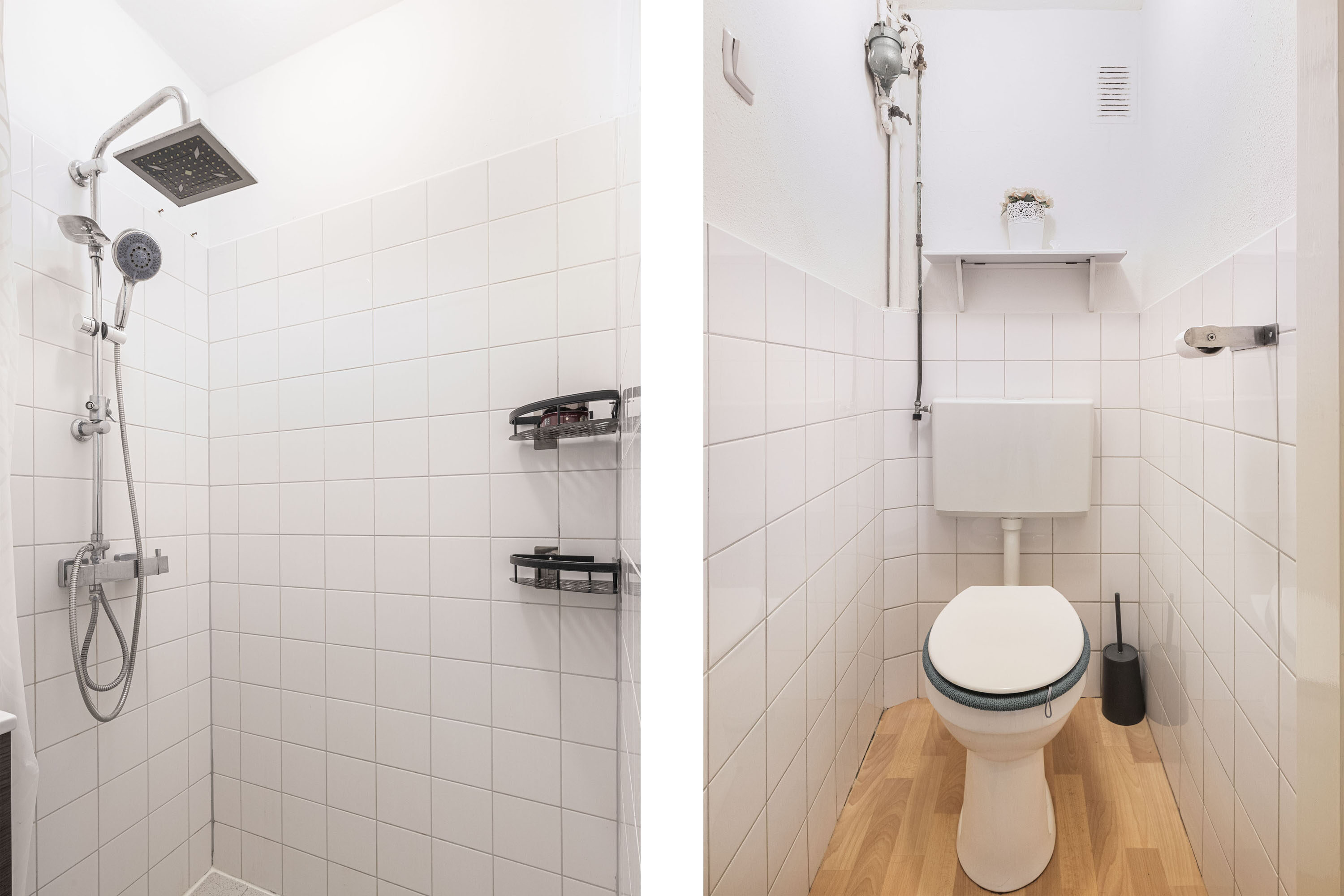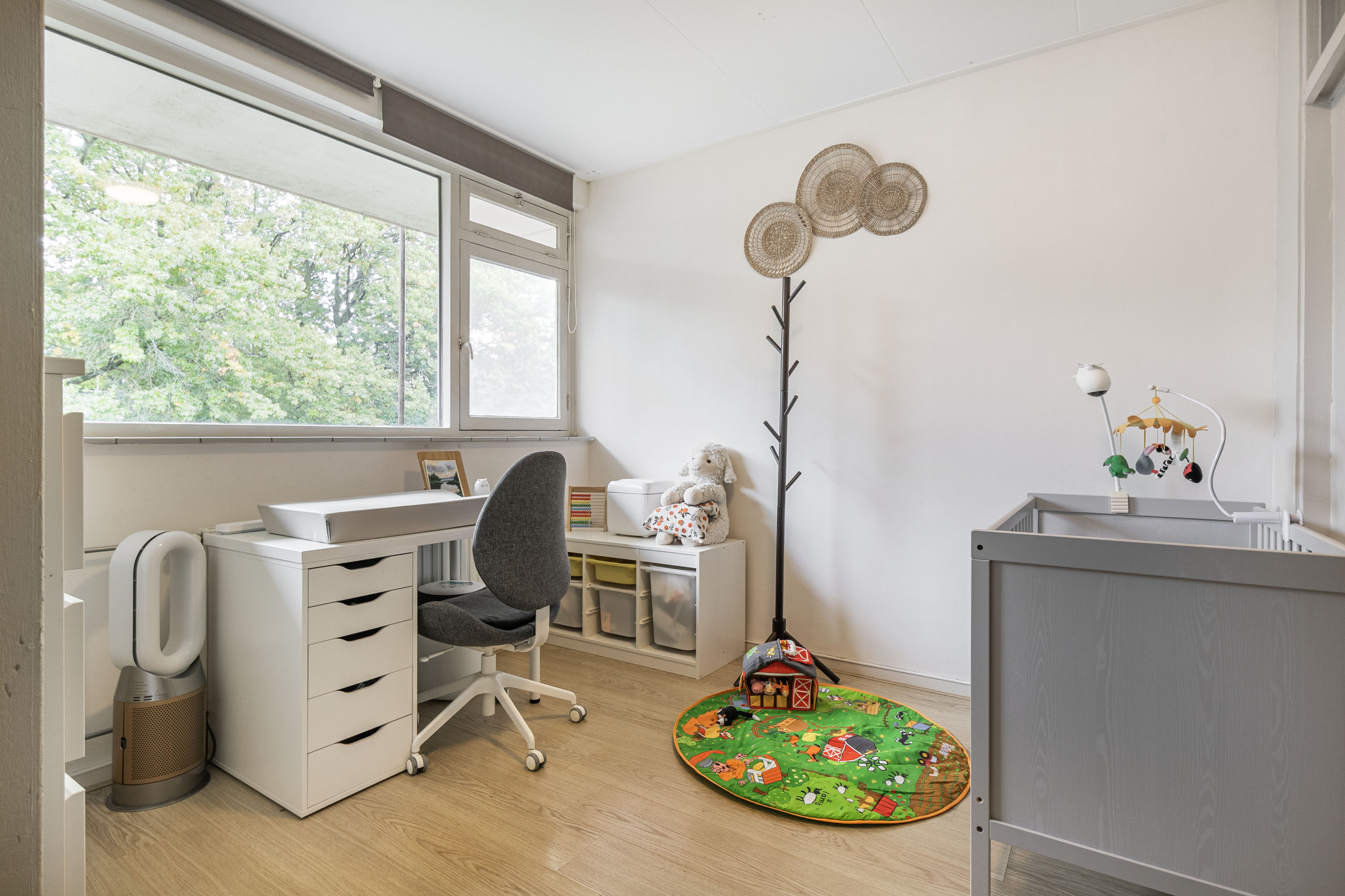 The hallway, with meter cupboard, toilet, and storage space, provides access to all rooms. The living room is spacious and bright thanks to the large windows and the view of the green surroundings. From the living room, you step directly onto the balcony, where you can enjoy the evening sun.