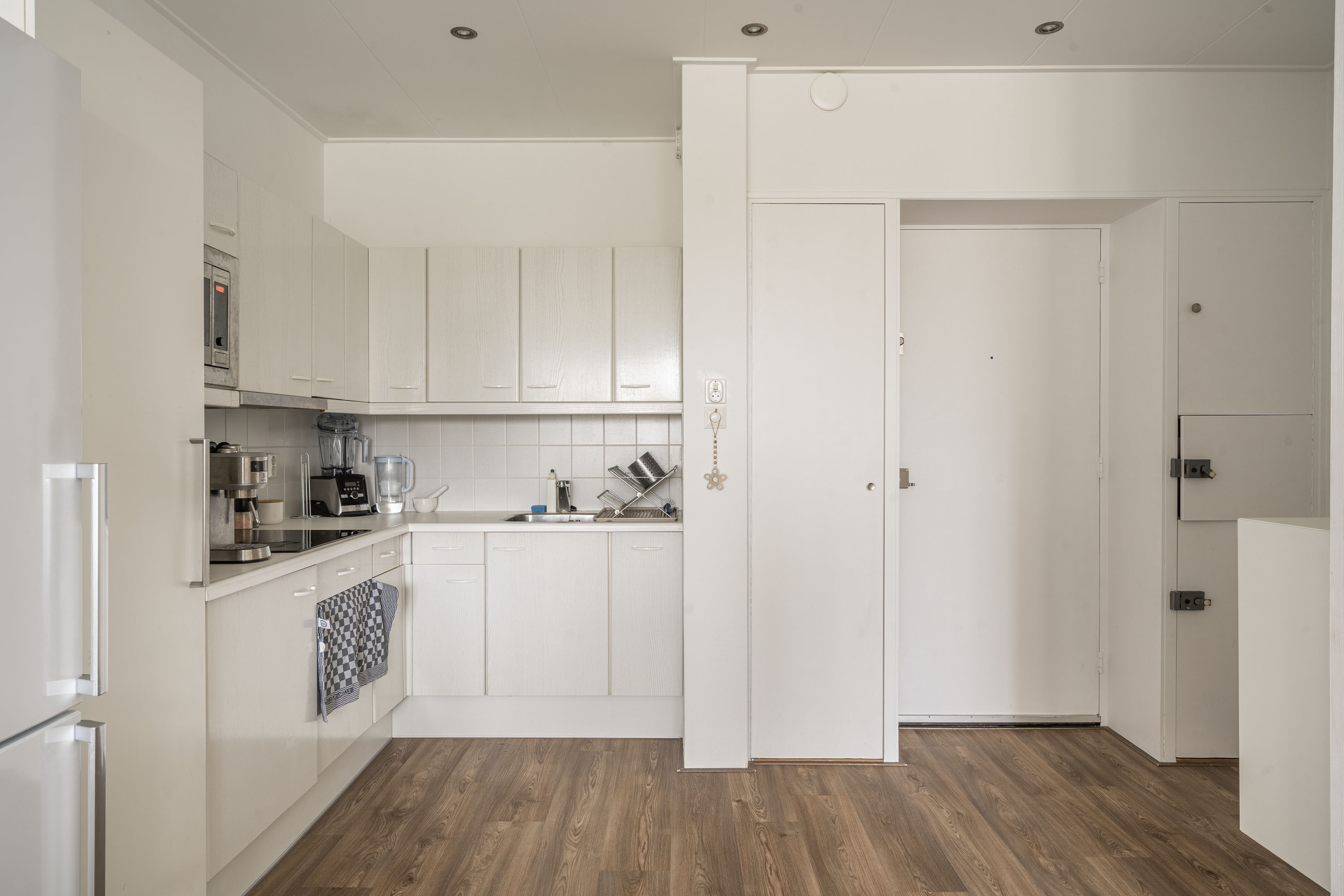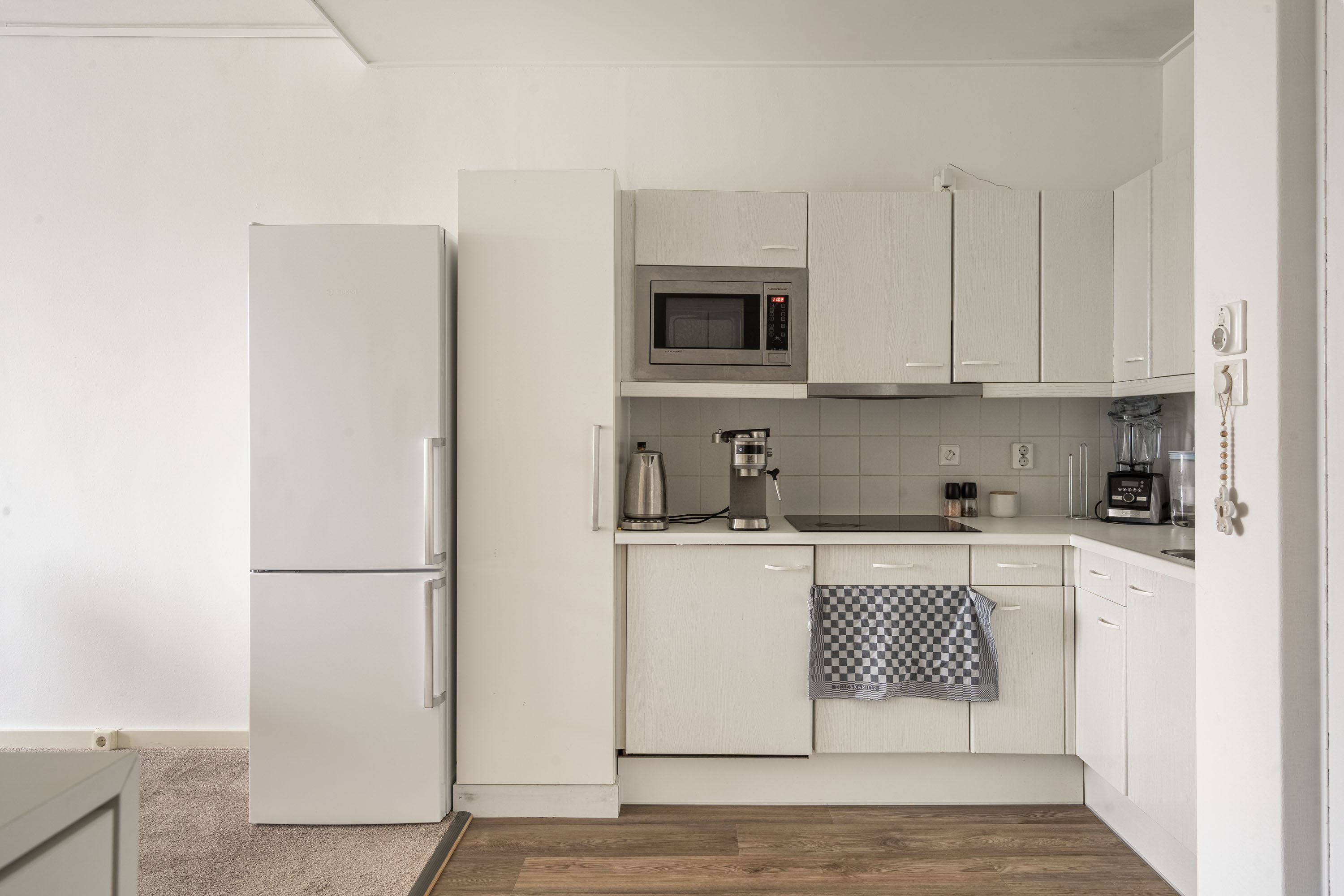 - Open keuken met een hoekkeuken voorzien van inductiekookplaat, vaatwasser, afzuigkap, koel-/vrieskast.
