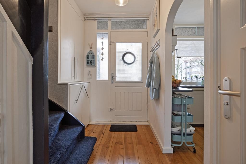 Wanneer je binnenkomt, stap je in een ruime en uitnodigende entree. Aan je rechterkant vind je de meterkast en trapopgang naar de andere verdieping. Naast de trapopgang is er een handige berging, perfect voor het opbergen van huishoudelijke artikelen. Aan de andere kant van de entree bevindt zich een stijlvol afgewerkt toilet met een fonteintje.