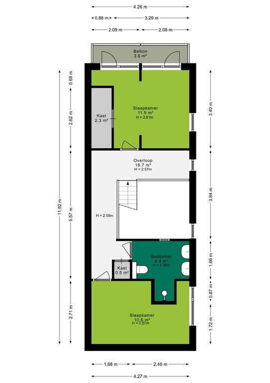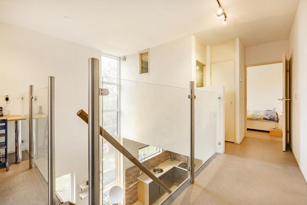 Via de open trap bereik je de eerste verdieping, waar je op de overloop uitkomt. Deze overloop geeft toegang tot twee ruime slaapkamers, een badkamer (vergroot) en een werkruimte. De slaapkamers bevinden zich aan beide uiteinden van de woning. Eén van de slaapkamers beschikt over een inbouwkast en een eigen balkon, terwijl de tweede slaapkamer is voorzien van een grote raampartij voor optimaal daglicht.
