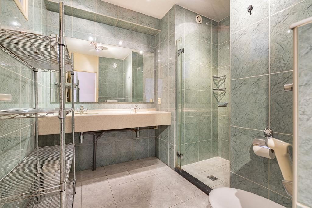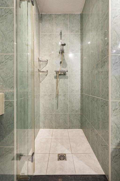 De badkamer is uitgerust met een dubbele wastafel met meubel, een toilet en een ruime douche.