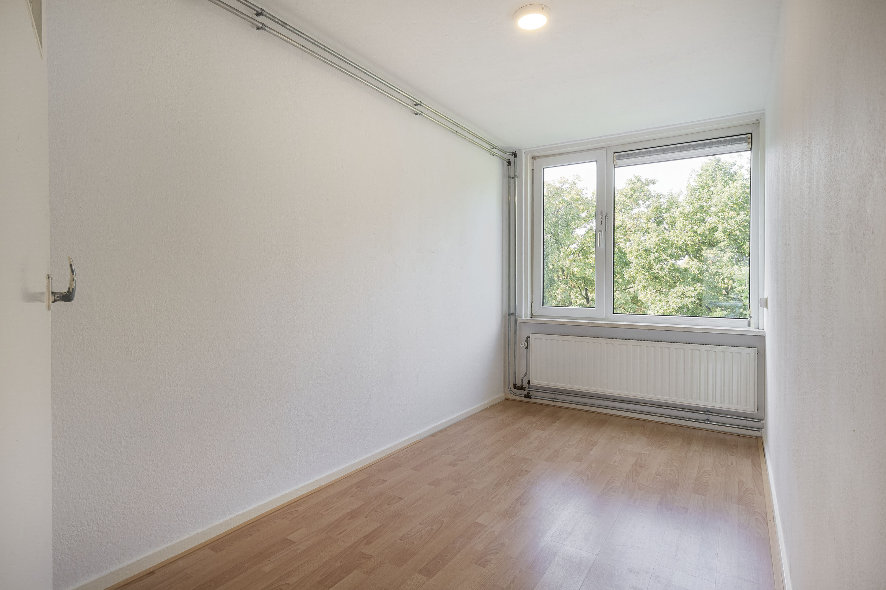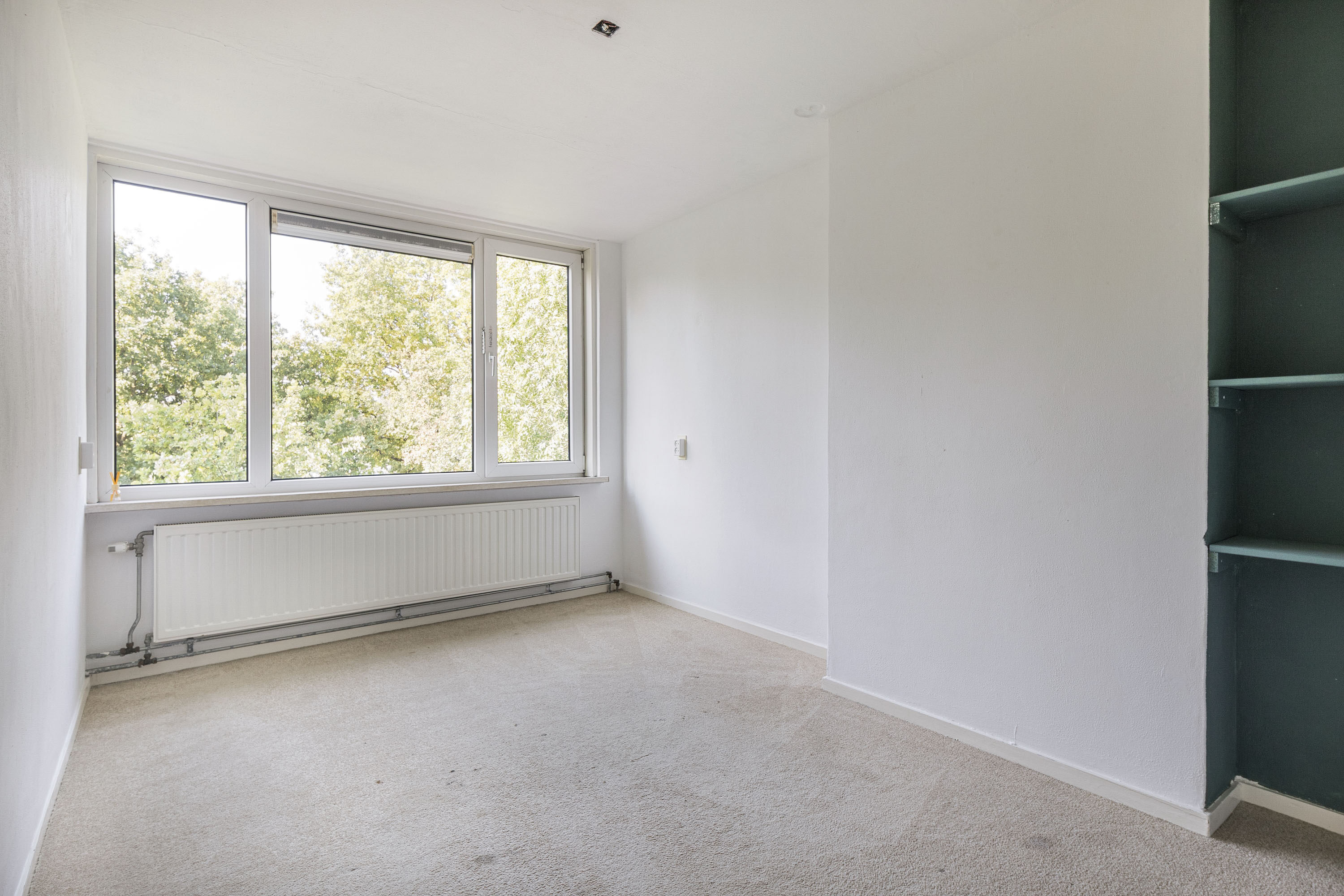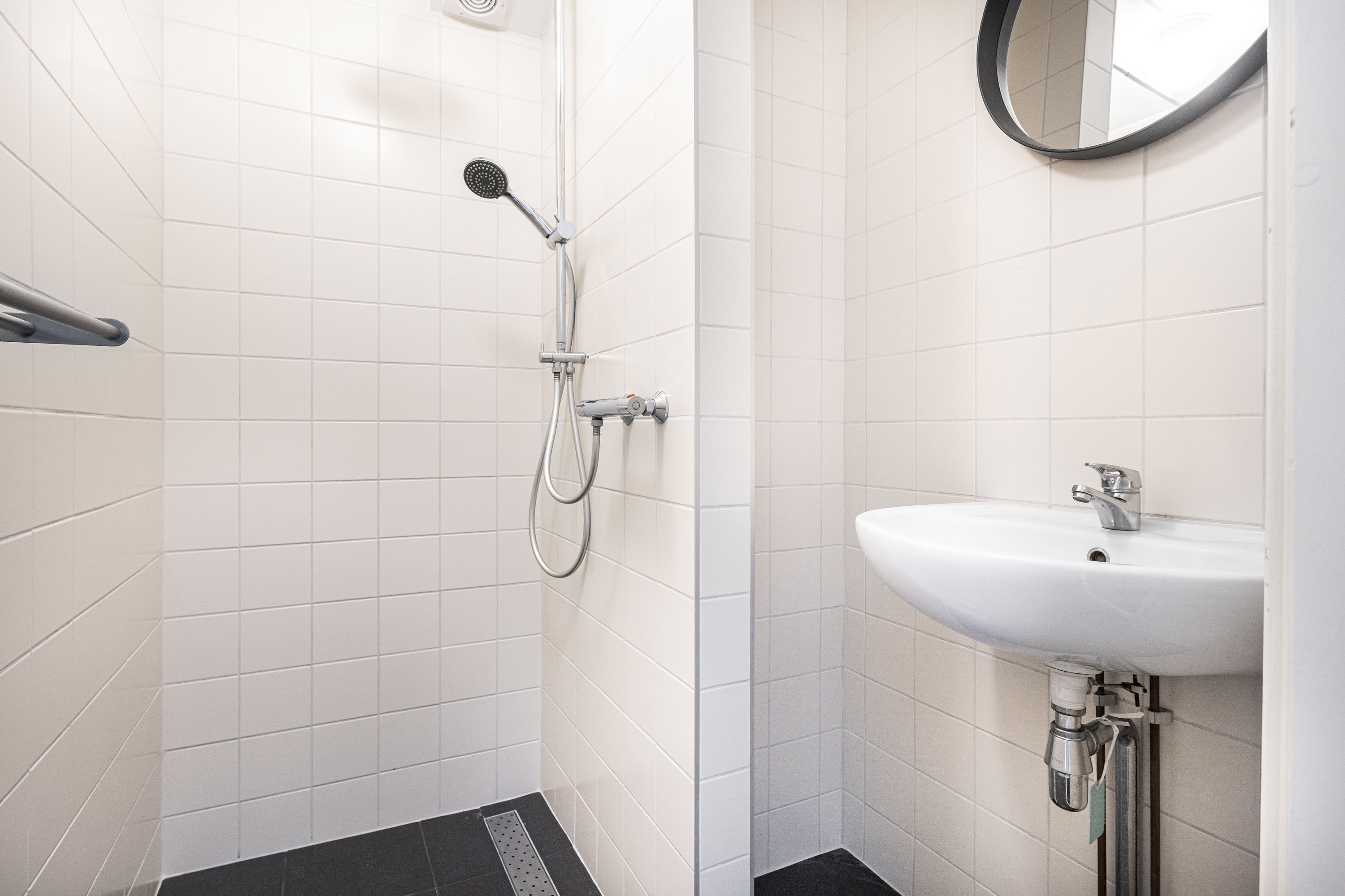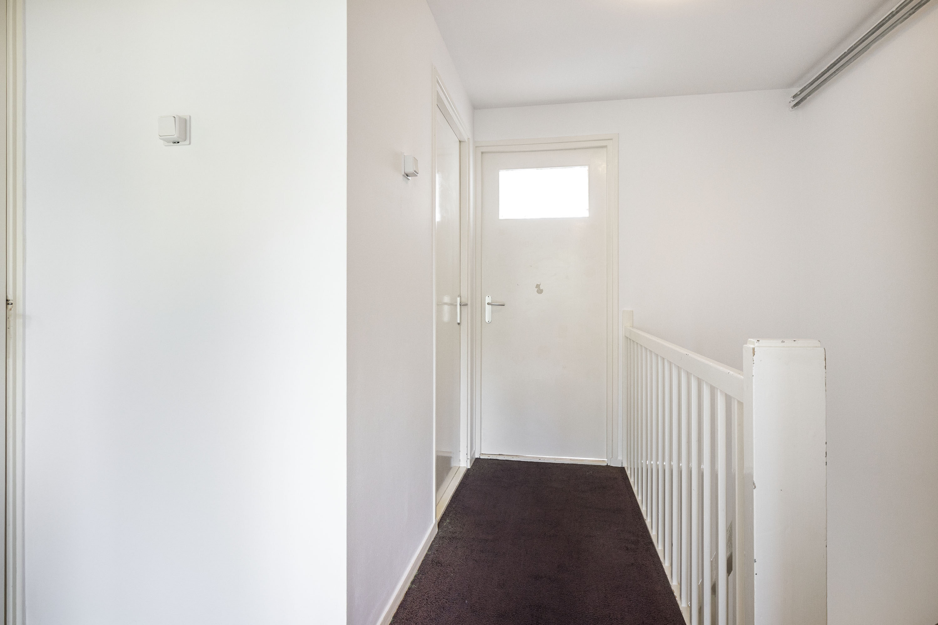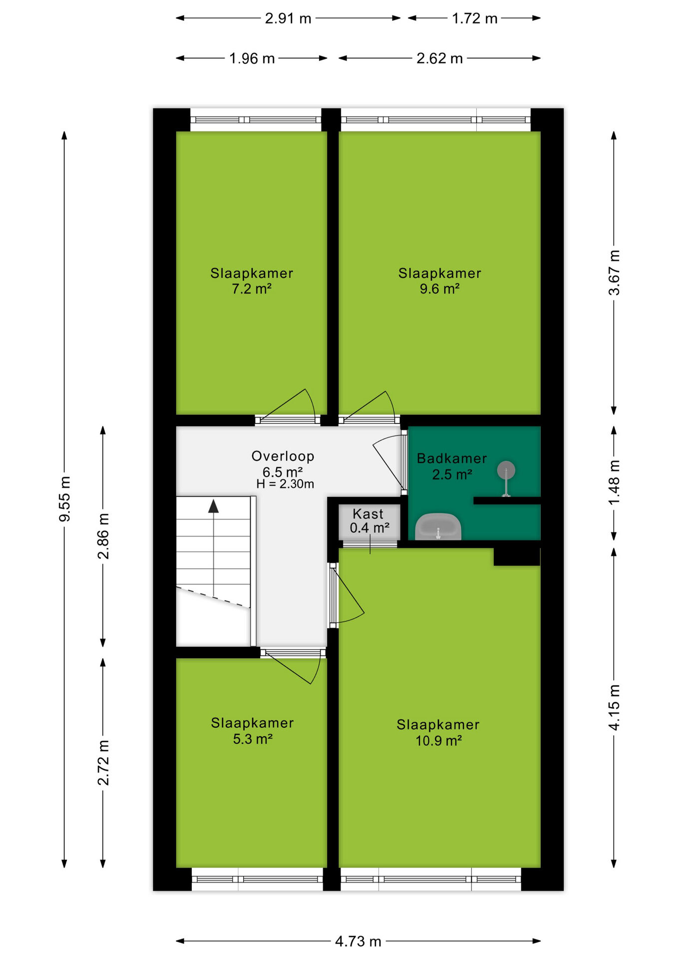 Via een vaste trap bereik je de overloop, die toegang biedt tot vier slaapkamers met de volgende afmetingen: 10,9 m², 9,6 m², 7,2 m² en 5,3 m². De grootste slaapkamer beschikt over een praktische inbouwkast. Dankzij de aanwezige raampartijen zorgen alle kamers voor een prettige lichtinval. Ook bevindt zich op deze verdieping een compacte badkamer van 2,5 m², afgewerkt met witte en antracietgrijze tegels. Deze badkamer is voorzien van een wastafel en een ruime inloopdouche.