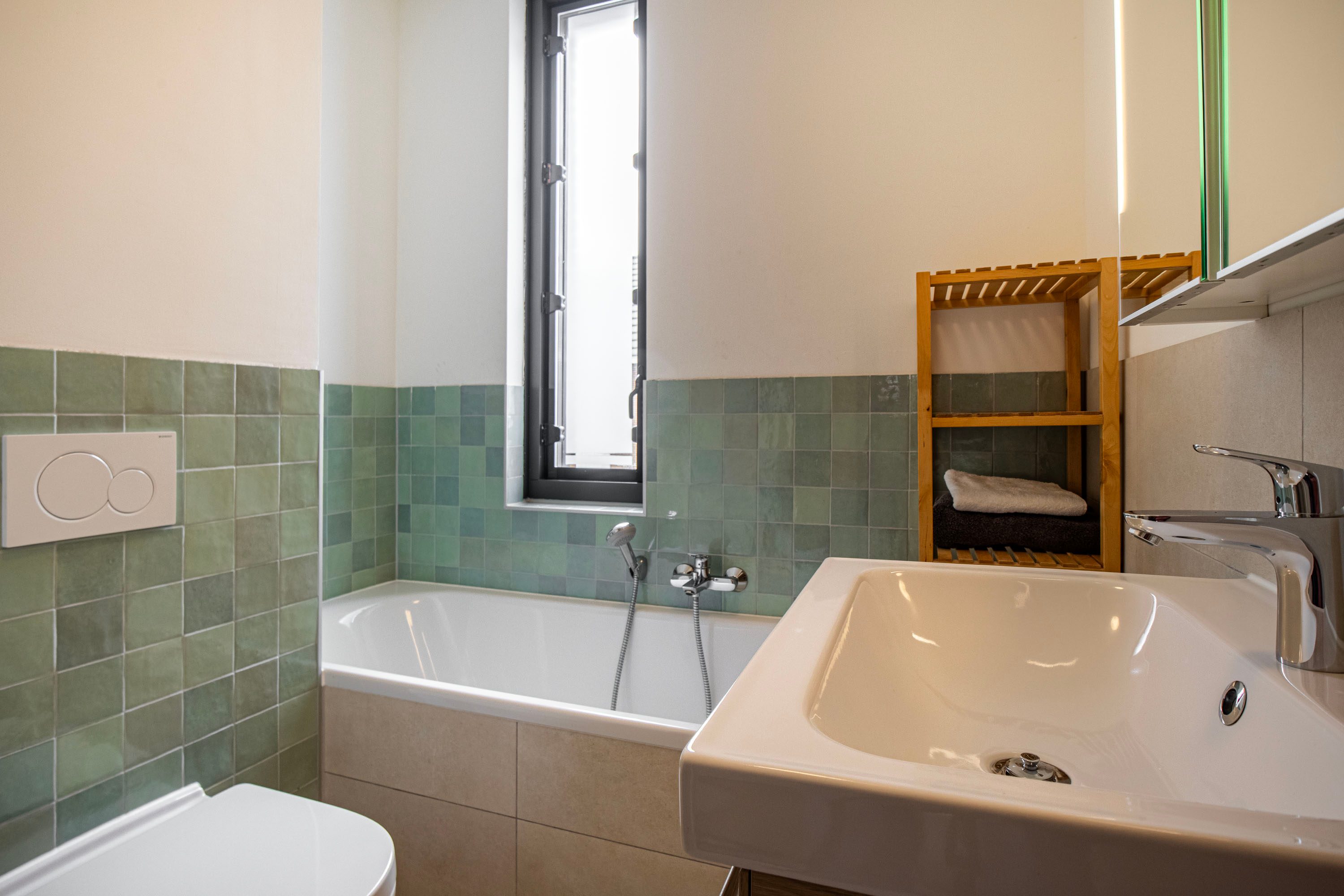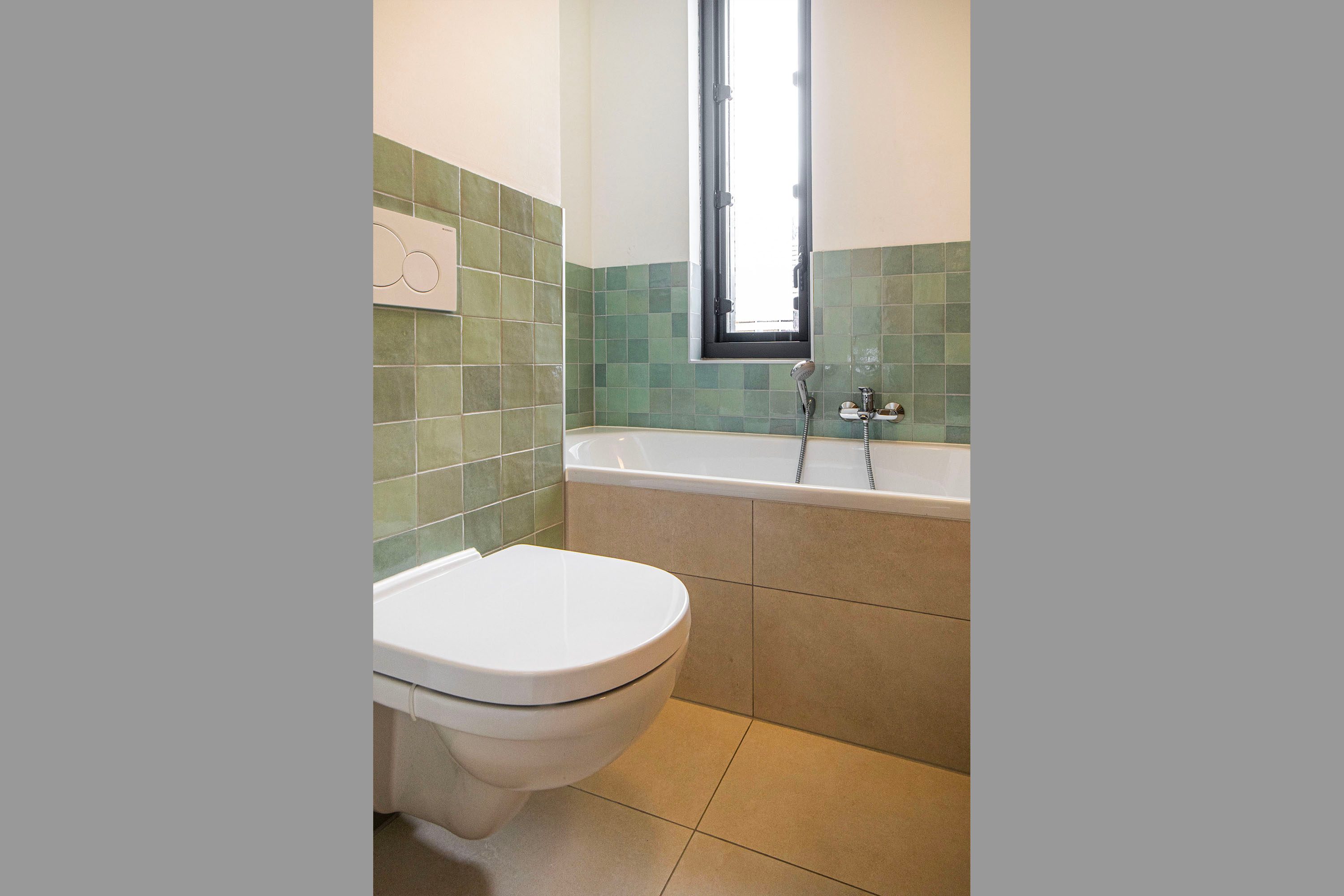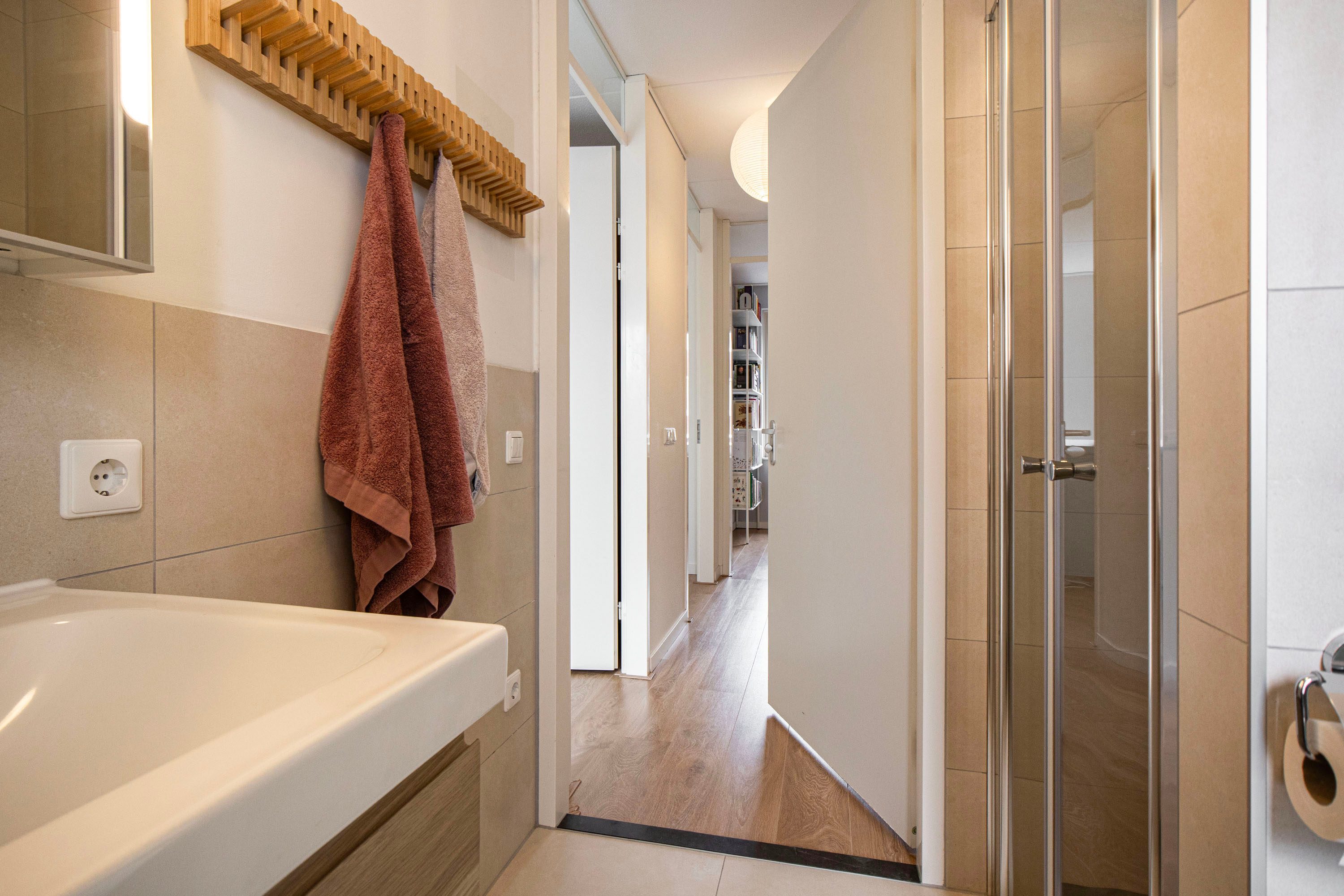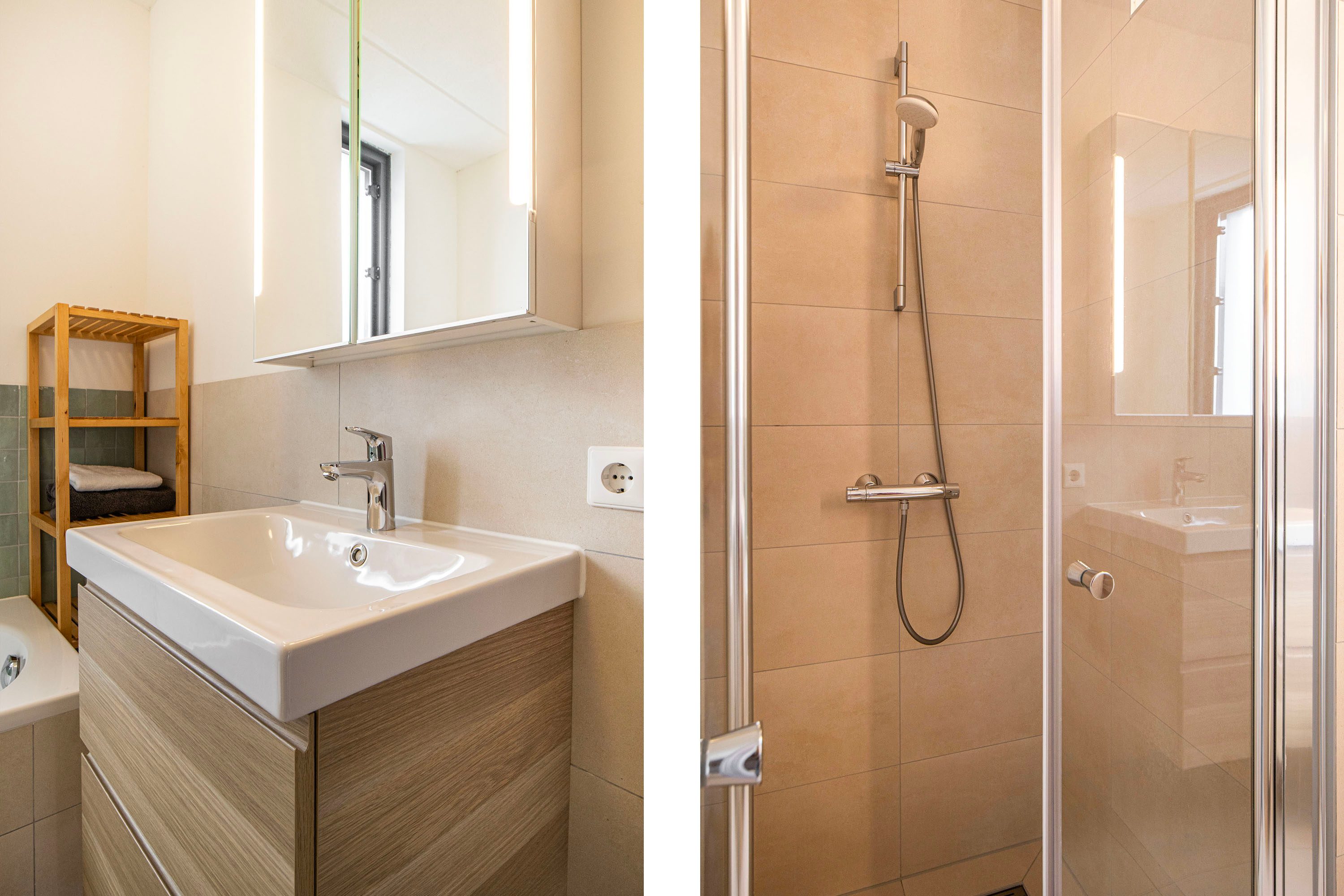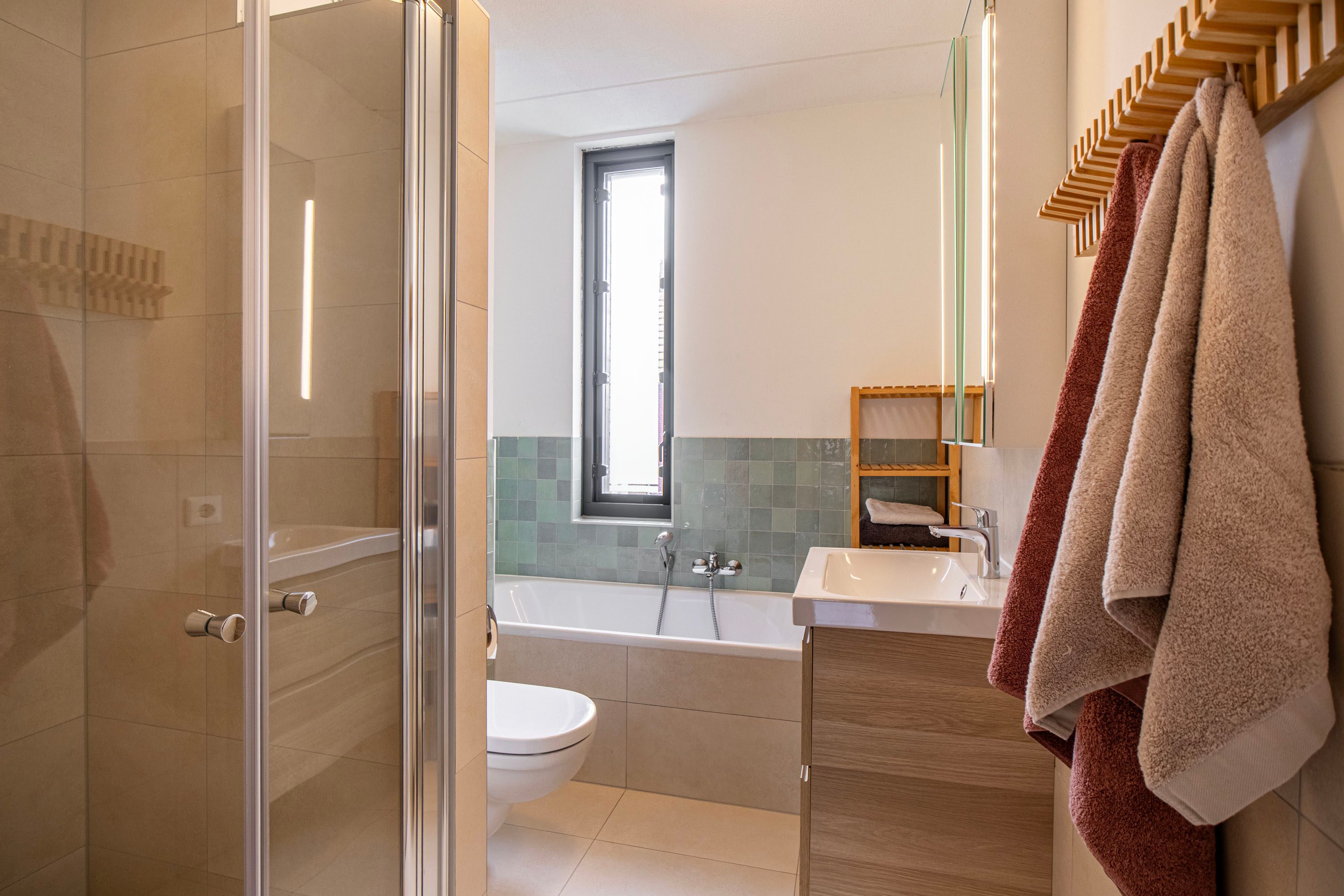 De badkamer is in 2023 gemoderniseerd en strak afgewerkt. Hier vind je een ligbad, inloopdouche, toilet en een wastafelmeubel, waardoor de ruimte zowel comfortabel als compleet is.