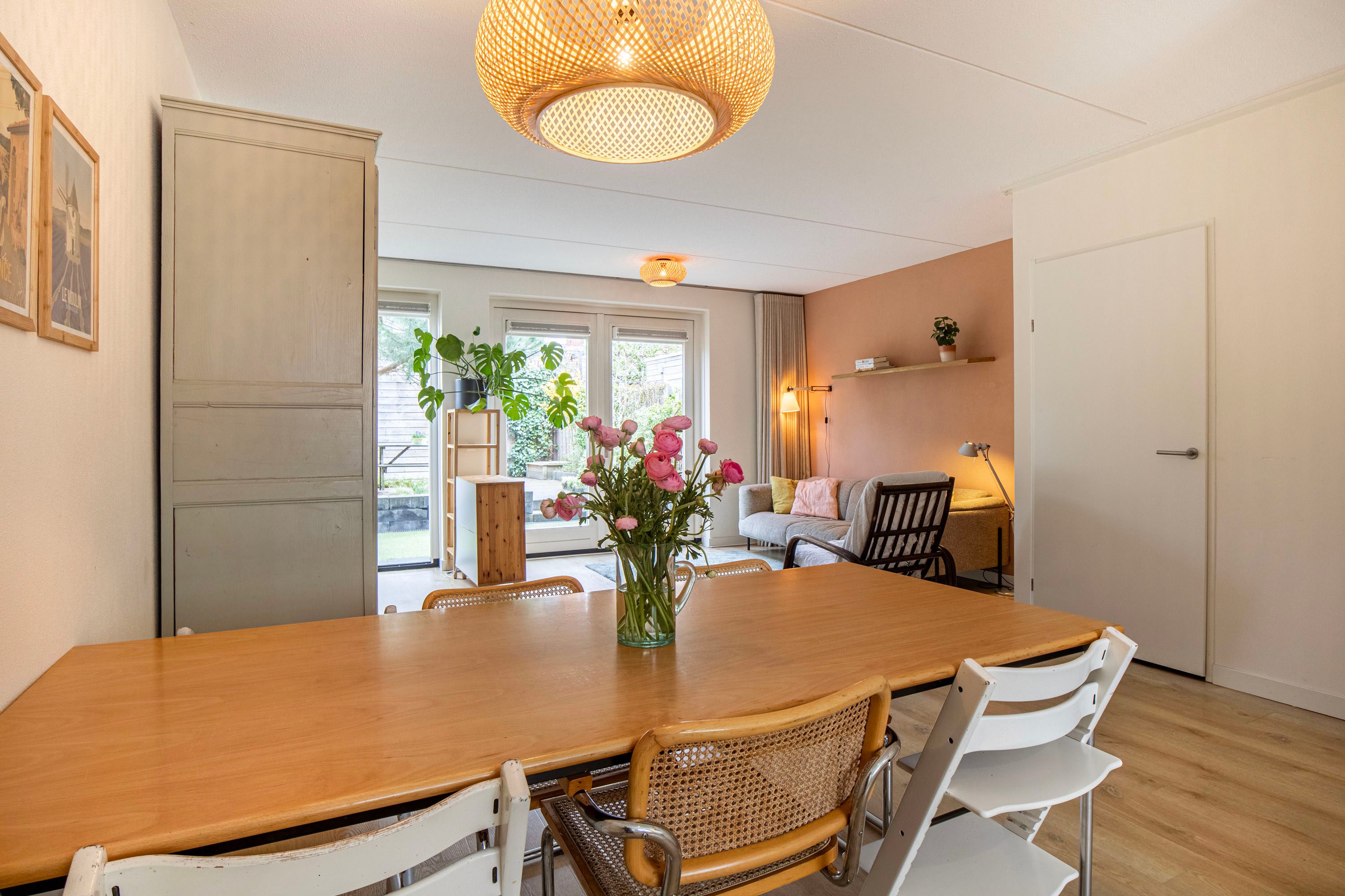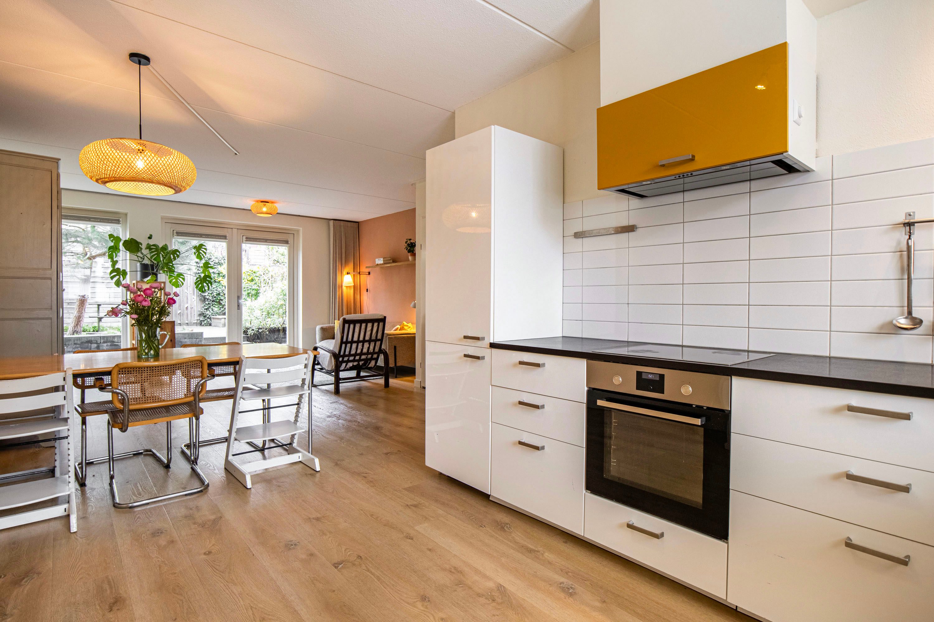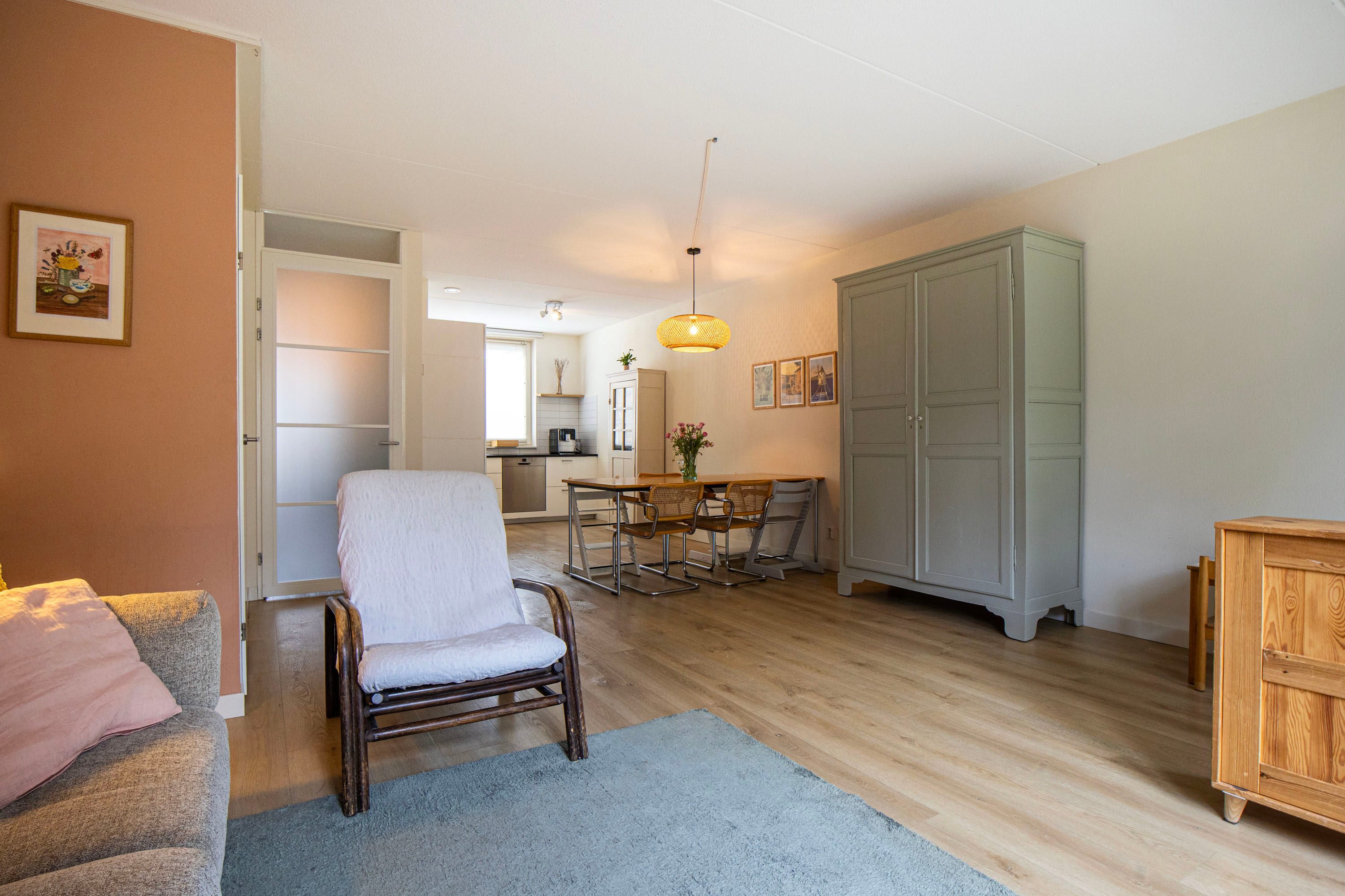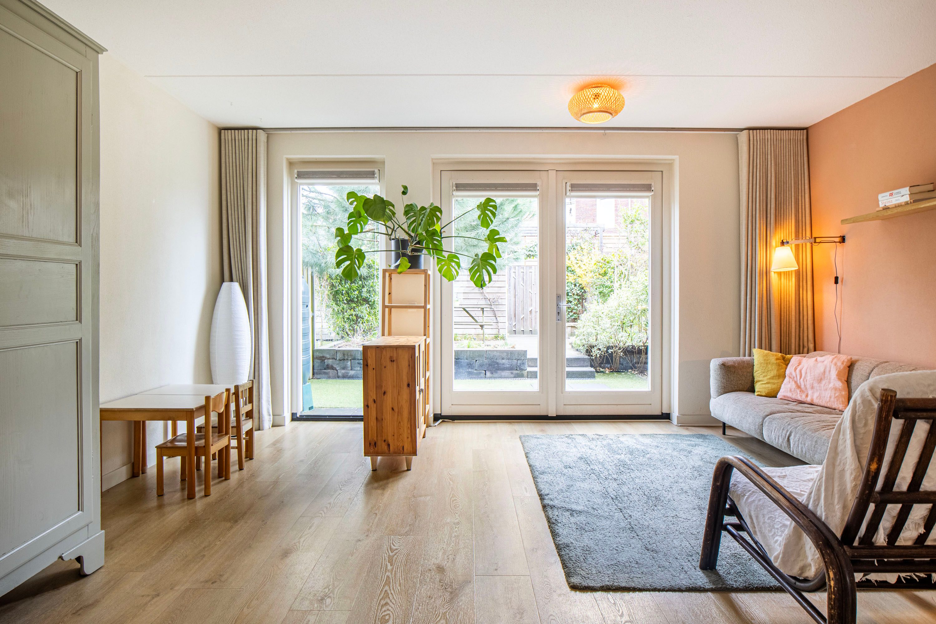 De leefruimte is direct een fijne binnenkomer: een lichte en open woonkamer met voldoende ruimte voor zowel een comfortabele zithoek als een gezellige eethoek. De openslaande deuren zorgen voor een prettige verbinding met de tuin en laten veel daglicht binnen.