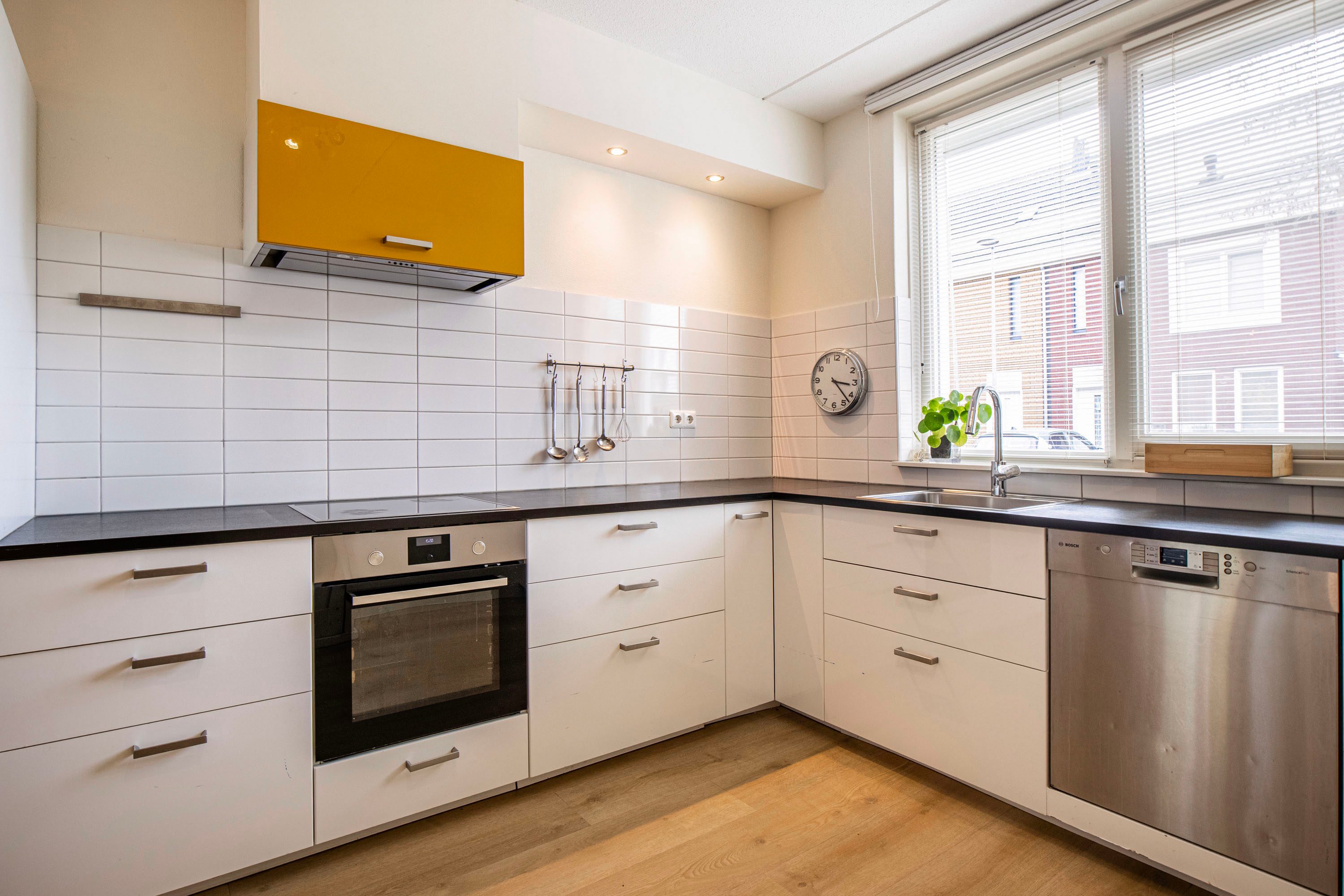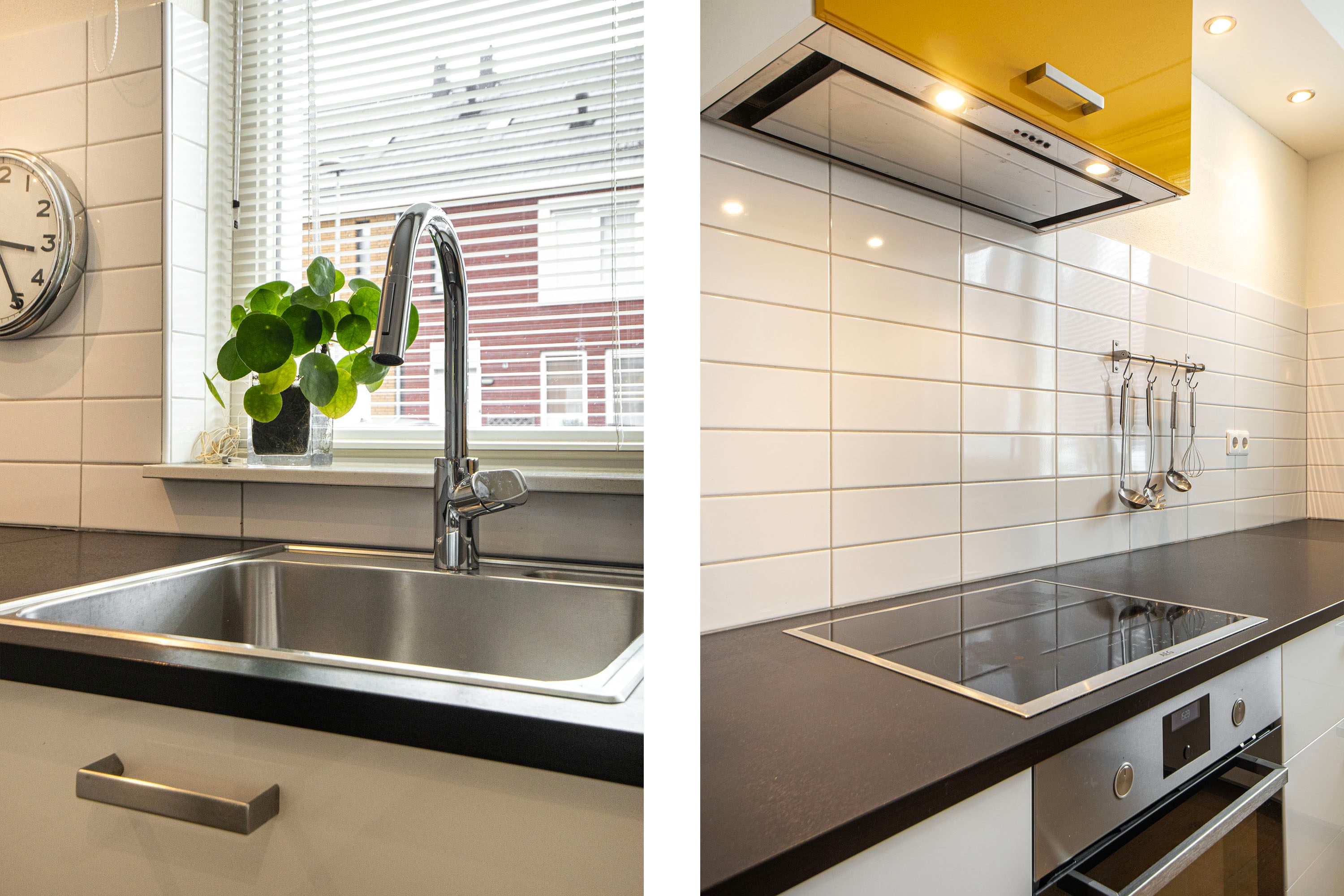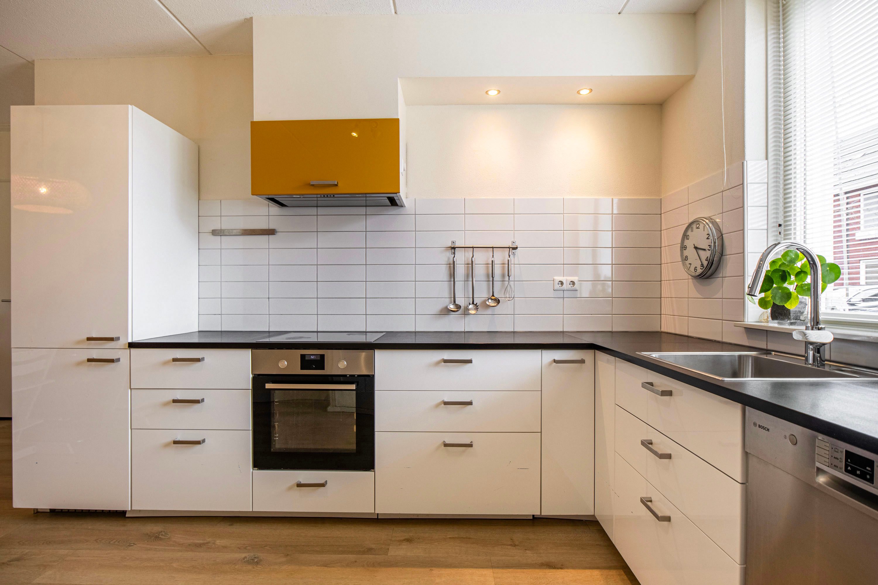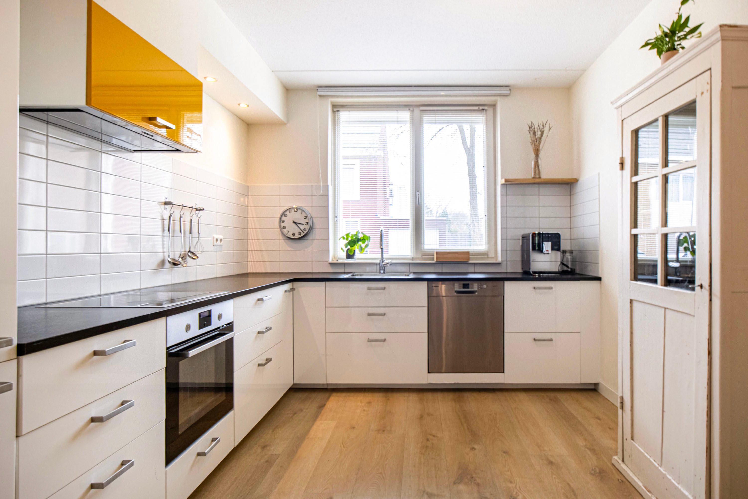 De open keuken in L-opstelling is praktisch ingericht en voorzien van diverse inbouwapparatuur, waaronder een kookplaat, afzuigkap, oven, koel-vriescombinatie en vaatwasser. Dankzij de open indeling blijf je altijd in contact met de rest van het gezin of je gasten.