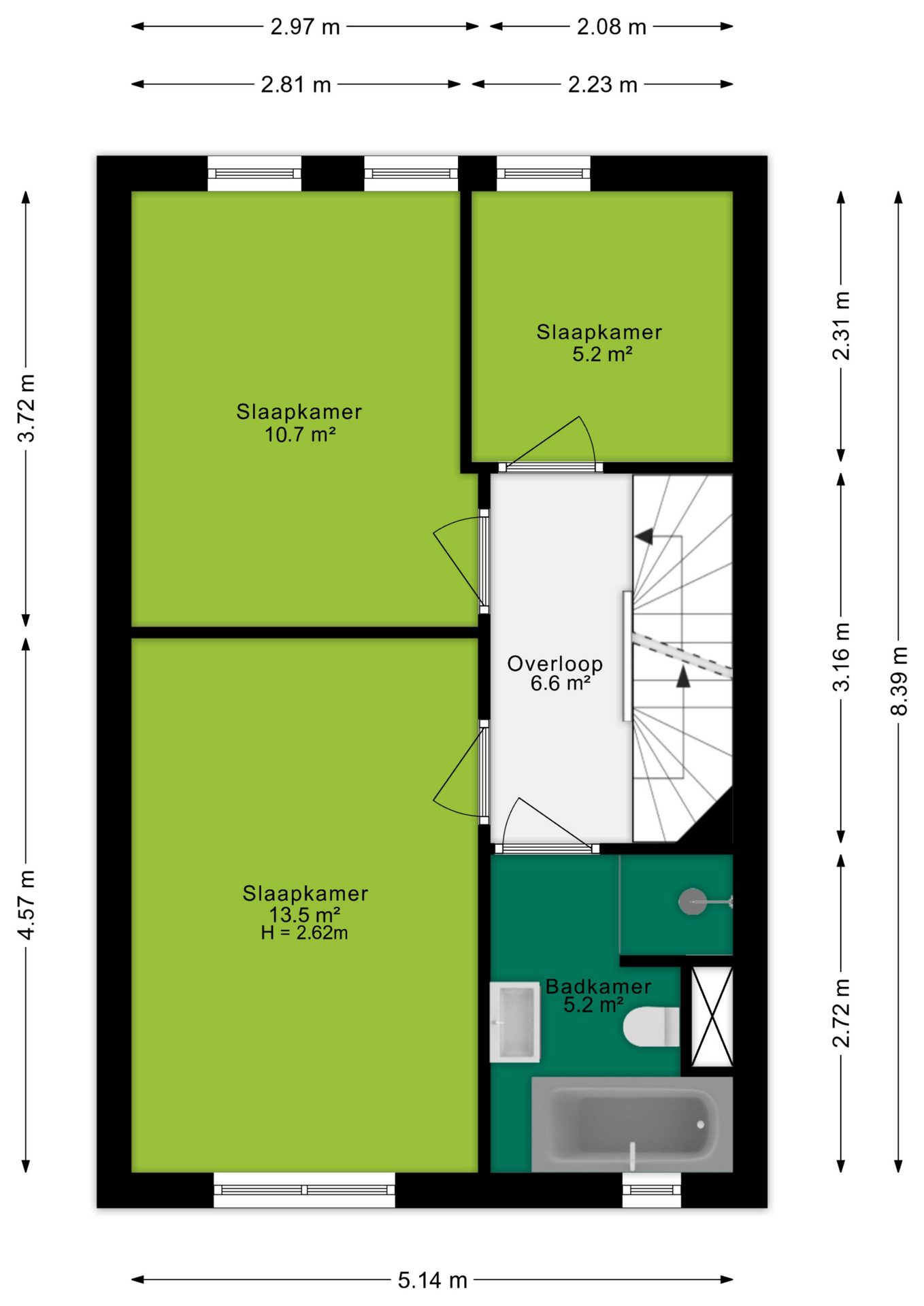 Op de eerste verdieping bevinden zich drie slaapkamers van circa 14 m², 11 m² en 5 m². De kamers zijn licht en praktisch in te delen en kunnen flexibel worden gebruikt als slaap-, werk- of hobbyruimte.