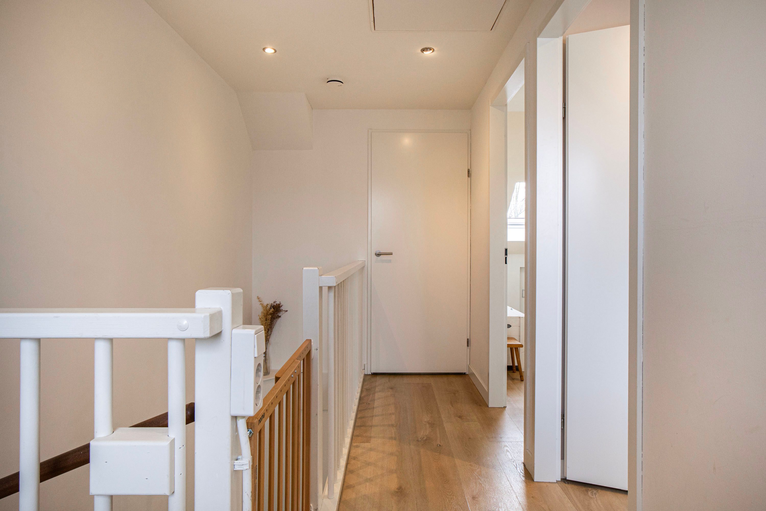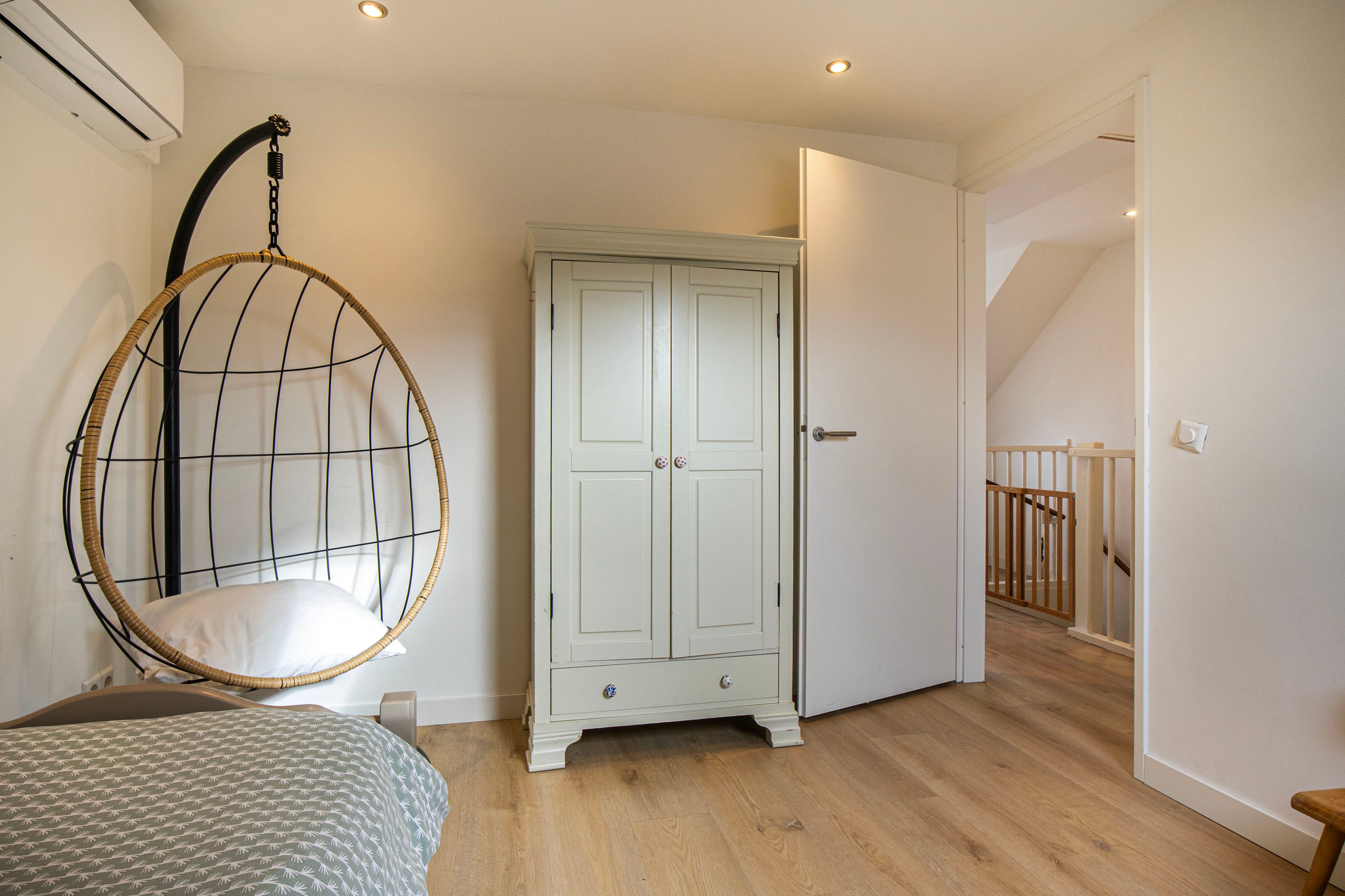 Op de overloop bevindt zich een praktische wasruimte met de cv-ketel, de zonneboiler, een aansluiting voor de wasmachine en en ruimte voor een droger. Daarnaast is er verrassend veel bergruimte aanwezig achter de knieschotten en op de vliering.