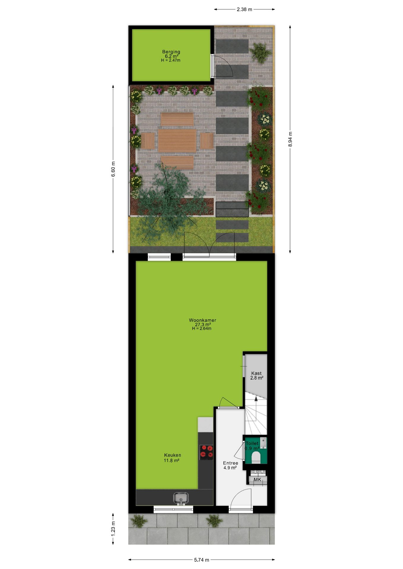 Daarnaast is er een handige trapkast aanwezig voor extra bergruimte. De gehele begane grond is voorzien van vloerverwarming, wat zorgt voor extra comfort.