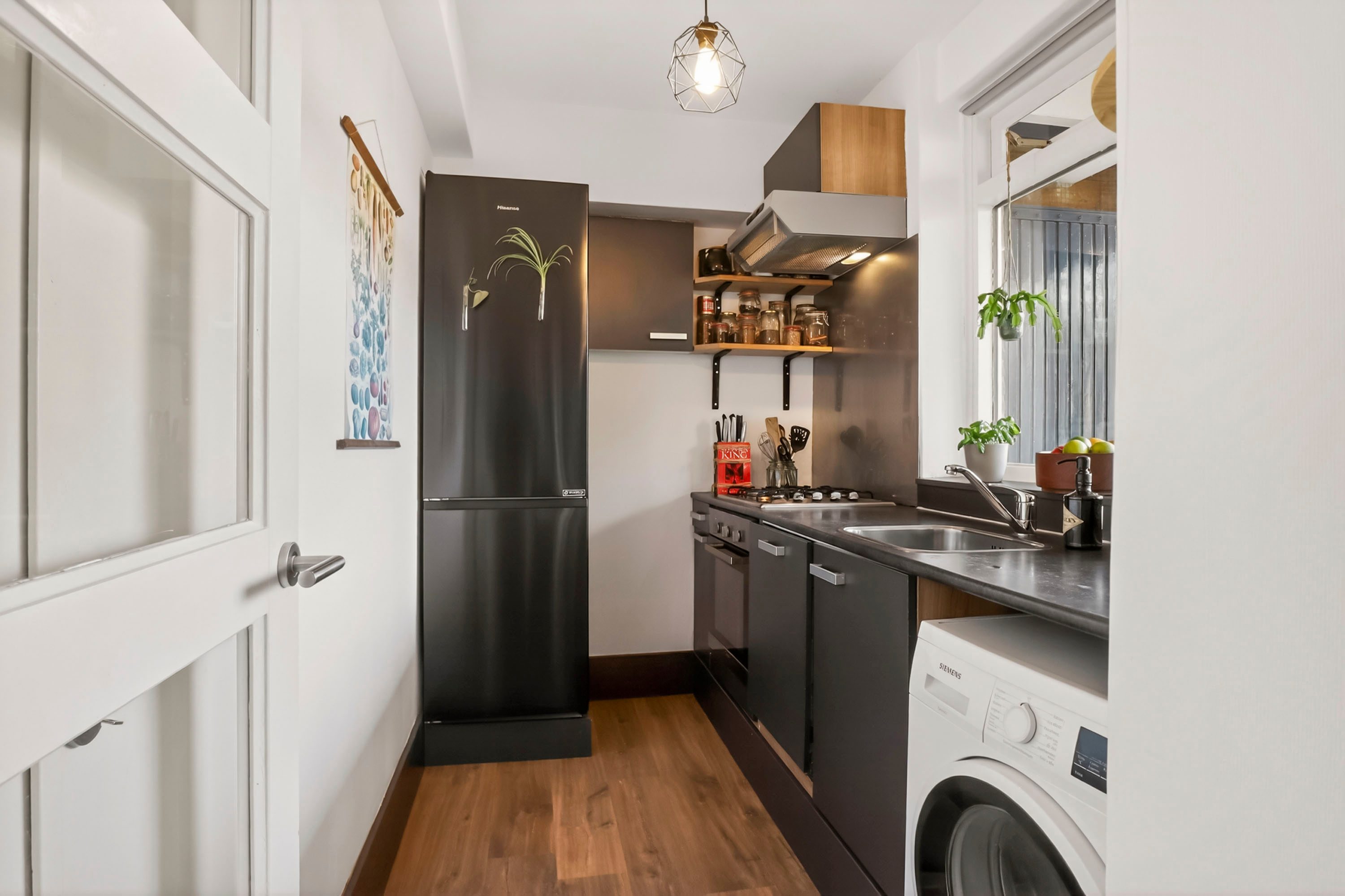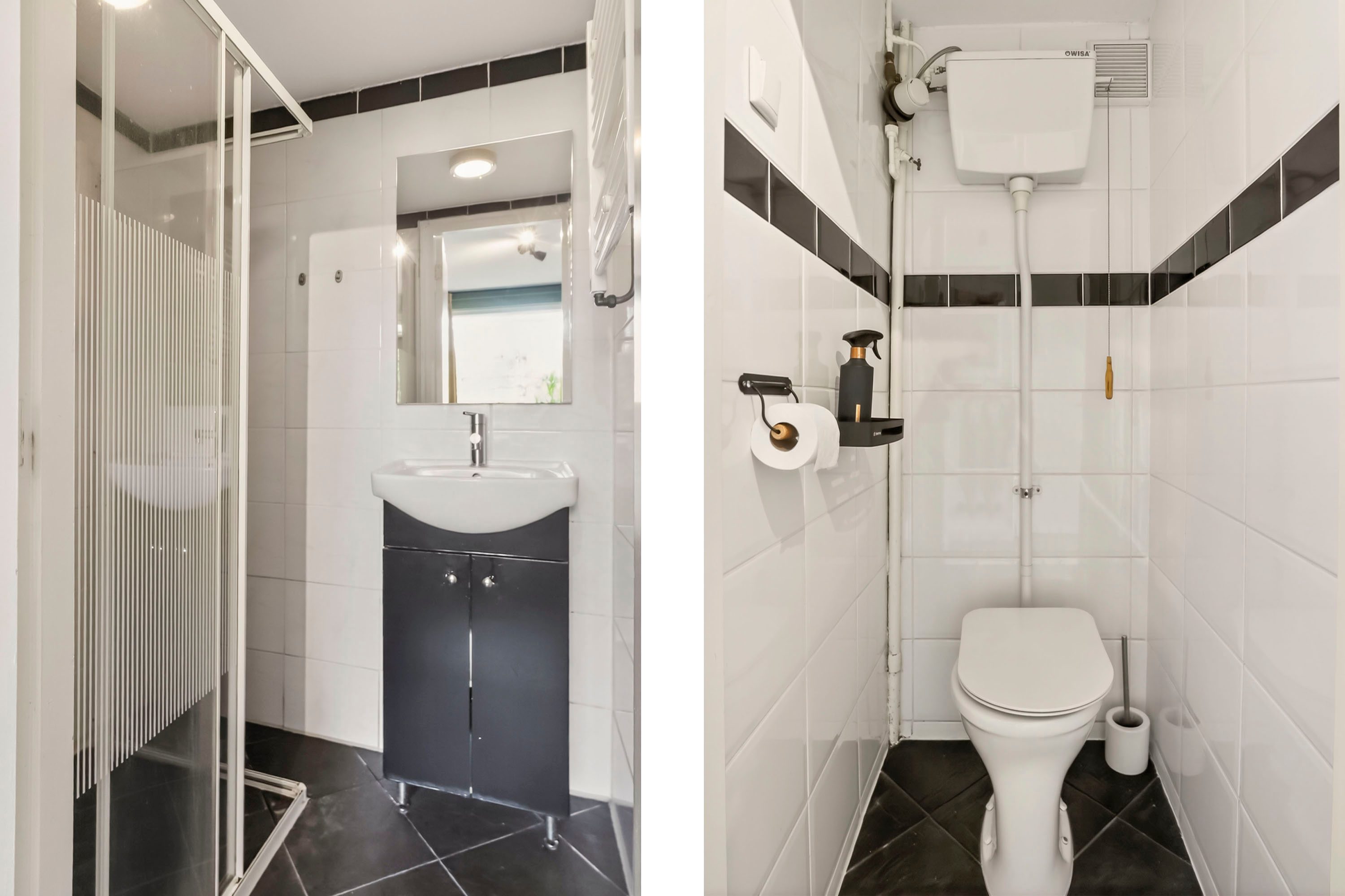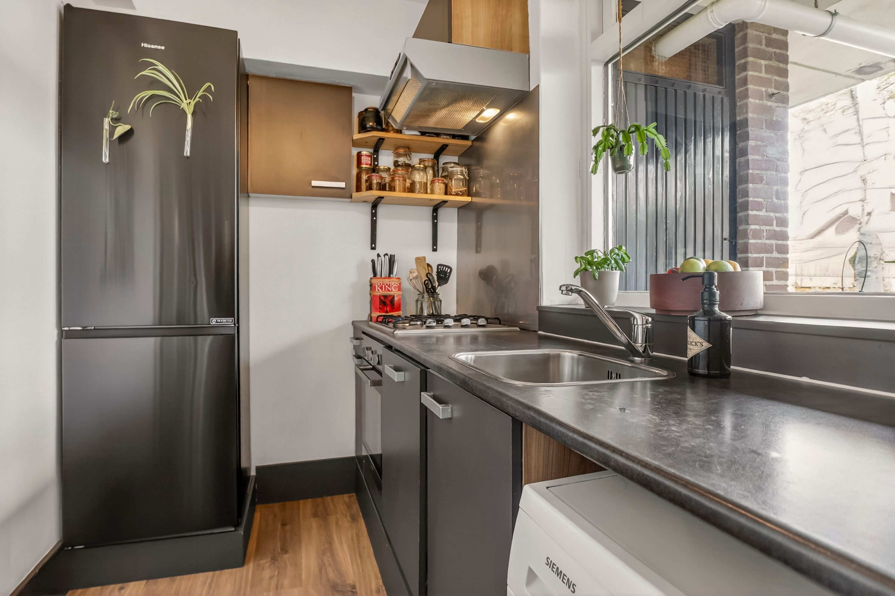 De dichte keuken (ca. 6 m²) is in 2018 vernieuwd en strak uitgevoerd met een gasfornuis, afzuigkap, oven en vaatwasser. Hier bevindt zich ook de praktische aansluiting voor de wasmachine. De badkamer, eveneens uit 2018, is slim ingedeeld met een moderne inloopdouche en wastafel. Het toilet is separaat gesitueerd, wat extra privacy biedt voor jou en je gasten.