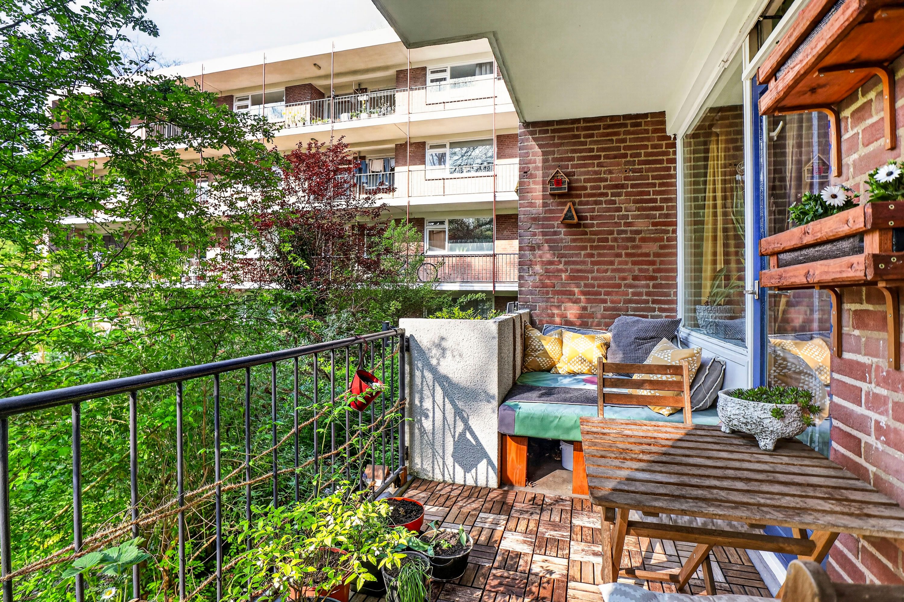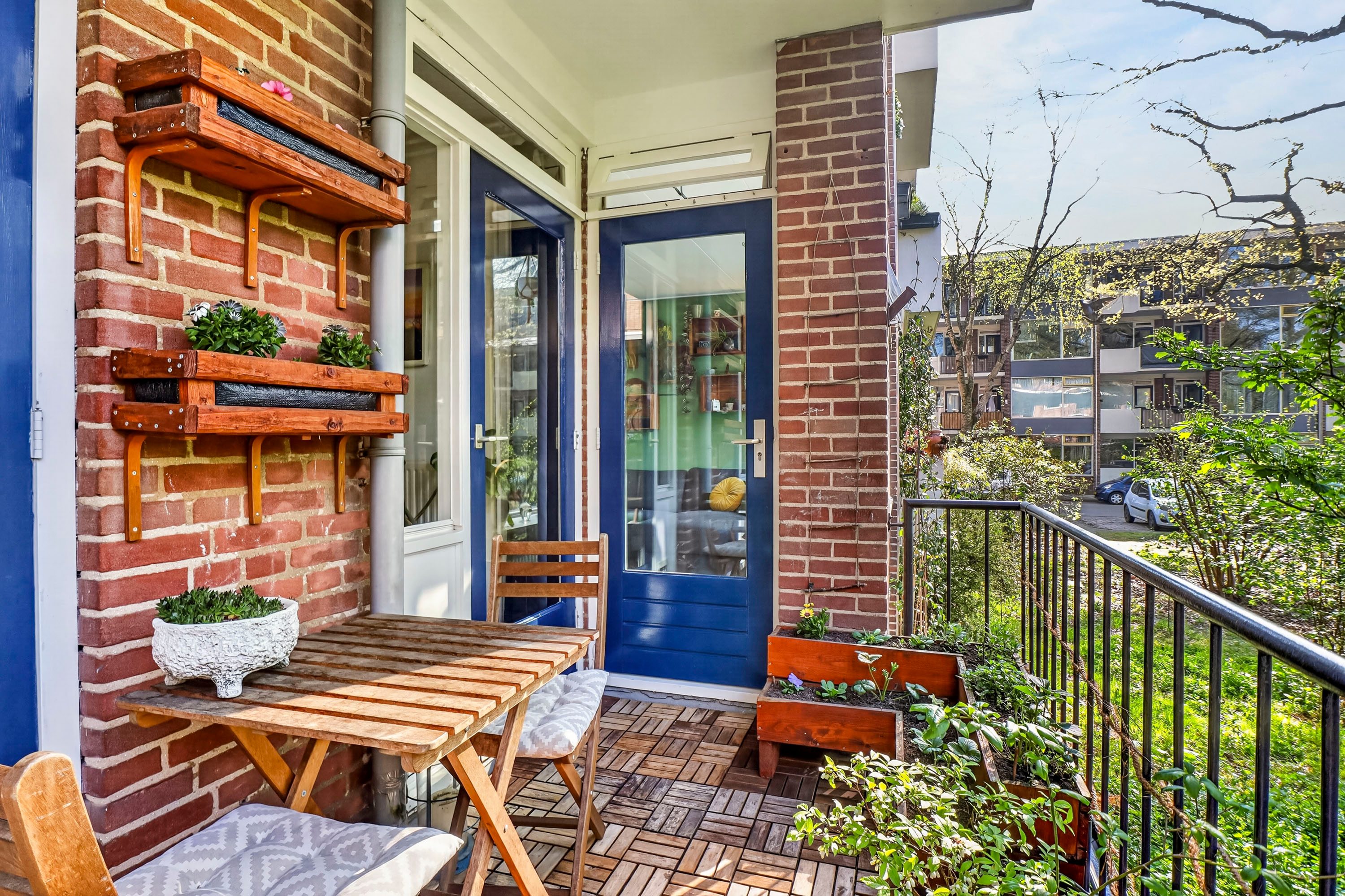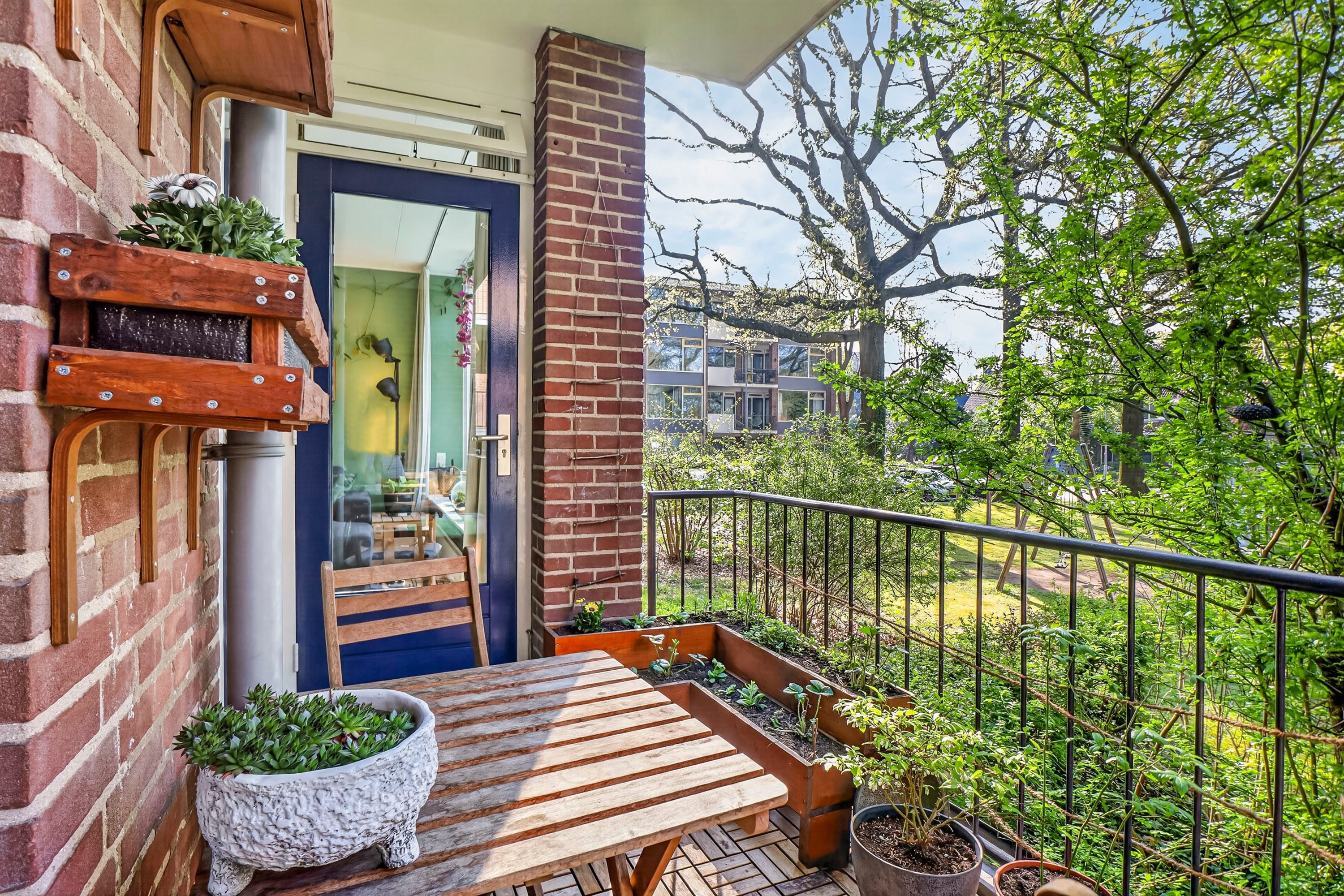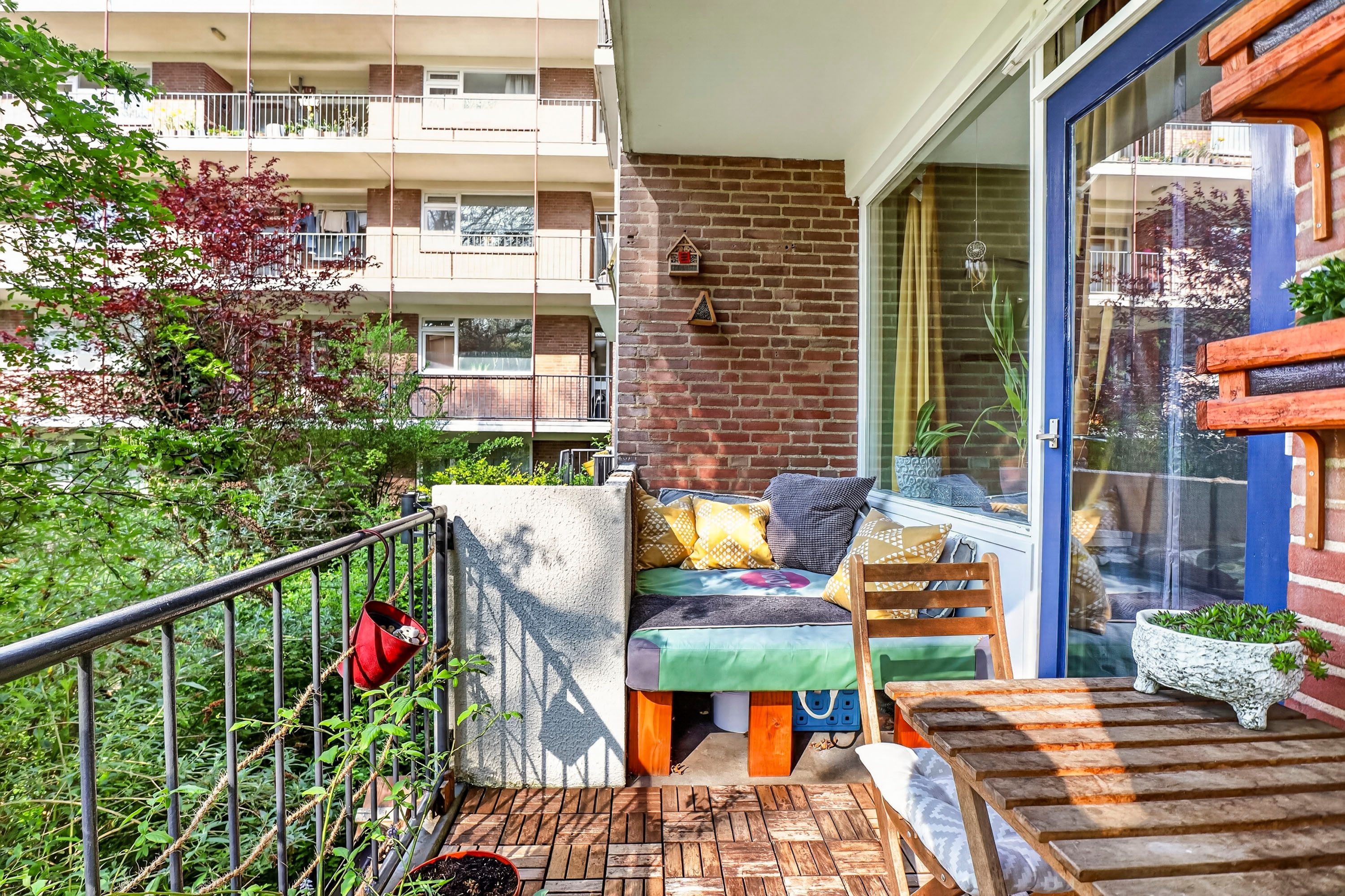 Het balkon van circa 7 m² is gelegen op het zuiden. Hier geniet je van 's ochtends vroeg tot 's avonds laat van de zon. Het is een heerlijke plek voor een kop koffie in de buitenlucht, met uitzicht op het vele groen dat de wijk rijk is.