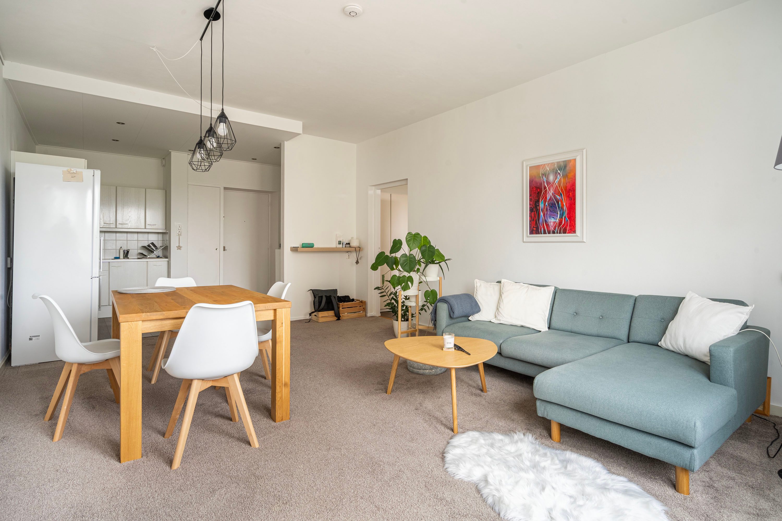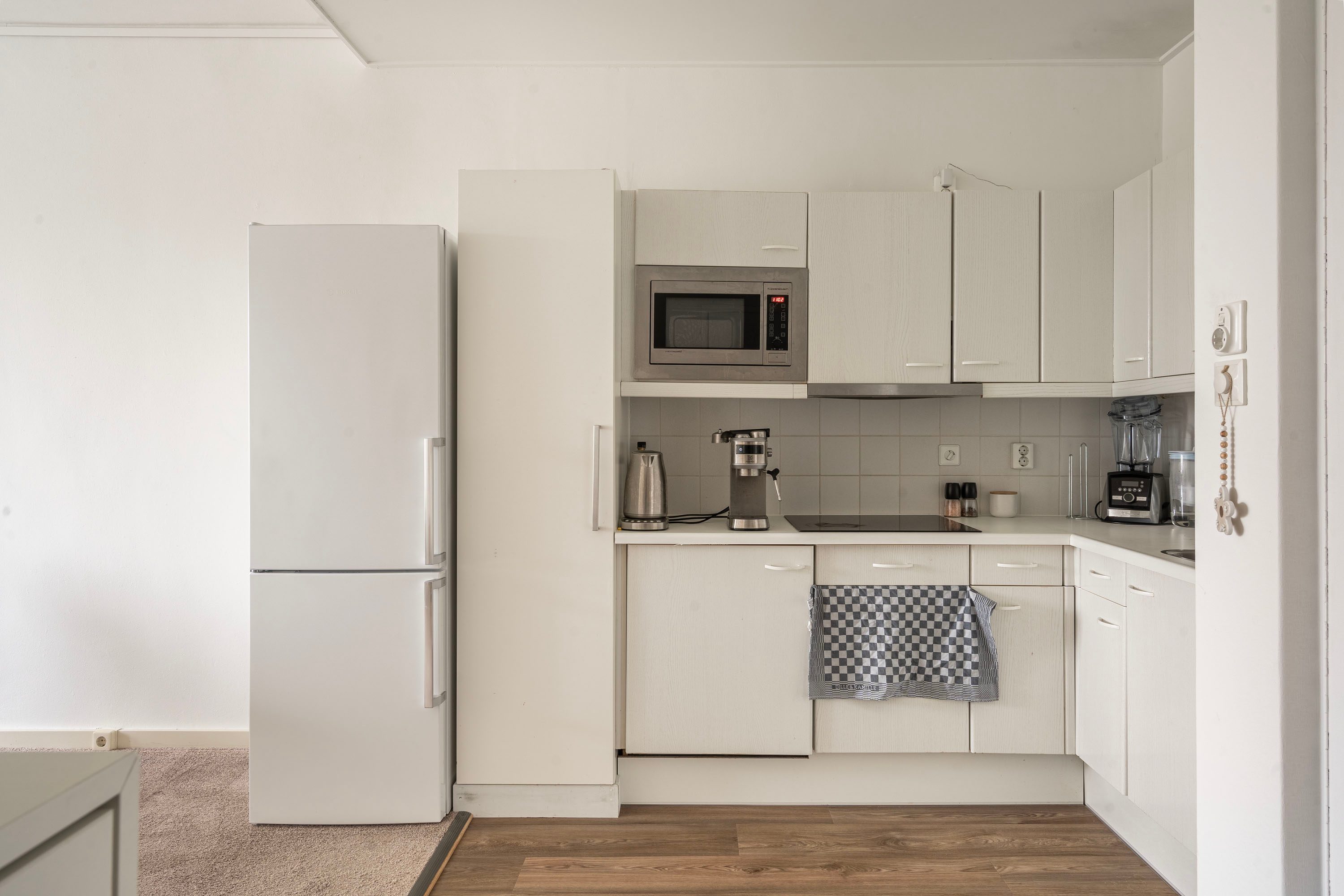 - Open keuken met een hoekkeuken voorzien van inductiekookplaat, vaatwasser, afzuigkap, koel-/vrieskast.