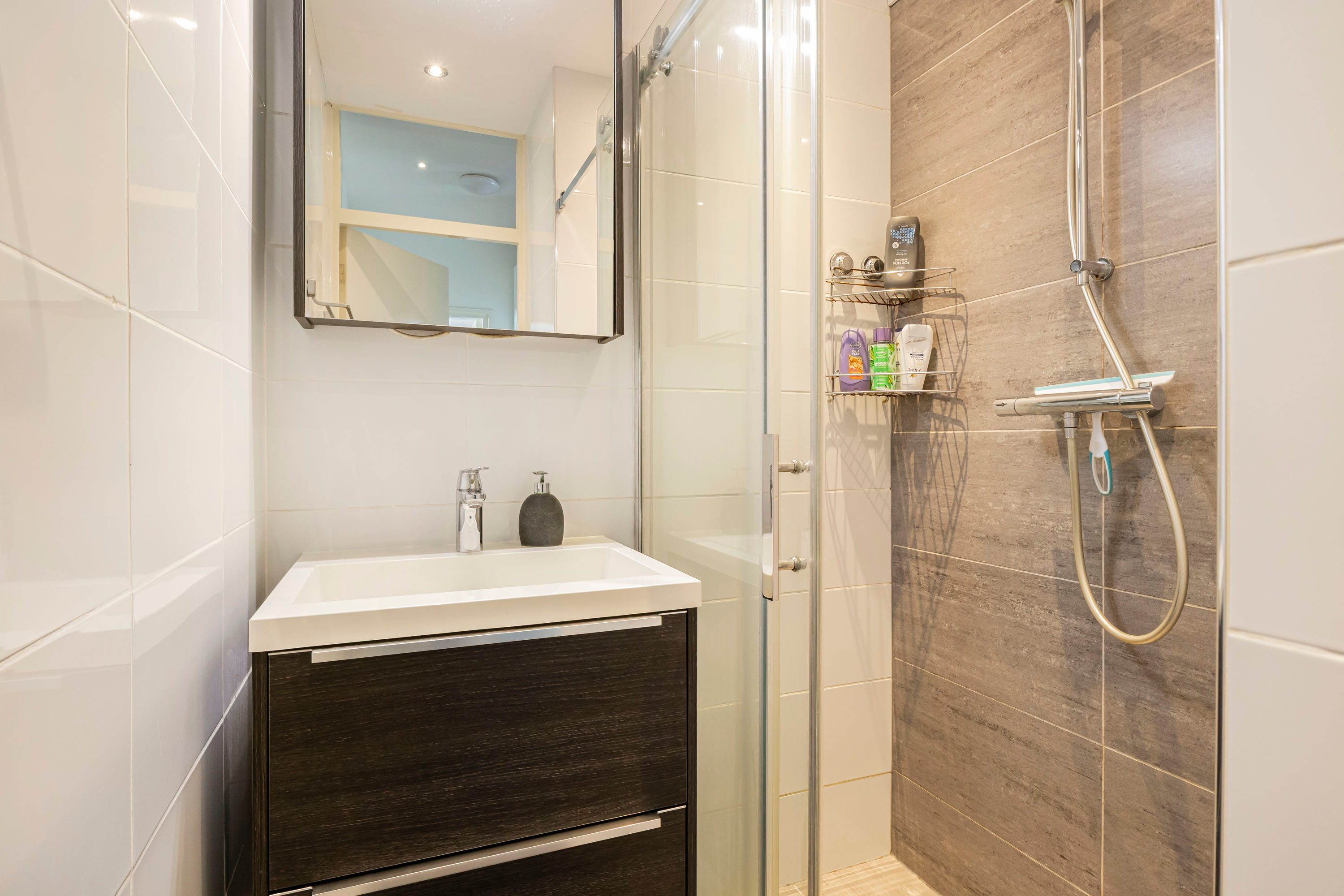 De slaapkamers hebben een afmeting van ca. 10,5m² en 8m², zijn voorzien van een nette laminaatvloer, neutrale wanden en voldoende lichtinval. De badkamer is betegeld in een moderne kleurstelling en beschikt over een inloopdouche en wastafel met wastafelmeubel.