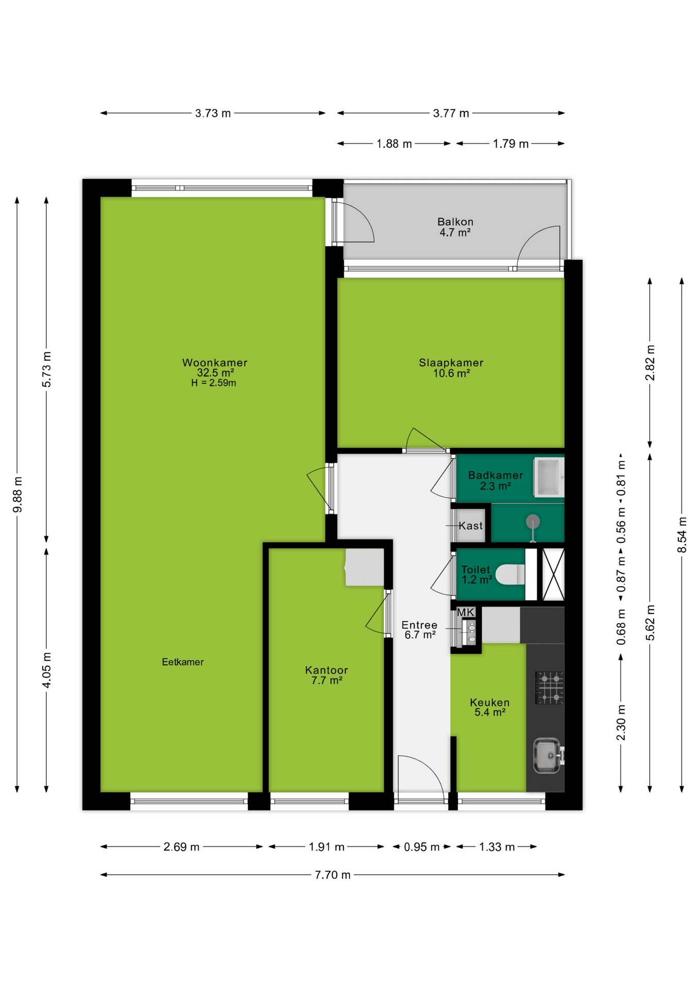 - 2 Volwaardige slaapkamers en een 3e (slaap)kamer is gemakkelijk te realiseren;