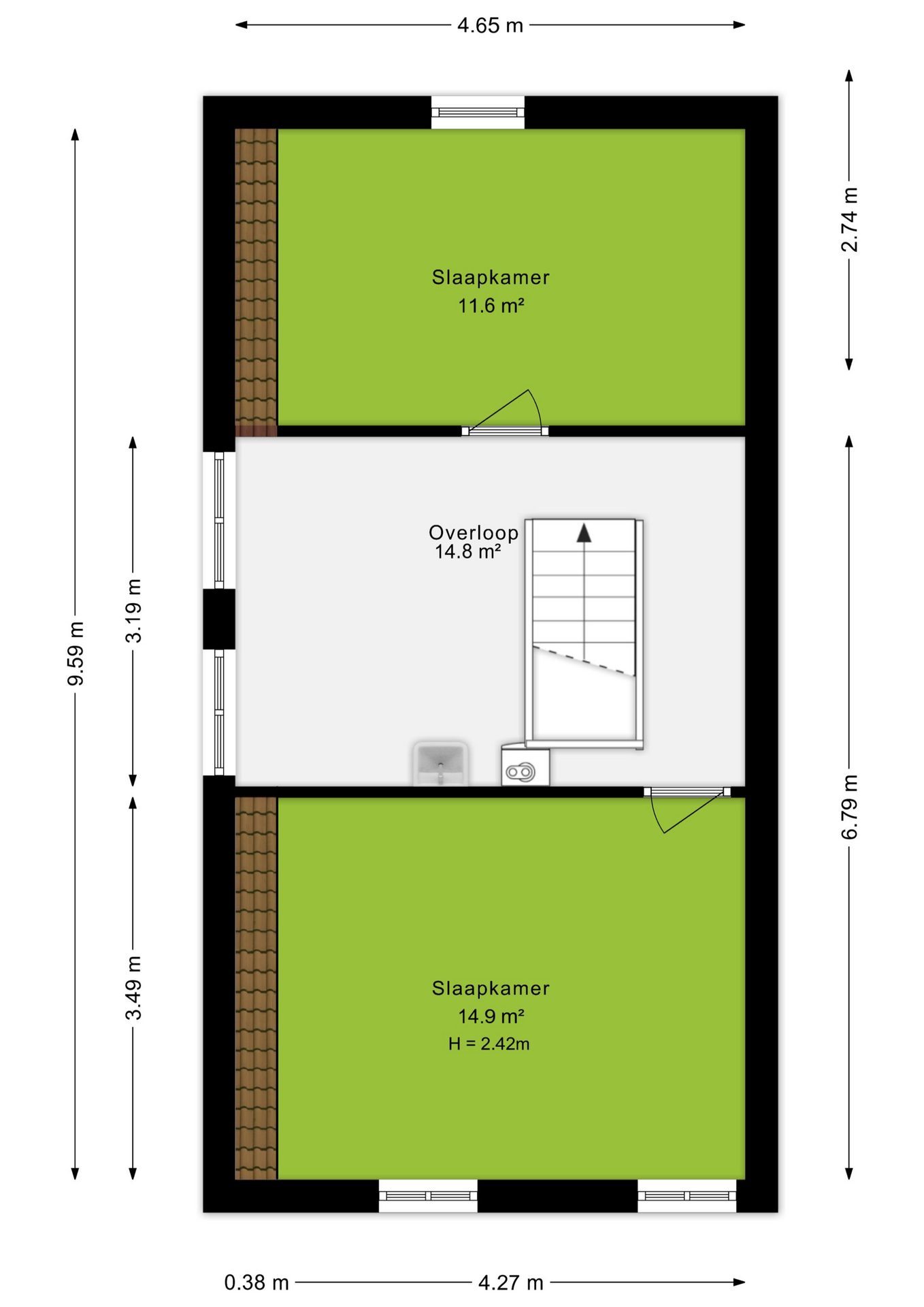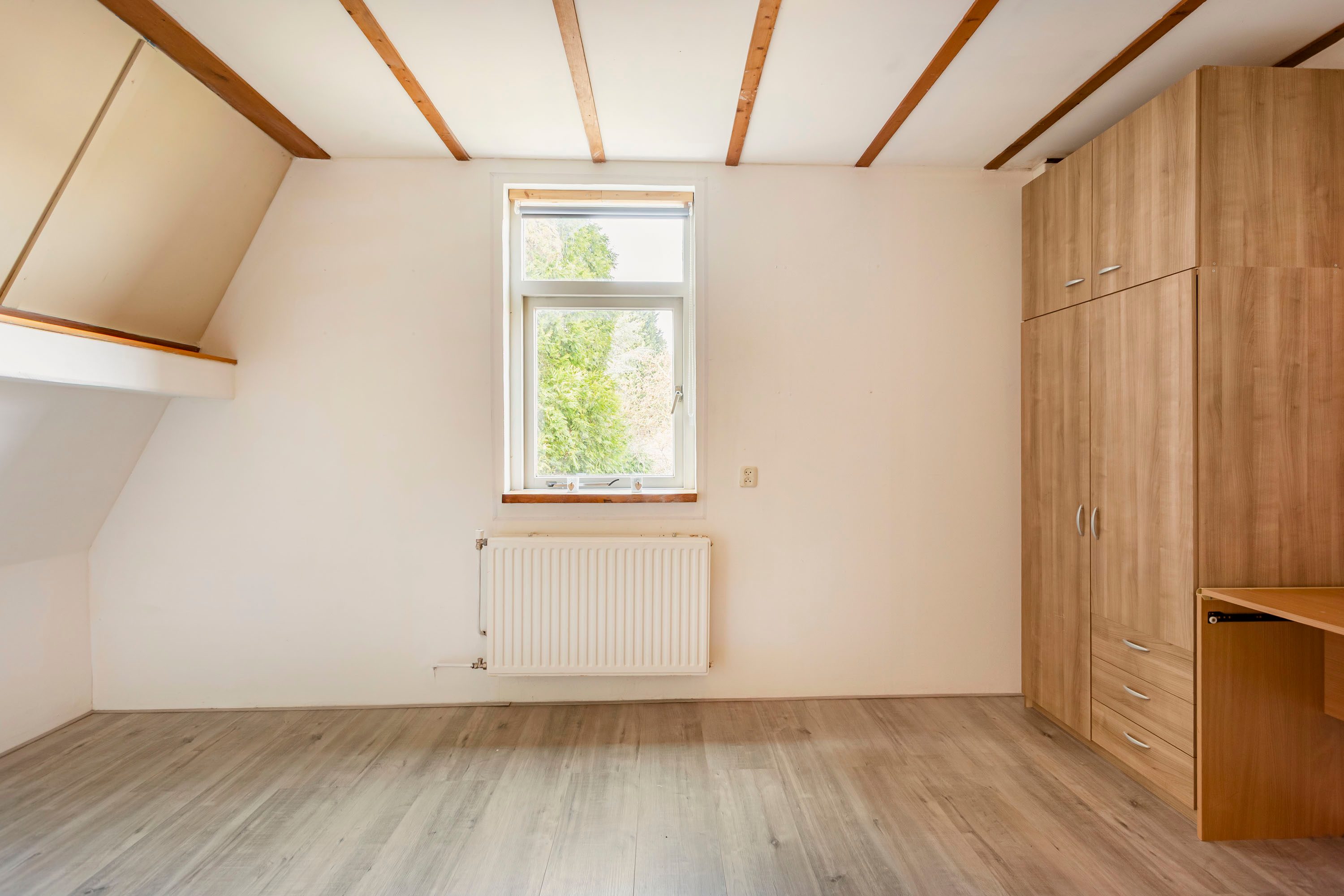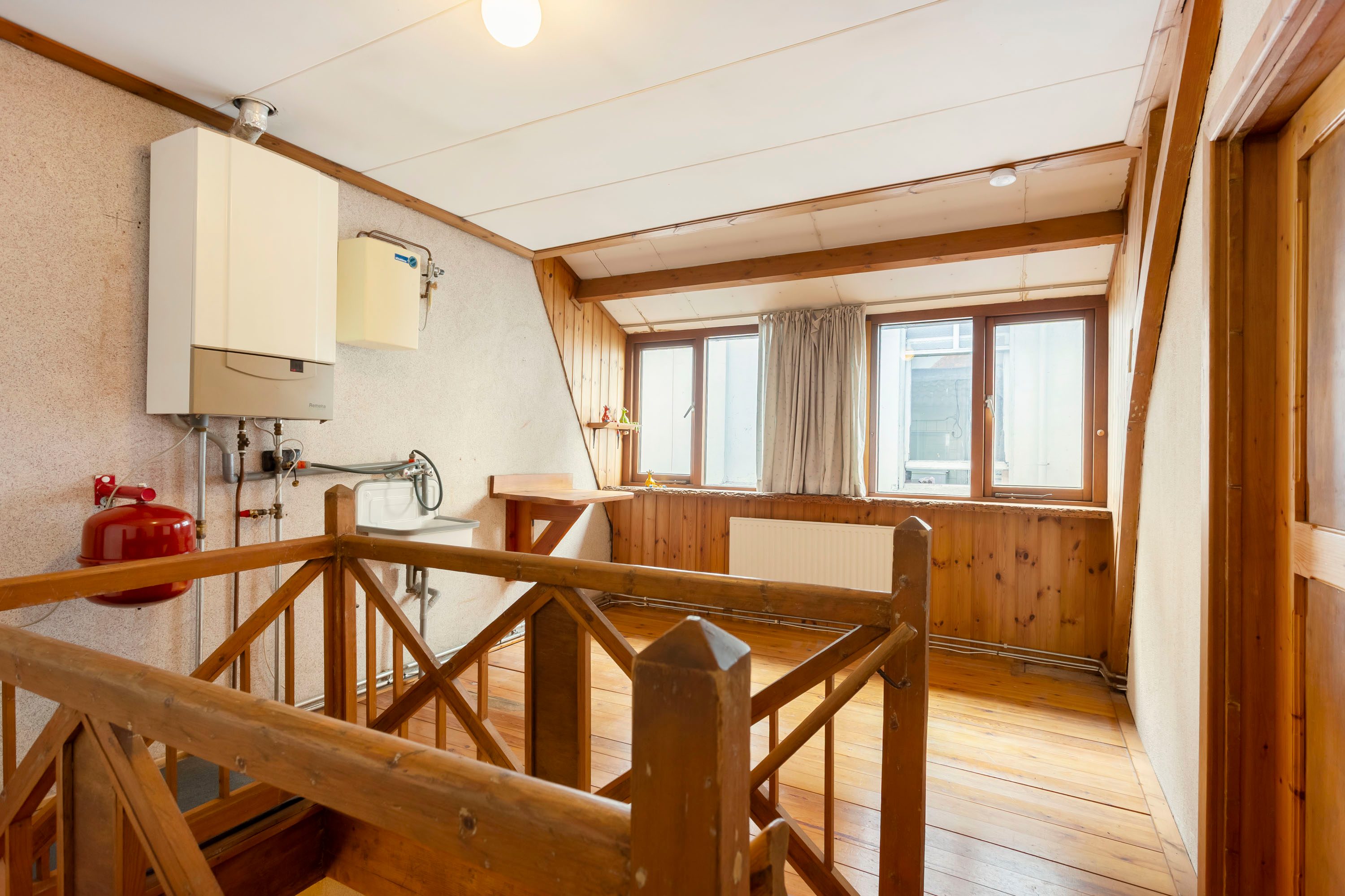 Op de eerste verdieping kom je uit op een ruime overloop die direct toegang geeft tot twee verrassend royale slaapkamers van circa 15 m² en 12 m². Ook is de c.v. ketel hier terug te vinden.