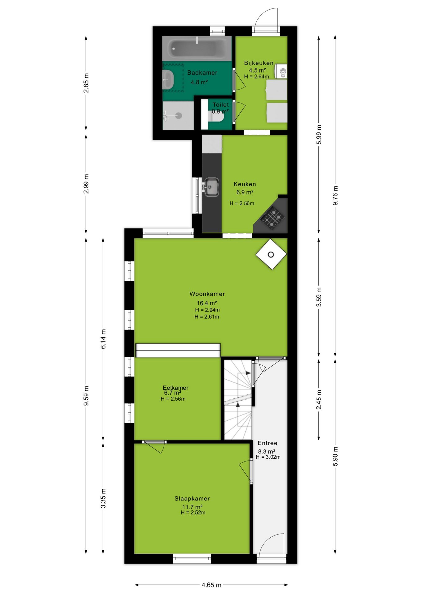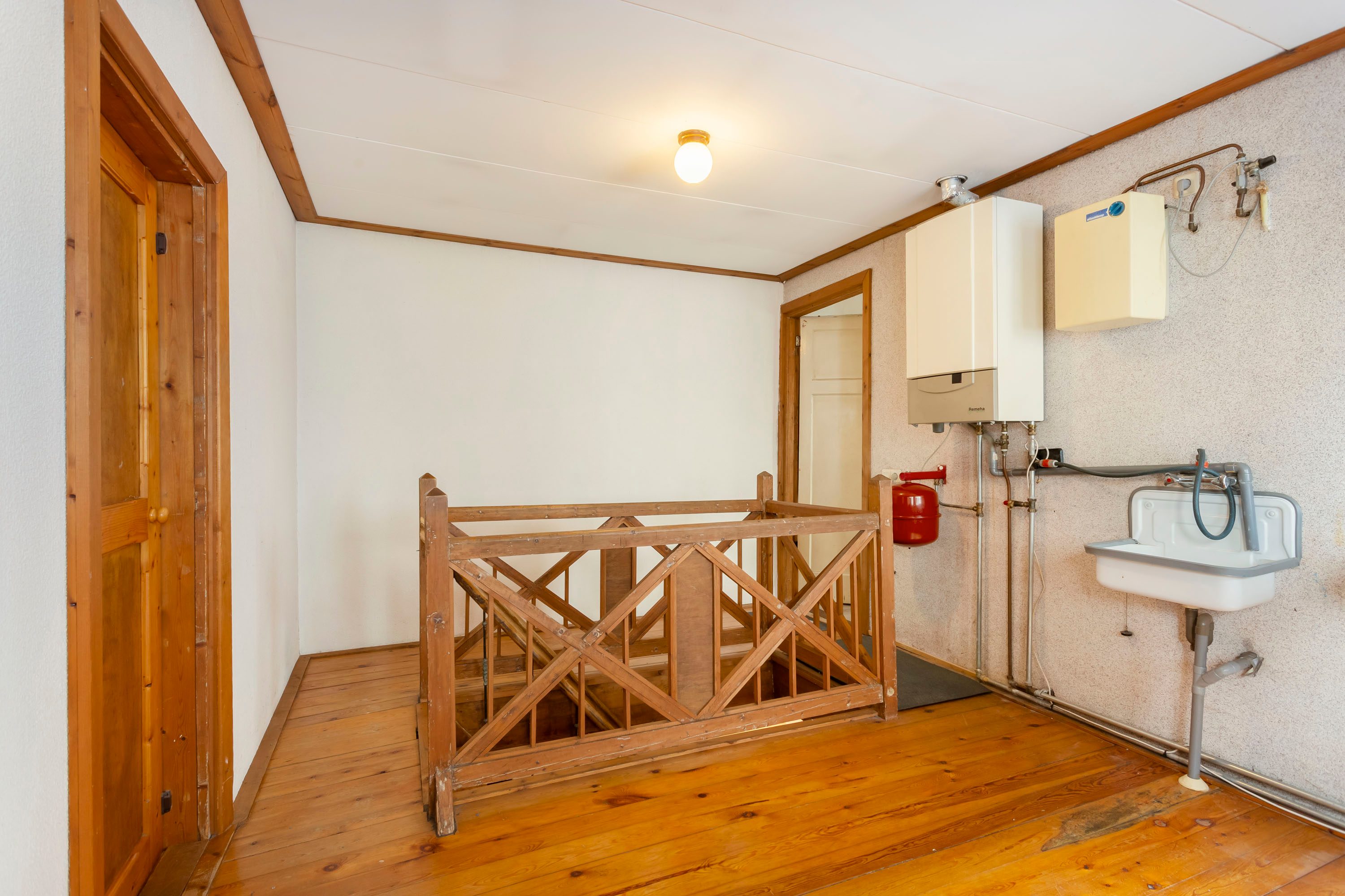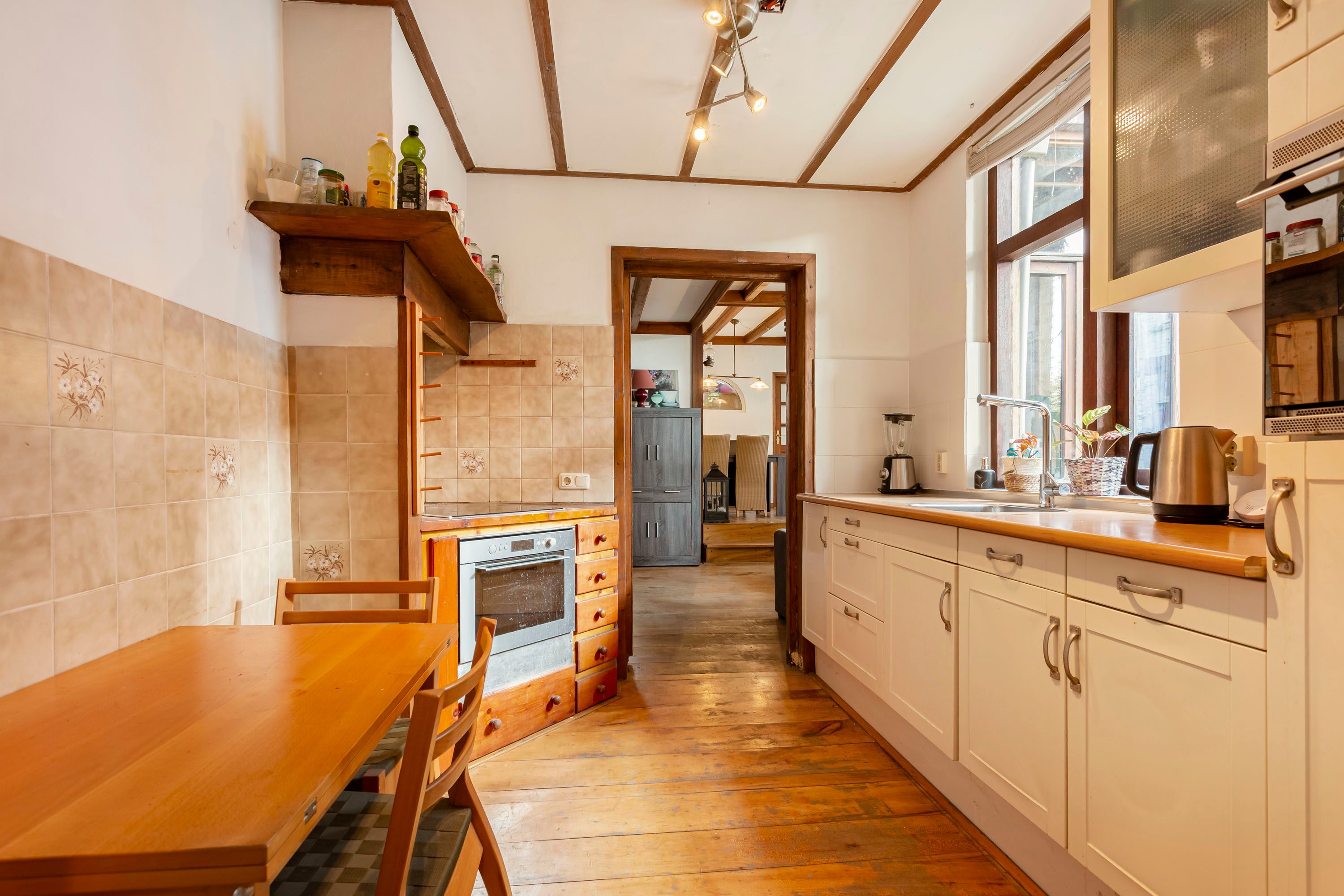 De begane grond biedt een klassieke indeling met een woonkamer en eetkamer die je volledig naar eigen wens kunt vormgeven. De keuken en bijkeuken sluiten hier praktisch op aan en bieden volop kansen om een moderne leefkeuken te realiseren.