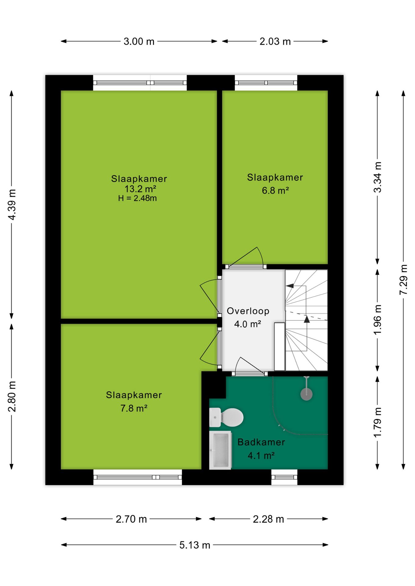 Op de eerste verdieping vind je drie goede slaapkamers. Het fijne hier is dat de muren recht omhoog lopen, waardoor je elke vierkante meter optimaal kunt benutten. De badkamer is praktisch ingericht met een douchehoek, tweede toilet en een wastafelmeubel.