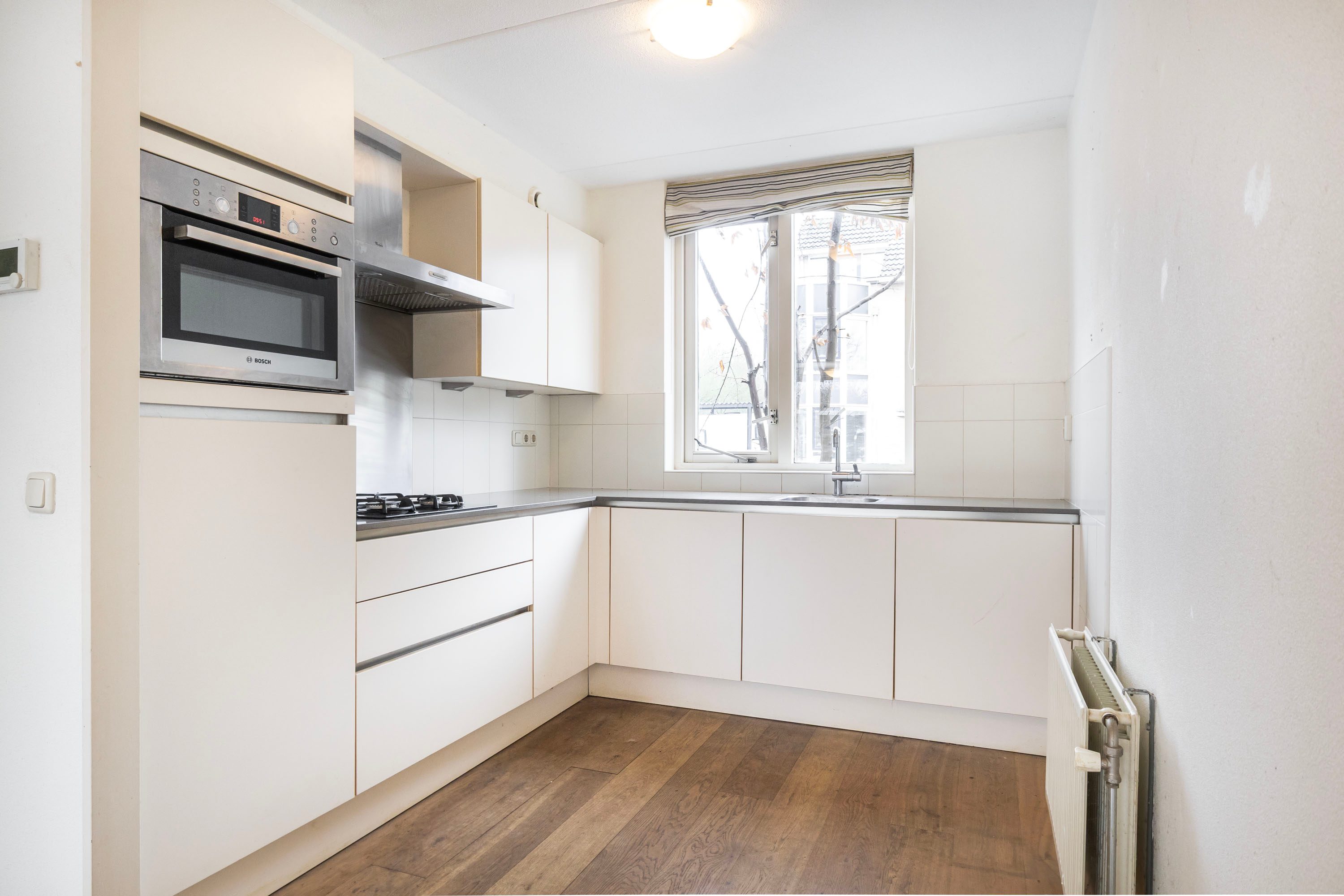 Via de hal (met handige garderoberuimte en toilet) kom je in de woonkamer. En wat voor één! Doordat de woning is uitgebouwd, heb je hier echt de ruimte. De eikenhouten vloer geeft direct warmte aan de kamer. Aan de voorkant vind je de open keuken uit 2011. Deze is van alle gemakken voorzien (denk aan een gasfornuis, vaatwasser en combi-oven), zodat je hier de lekkerste maaltijden op tafel tovert terwijl je in contact blijft met je gasten in de woonkamer.