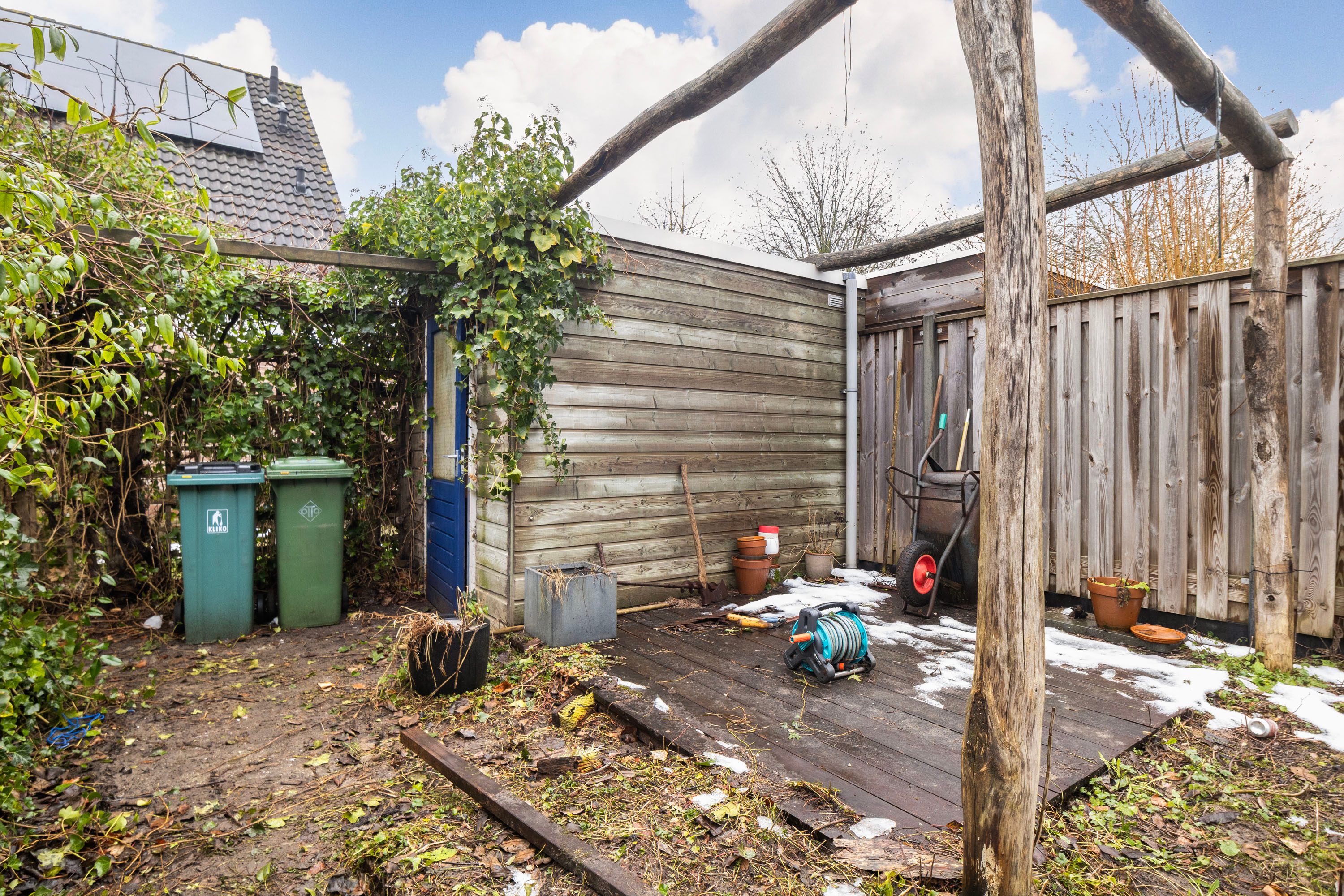De achtertuin, circa 50 m² ruim, ligt op het noorden, maar laat je daar niet door foppen: door de diepte van de tuin kun je hier de hele dag door een plekje in de zon vinden. Achterin staat een vrijstaande houten berging voor de fietsen en je tuingereedschap.