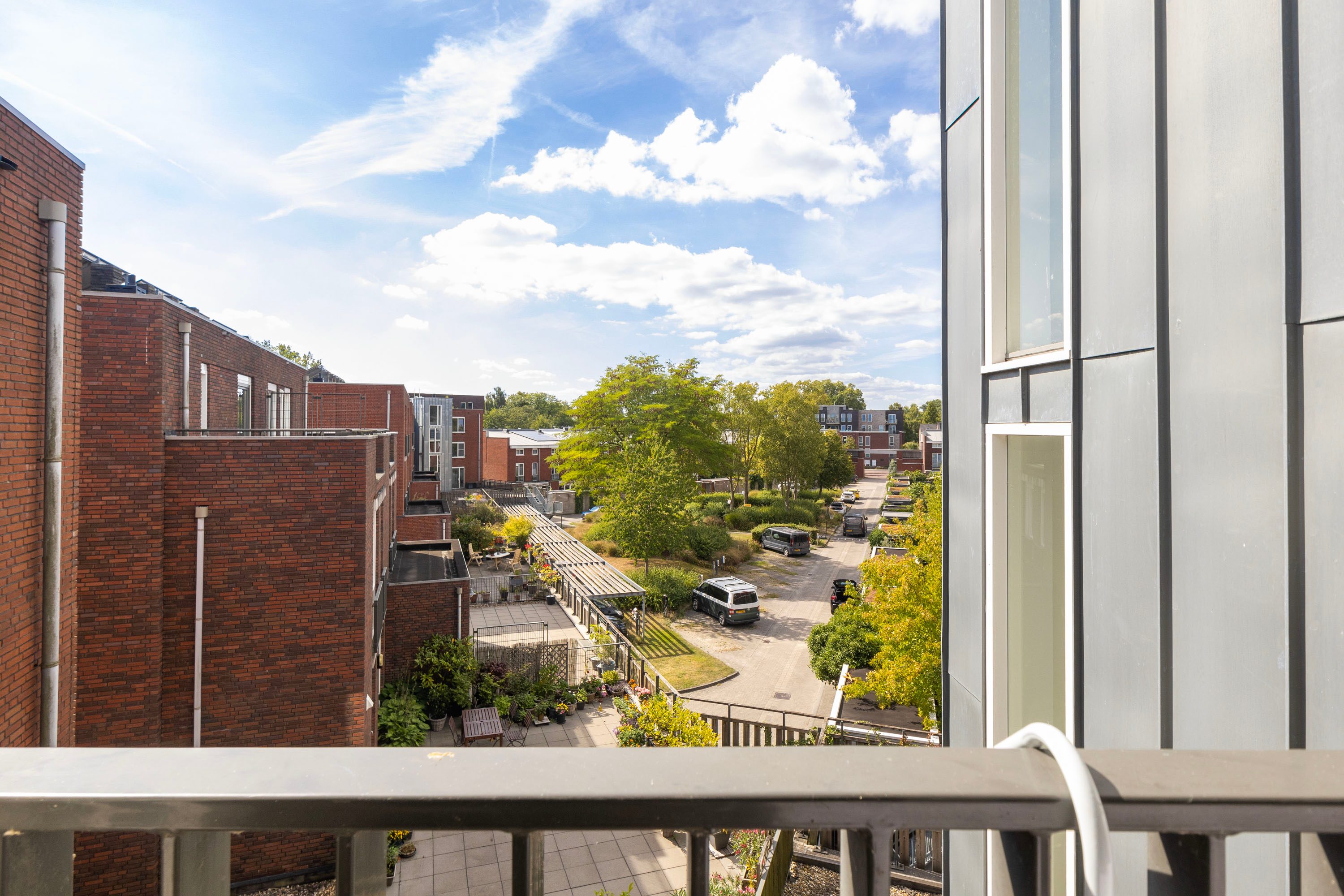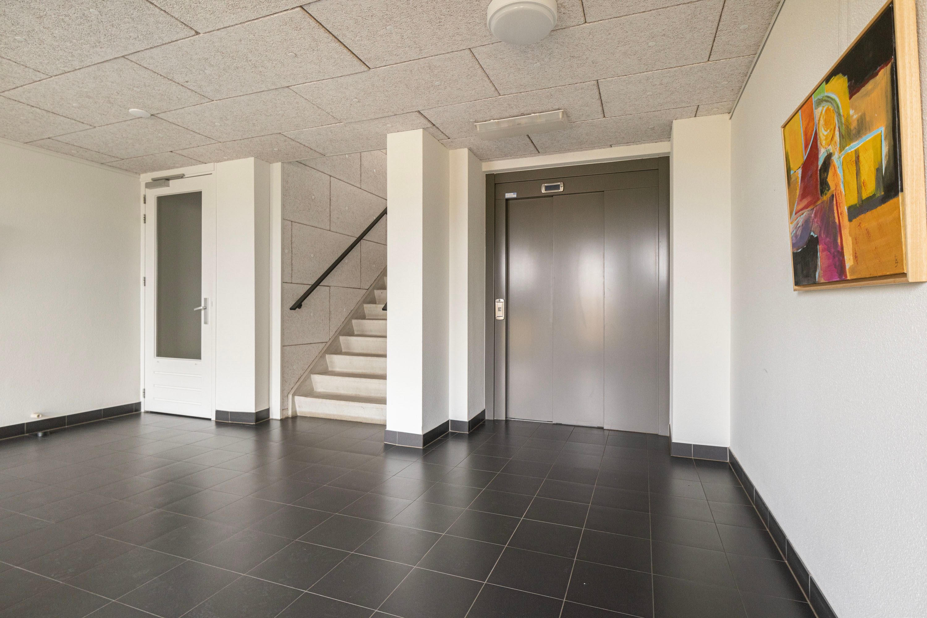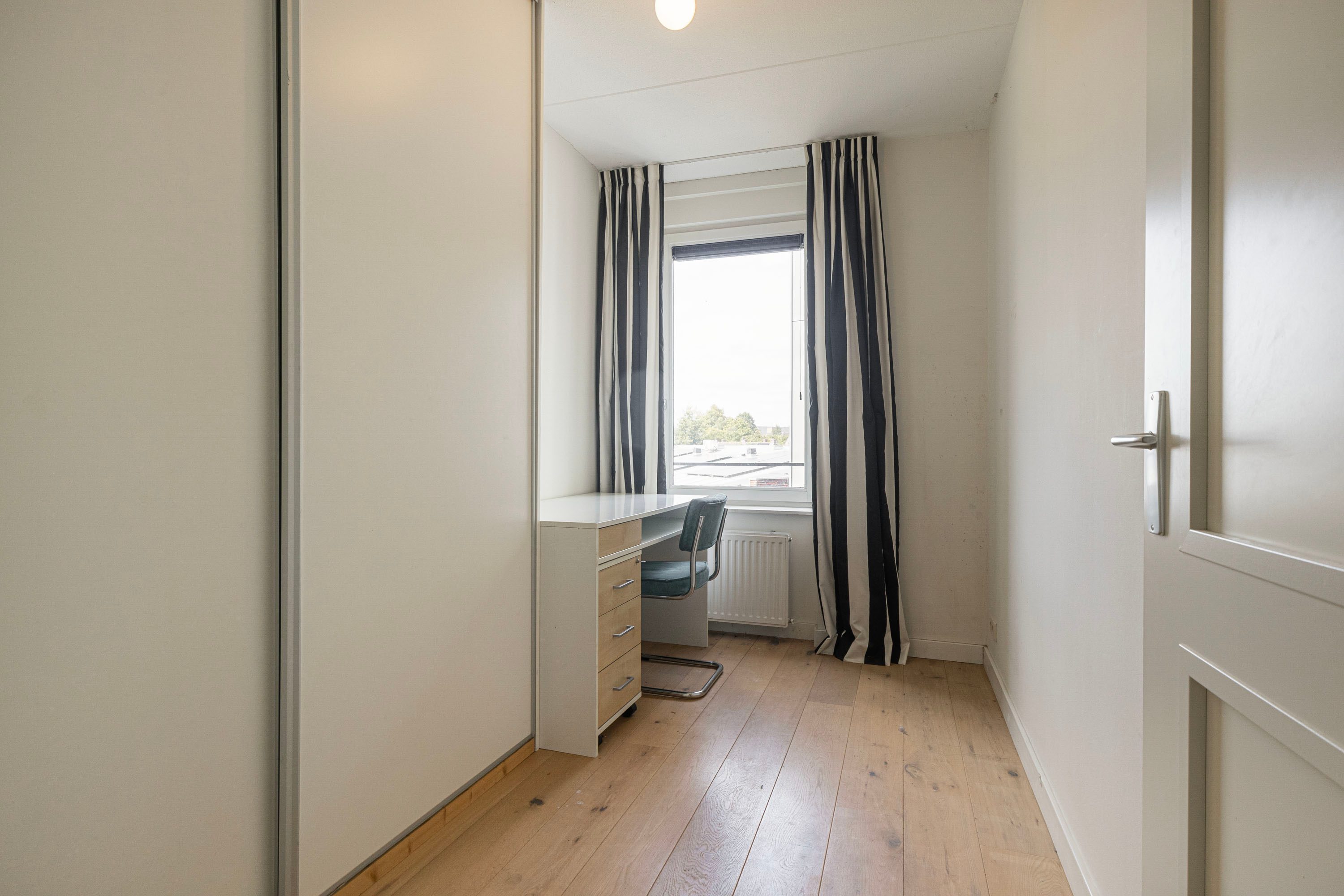 Het appartement bereik je via de lift of trappengang. Bij binnenkomst vind je de meterkast, garderobekast en het seperate toilet. De lichte woonkamer valt direct op door het vrije uitzicht en de open indeling, met voldoende ruimte voor verschillende zitjes. Vanuit hier stap je het balkon op, gelegen op het zuiden en voorzien van zonnescherm.