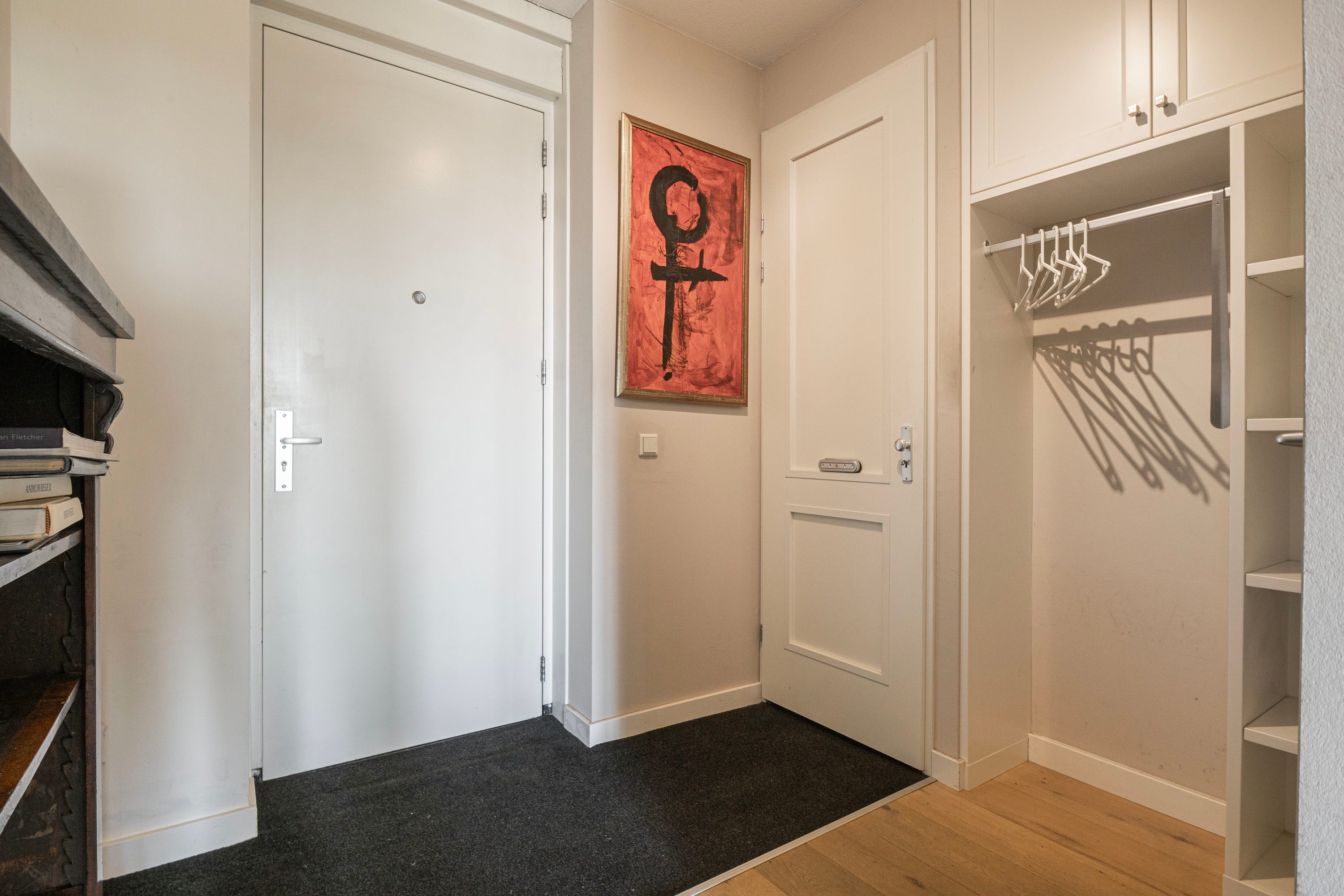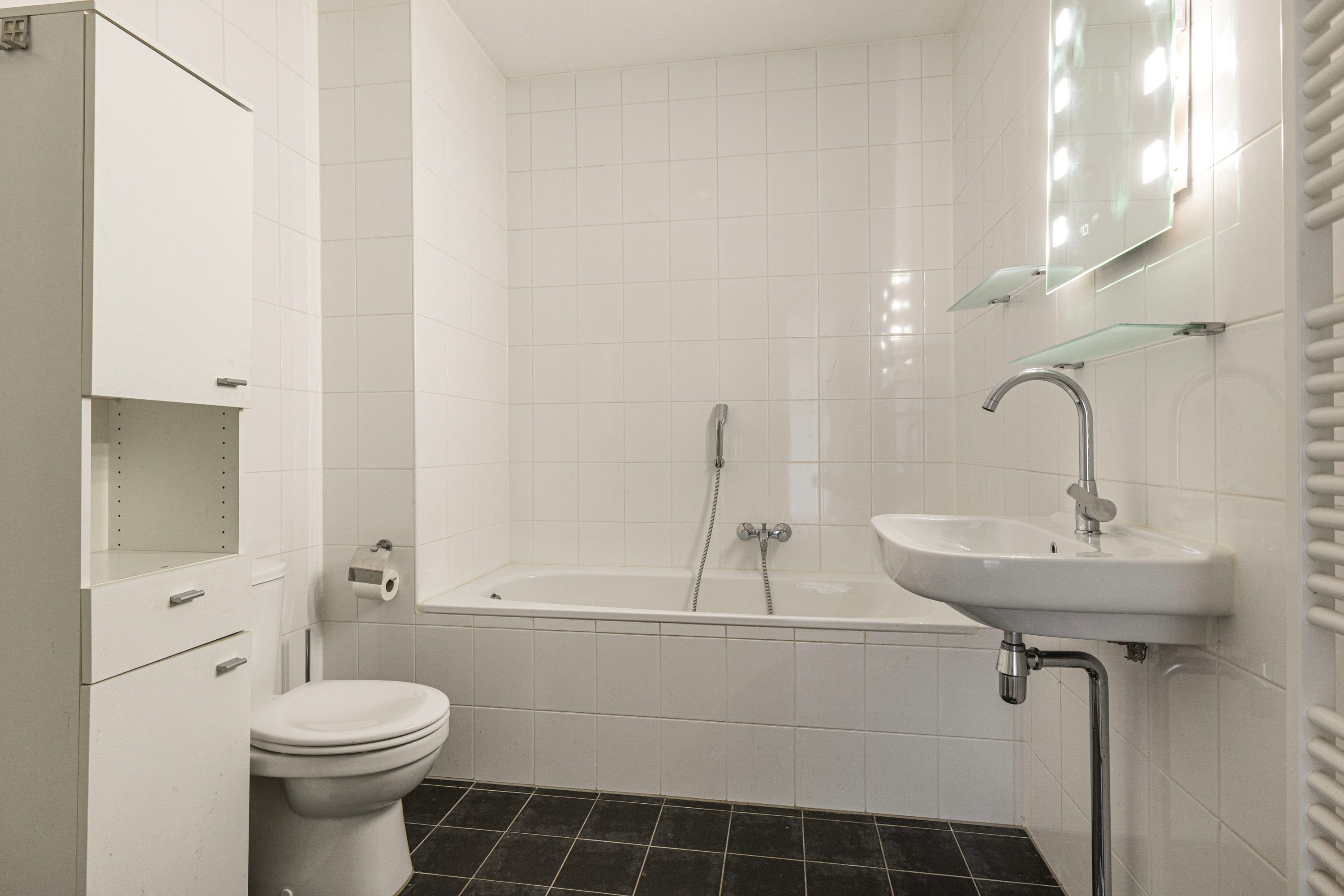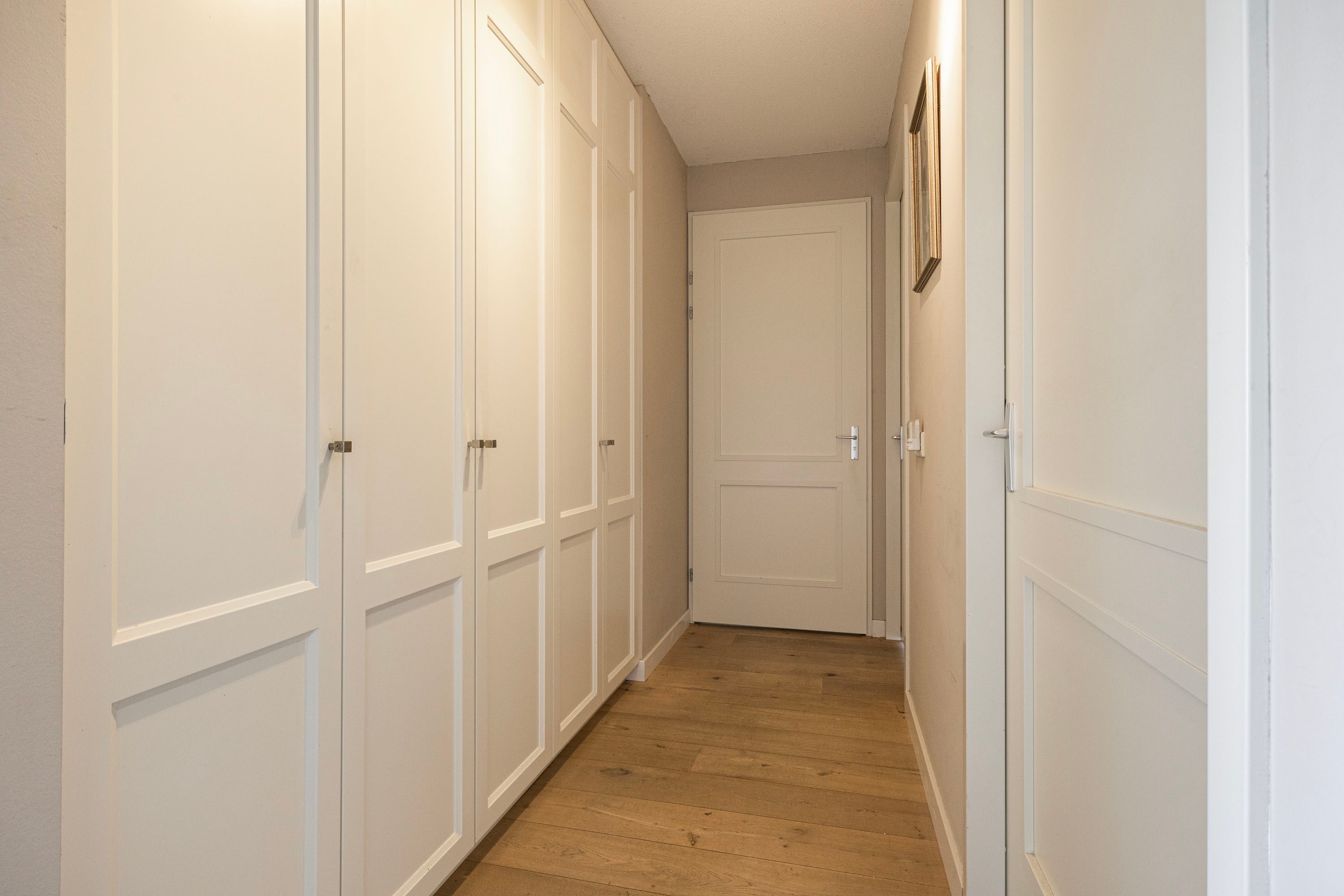Het appartement bereik je via de lift of trappengang. Bij binnenkomst vind je de meterkast, garderobekast en het seperate toilet. De lichte woonkamer valt direct op door het vrije uitzicht en de open indeling, met voldoende ruimte voor verschillende zitjes. Vanuit hier stap je het balkon op, gelegen op het zuiden en voorzien van zonnescherm.