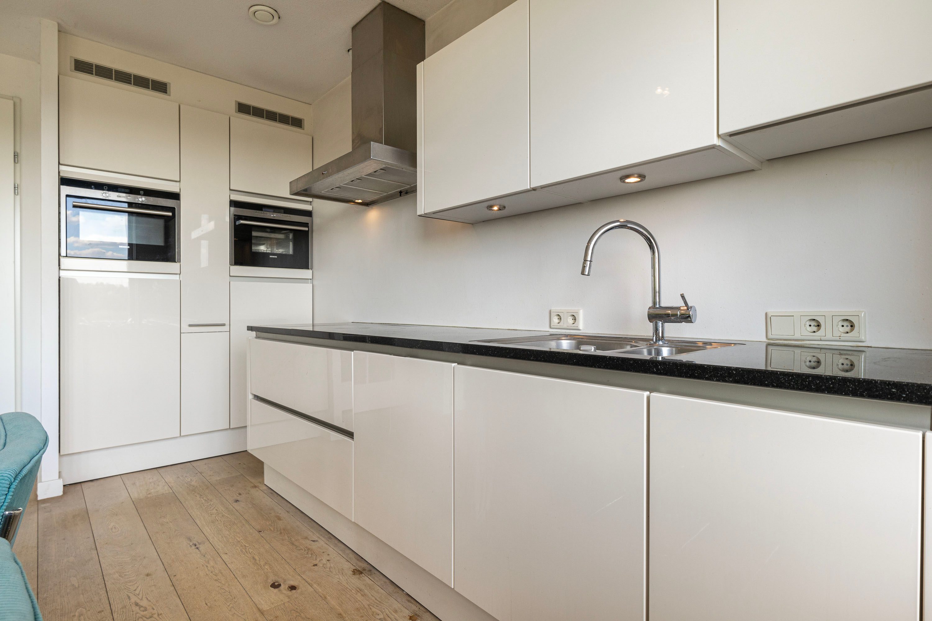 De open keuken is uitgerust met een inductiekookplaat, afzuigkap, oven, stoomoven, vaatwasser, koelkast en vriezer.