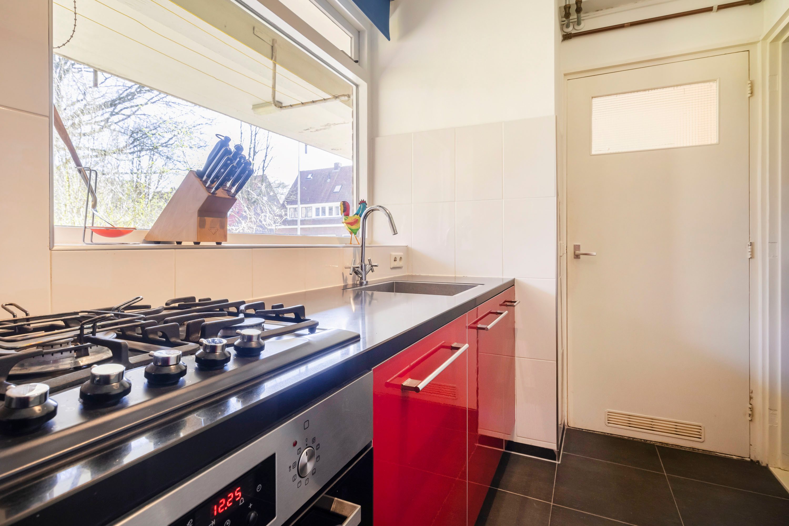 De dichte keuken is bereikbaar vanuit de hal. Met een raam aan de voorzijde is er veel daglicht en kijk je leuk weg op het groen. De keuken is uitgerust met diverse inbouwapparatuur, te weten: