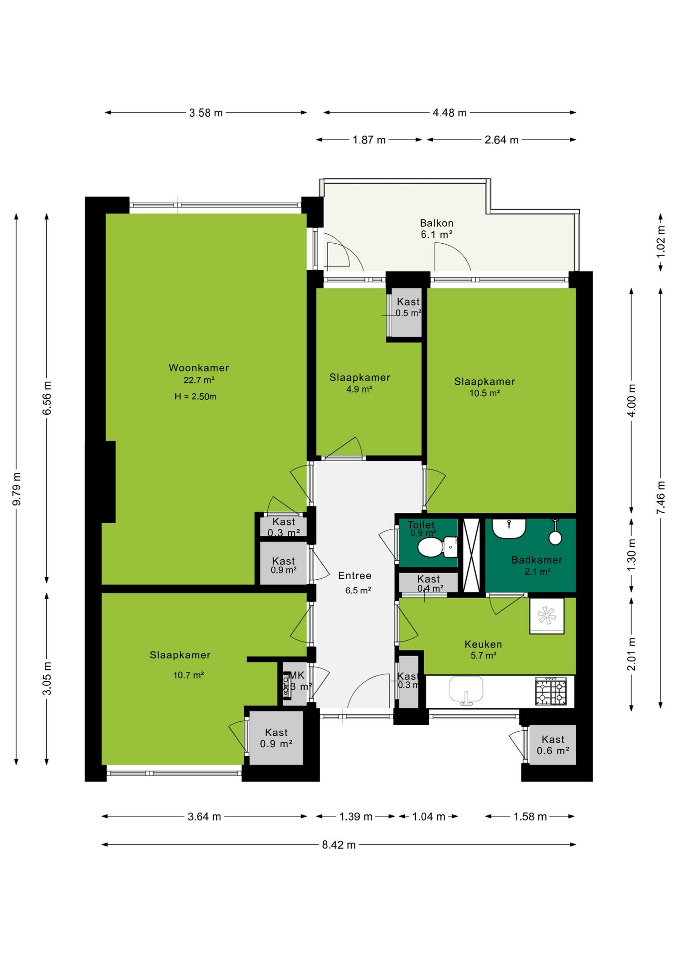 Deze woning beschikt over drie slaapkamers, waarvan er twee directe toegang bieden tot het balkon. Twee van de slaapkamers zijn voorzien van een vaste kast, ideaal voor extra opbergruimte.