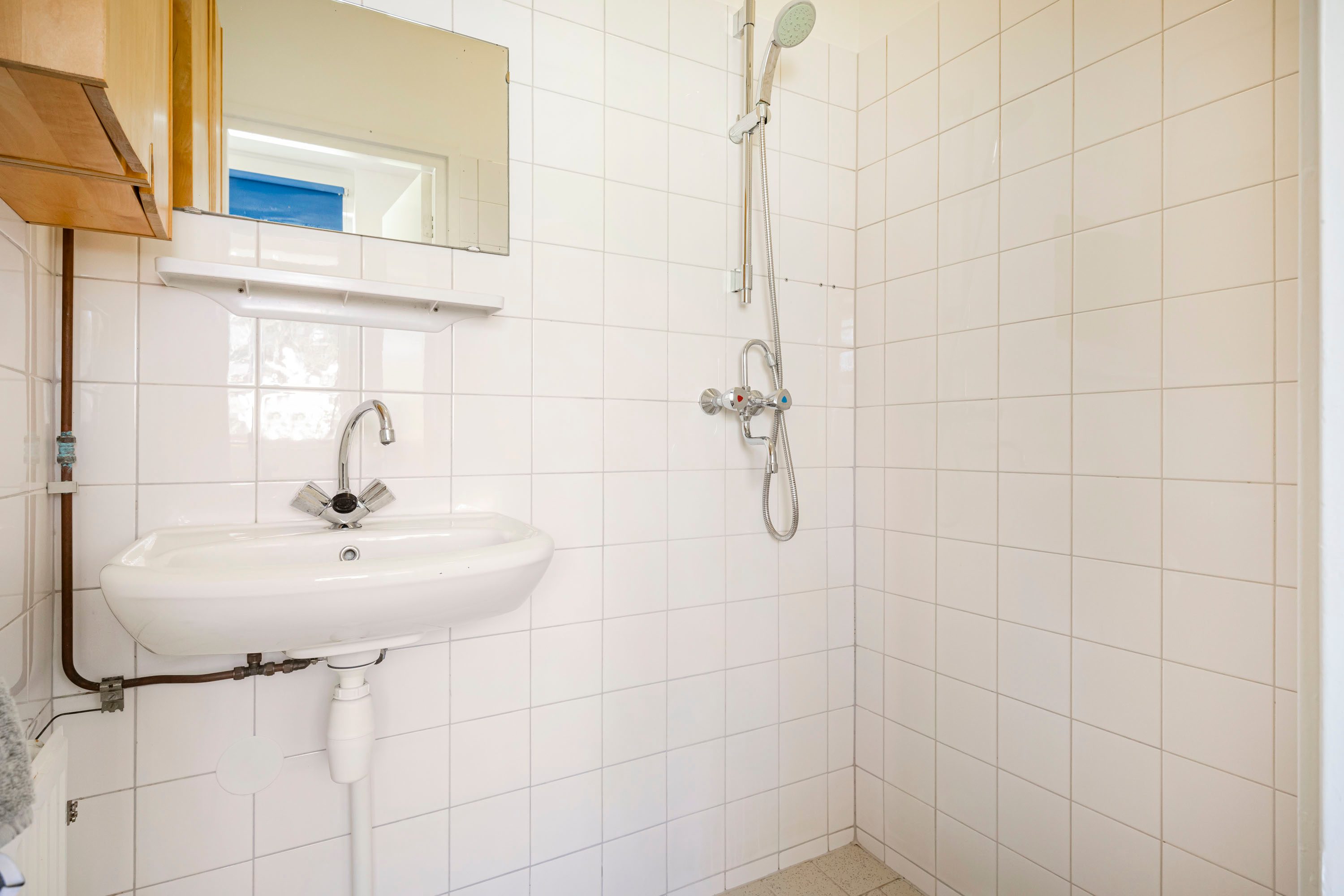 Vanuit de keuken is de badkamer te bereiken, die voorzien is van een douche, wastafel en radiator.
