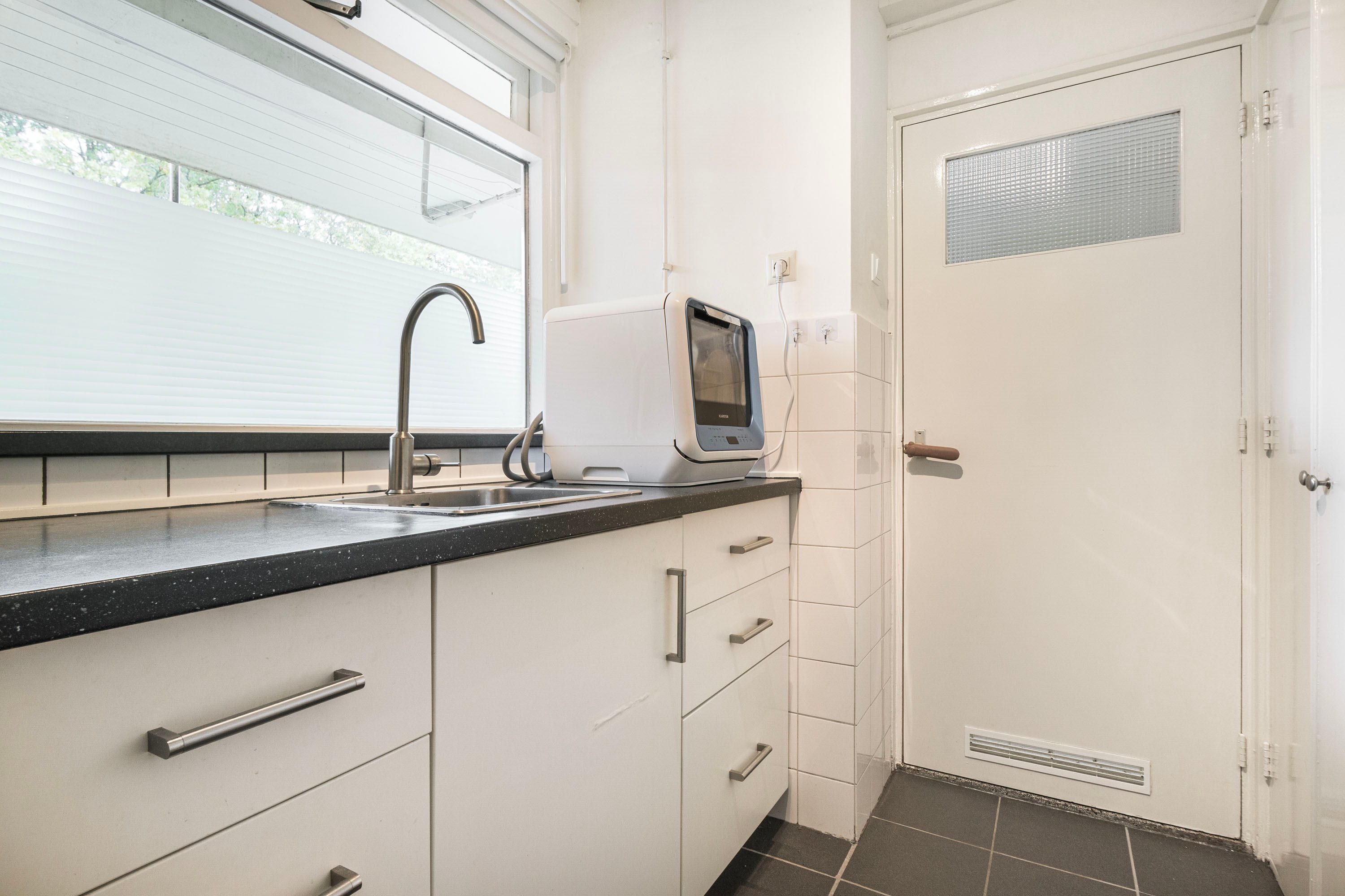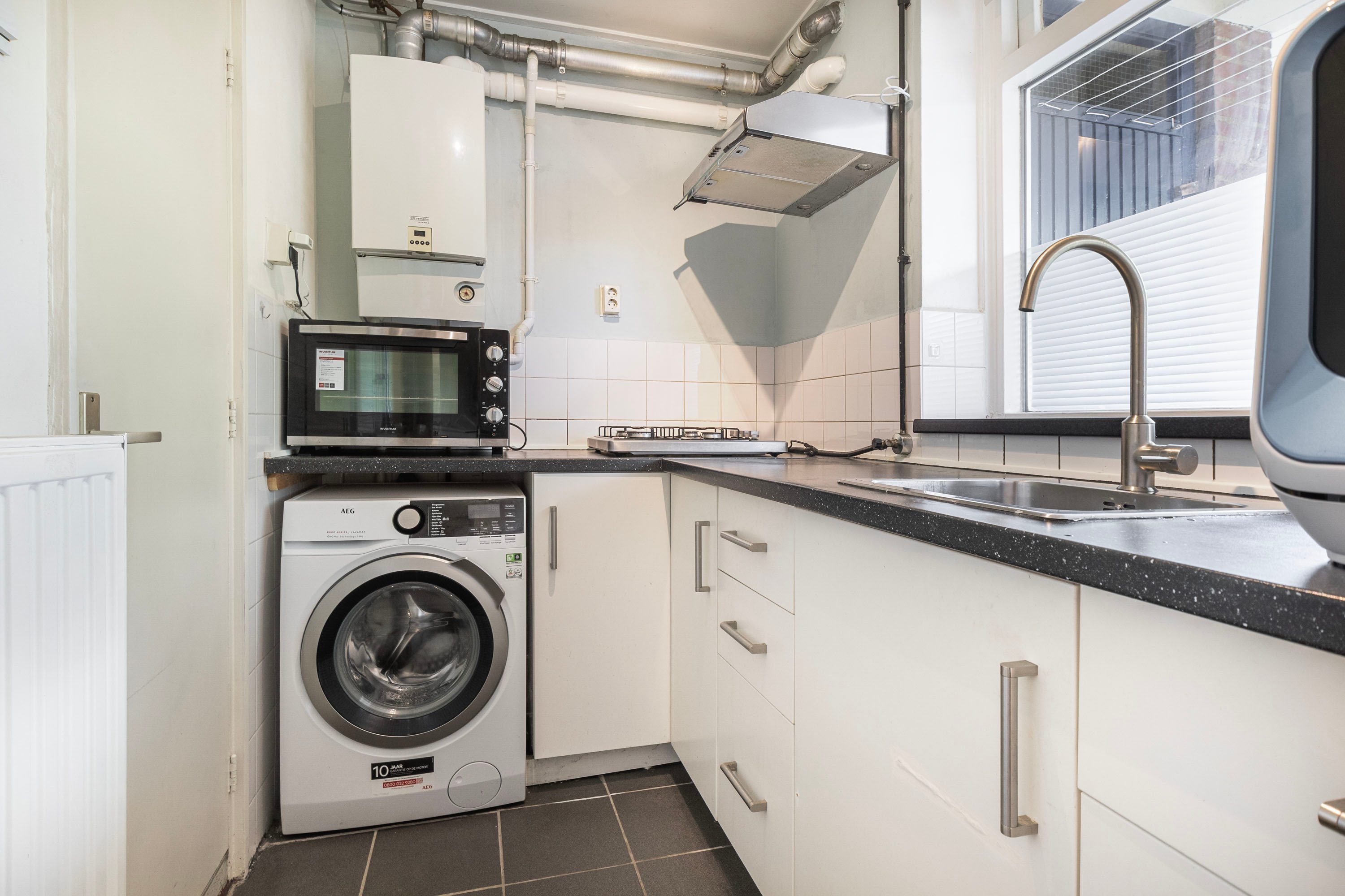 De dichte keuken is opgesteld in een hoekopstelling en voorzien van diverse inbouwapparatuur, waaronder een 4-pits gasfornuis, afzuigkap, wasmachineaansluiting en cv-ketel (2012). Er is voldoende werkbladruimte en kastruimte aanwezig.