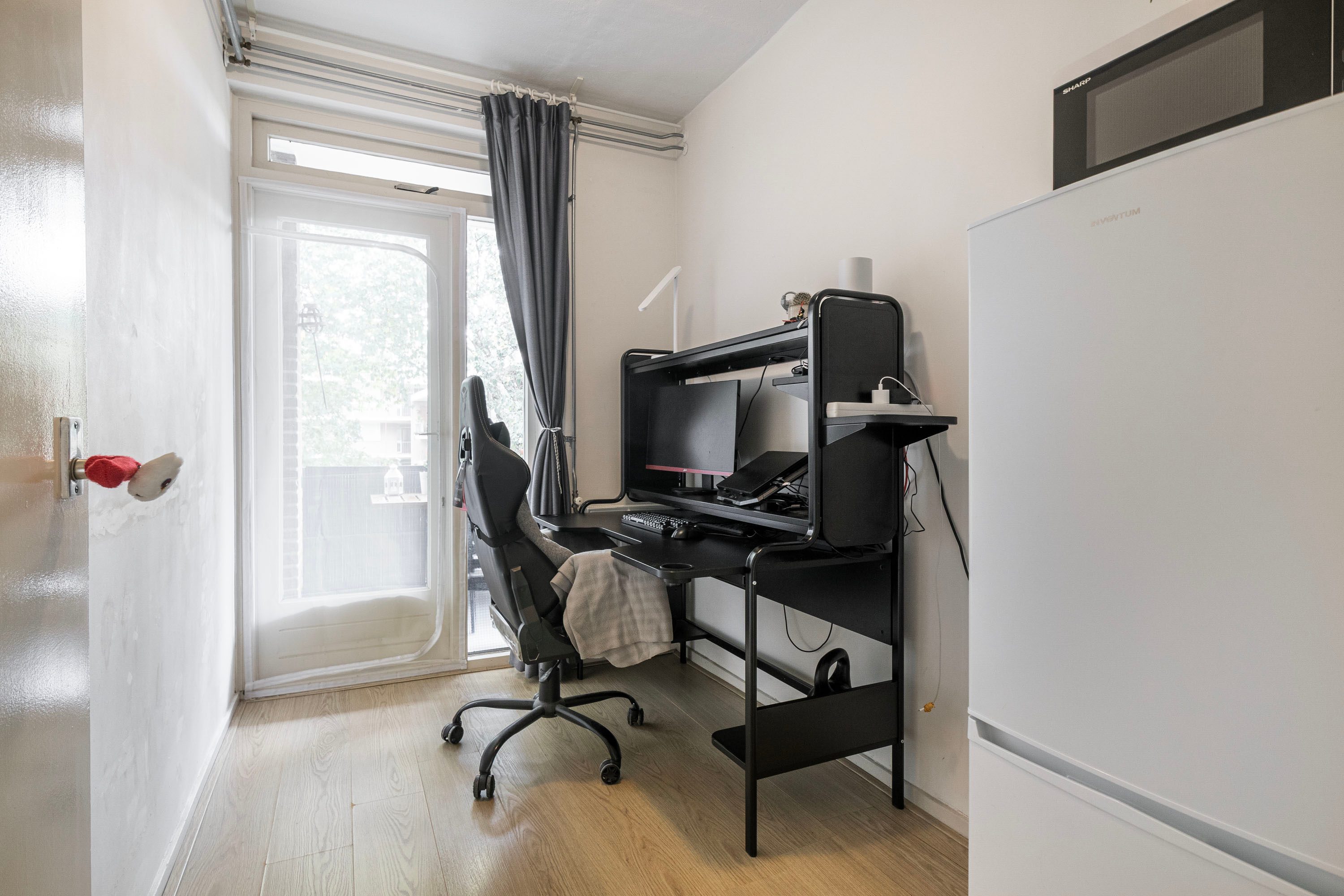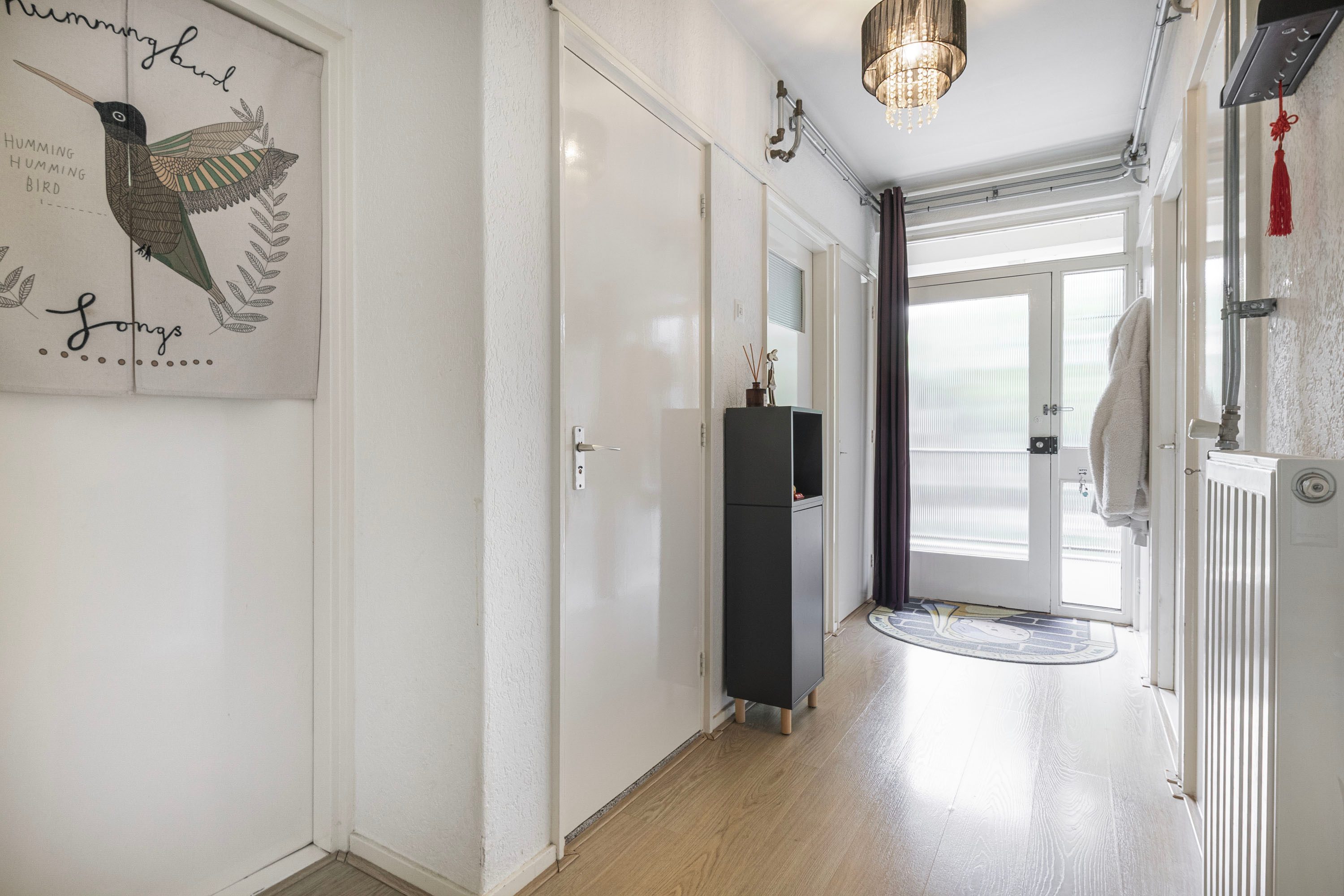 The hallway, with meter cupboard, toilet, and storage space, provides access to all rooms. The living room is spacious and bright thanks to the large windows and the view of the green surroundings. From the living room, you step directly onto the balcony, where you can enjoy the evening sun.