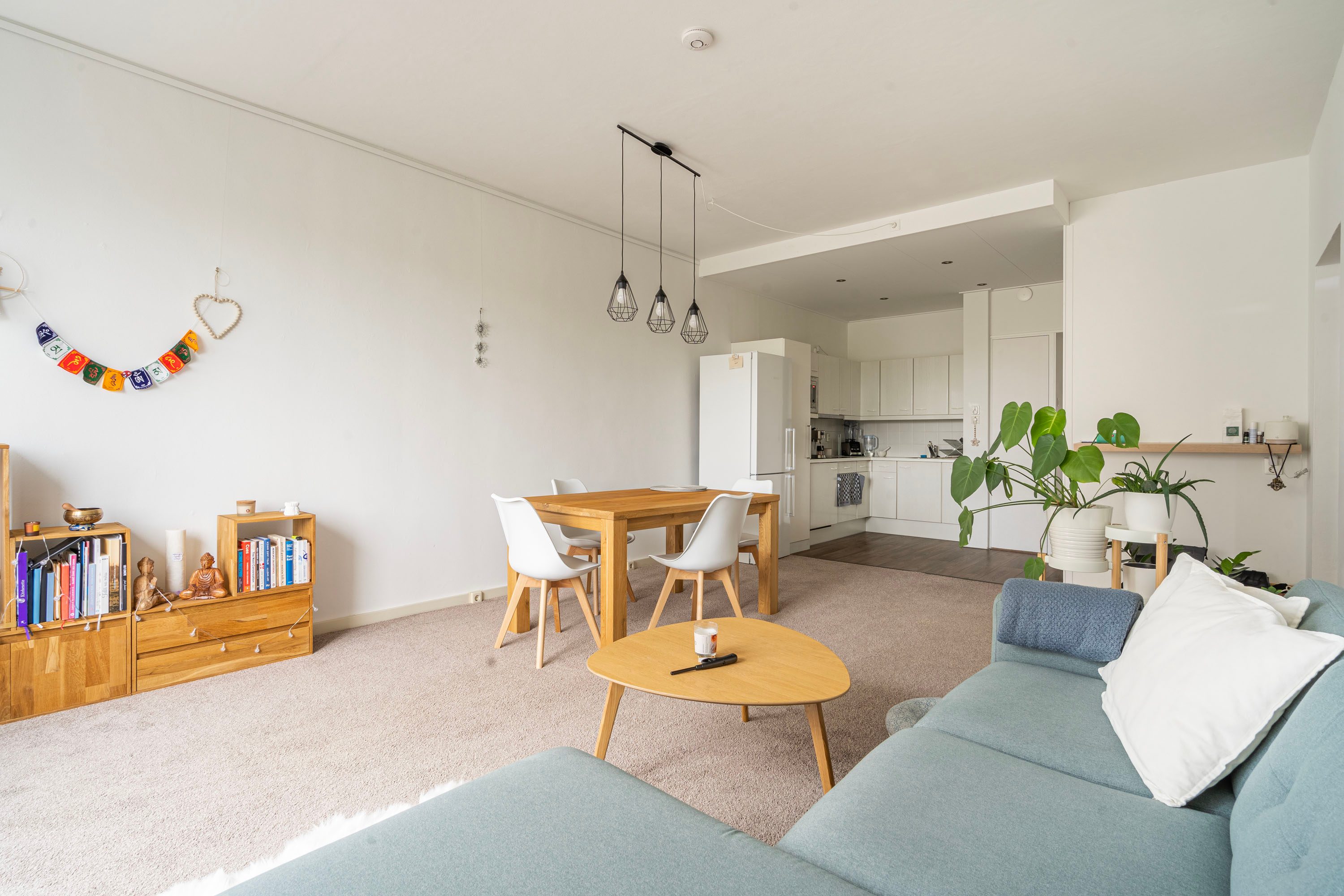 - Open keuken met een hoekkeuken voorzien van inductiekookplaat, vaatwasser, afzuigkap, koel-/vrieskast.