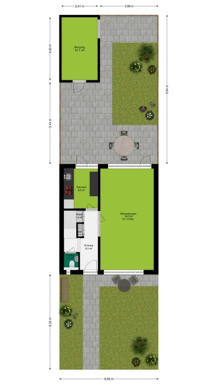 - Tuinligging op het zuiden met een achterom en een stenen berging;