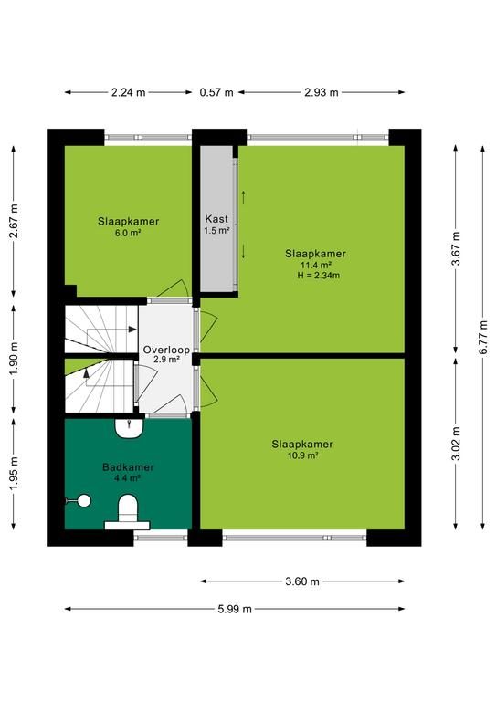 Vanaf hier heb je toegang tot de badkamer. Aan de achterzijde zijn er twee slaapkamers van 11,4 m2 en 6 m2. Beide slaapkamers bevatten elektrische screens en de grote slaapkamer bevat een grote inbouwkast.