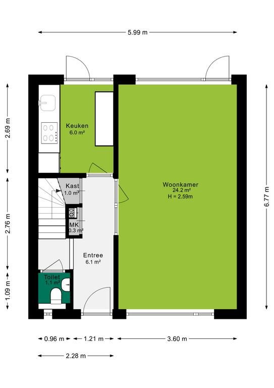 De woon-/eetkamer is heerlijk licht dankzij de grote ramen en vanuit de woonkamer heb je een fijn uitzicht op het speelveldje aan de voorzijde van de woning.