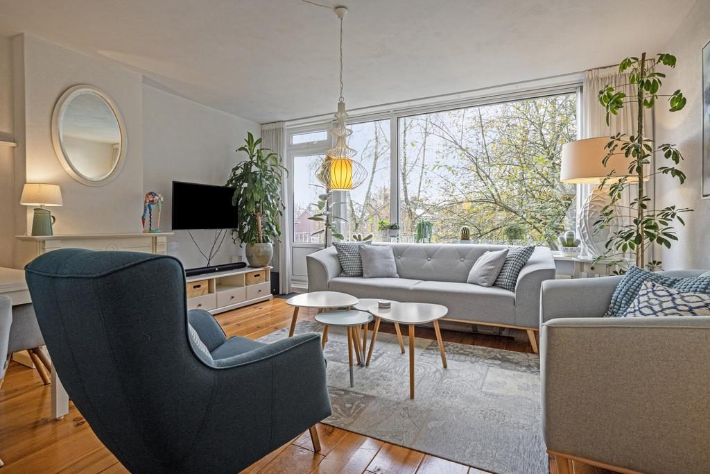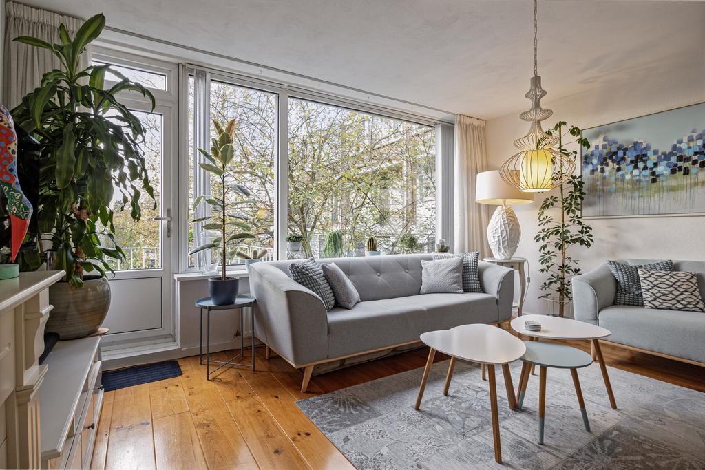 Je loopt door naar de woonkamer, een royale ruimte die baadt in natuurlijk licht. Deze kamer is voorzien van een prachtige schouw met een sfeervolle haard, wat een warm en uitnodigend gevoel creëert. Vanuit de woonkamer heb je toegang tot het balkon, dat ideaal op het zuiden is gelegen. De ramen zijn uitgerust met screens, waardoor je de perfecte plek hebt om van de zon te genieten en te ontspannen. De boom aan de rechterzijde van het balkon biedt een groot gedeelte van het jaar privacy voor zowel het balkon als de woonkamer.