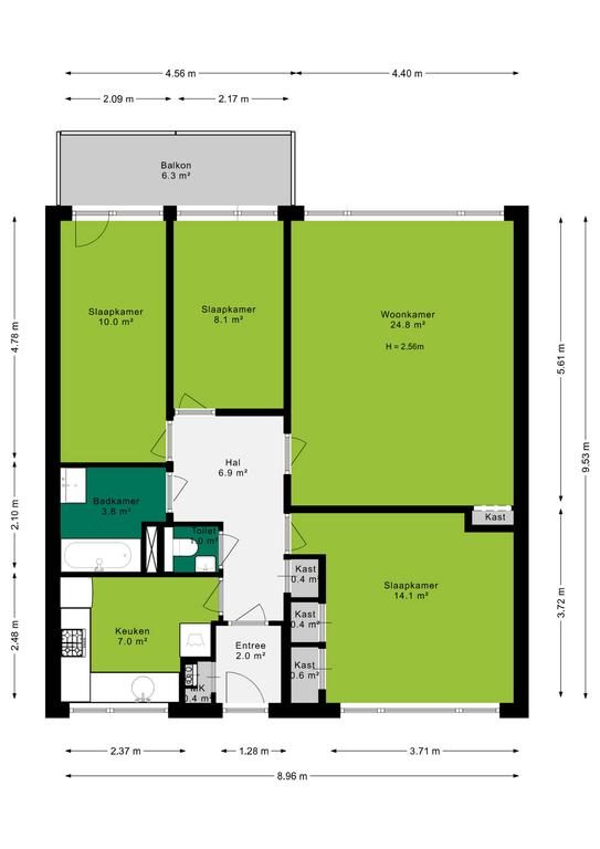 De tweede slaapkamer met een oppervlakte van 10 m² biedt directe toegang tot het balkon, perfect voor een frisse start van de dag. De derde slaapkamer is 8 m² groot, ideaal als kinderkamer, thuiskantoor of hobbyruimte.