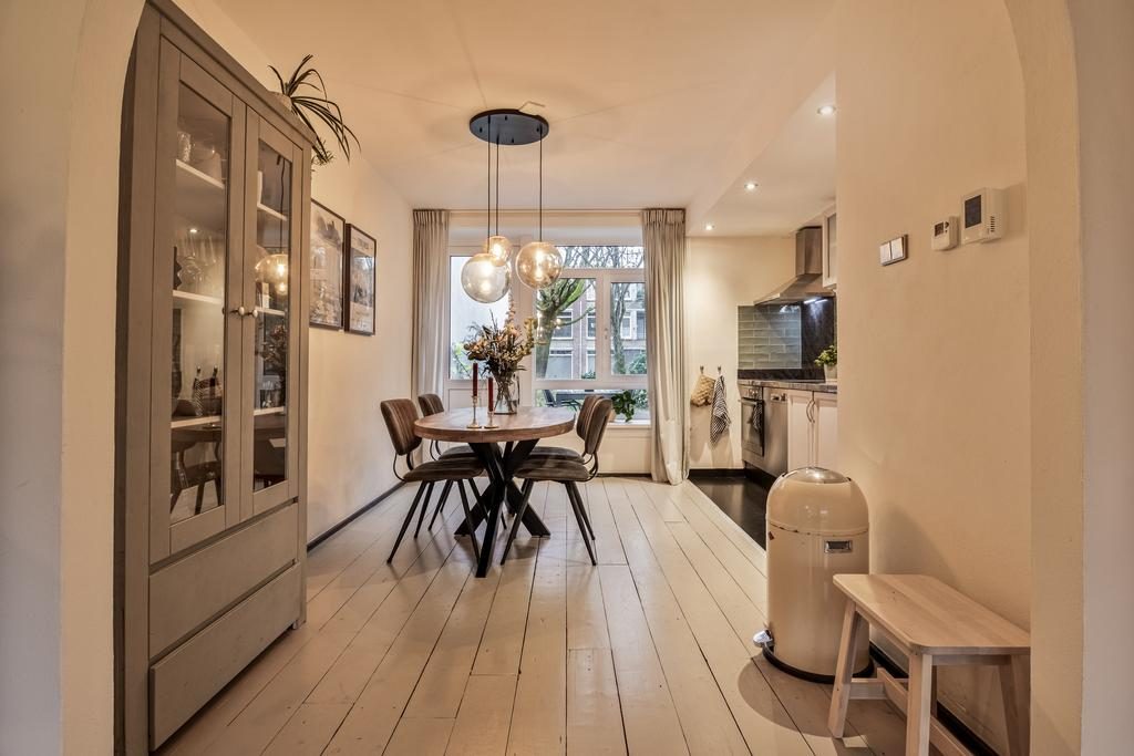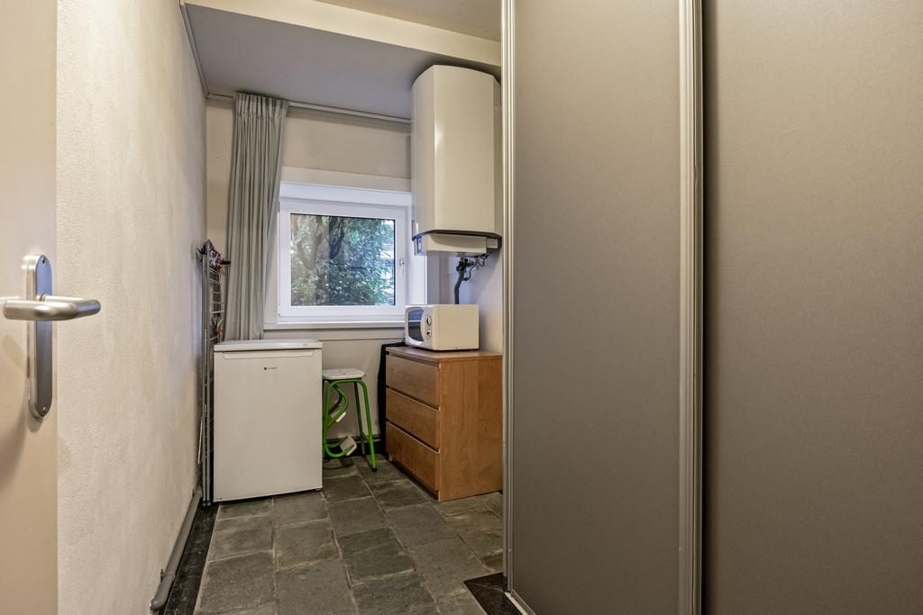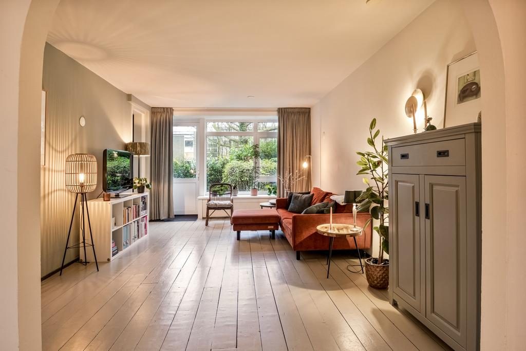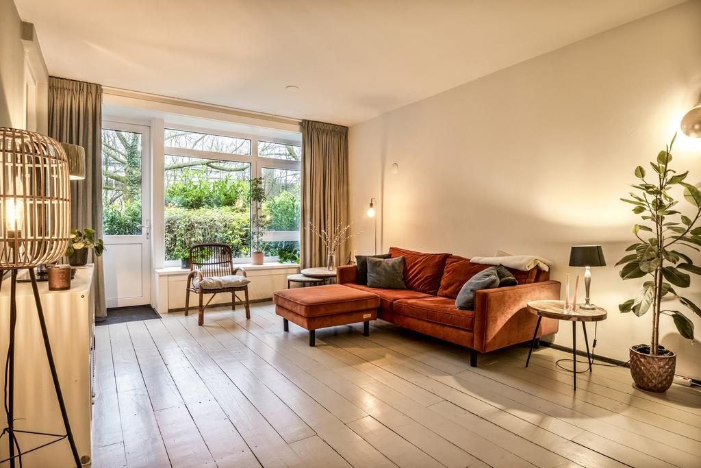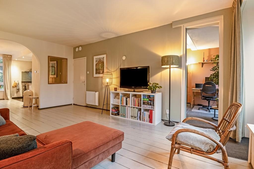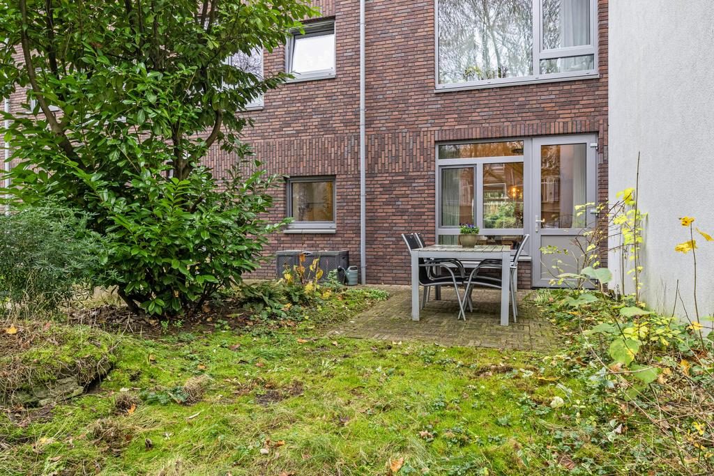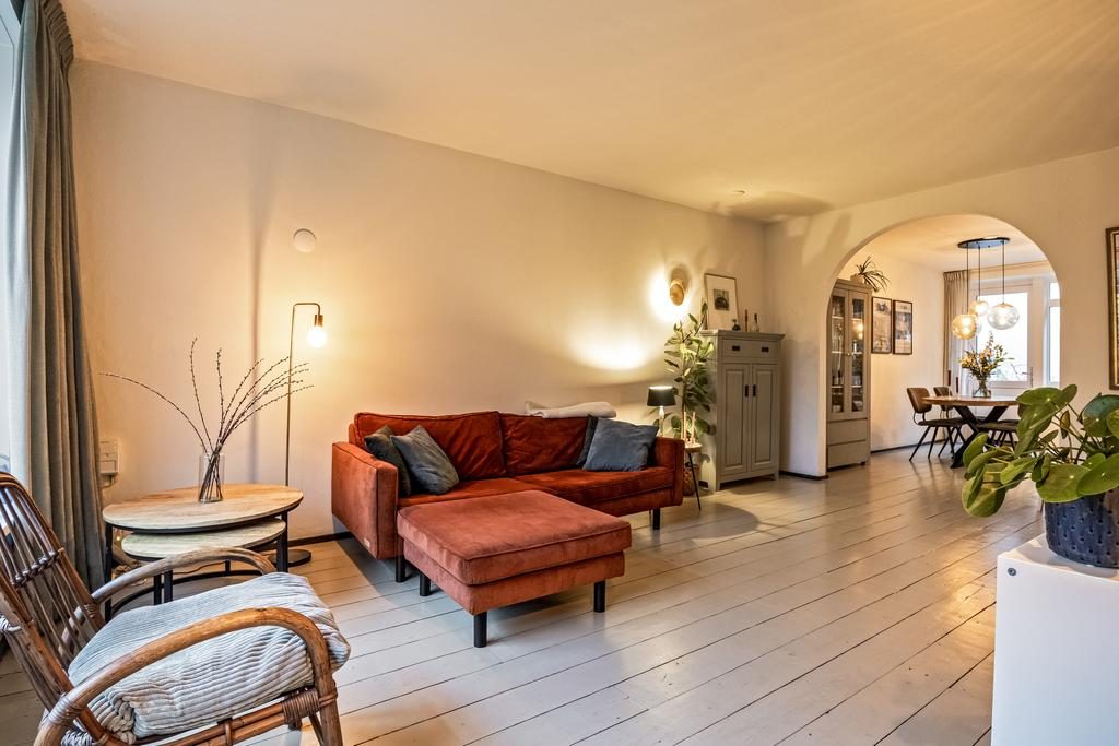 De ruime entree en hal met toilet en meterkast geven toegang tot alle vertrekken. De royale woonkamer heeft afmeting van bijna 25m², is voorzien van een sfeervolle houtenvloer, neutrale wanden en door de grote raampartijen is er heerlijk veel lichtinval en een fijn uitzicht. De open toog zorgt voor een gezellige verbinding tussen de woonkamer en woonkeuken. De ruime woonkeuken is in een warme kleuropstelling en is voorzien van diverse inbouwapparatuur waaronder een inductie kookplaat, afzuigkap, oven, close-in boiler, koelkast en vaatwasser. Door de fijne afmeting past hier gemakkelijk een grote eettafel. Vanuit de woonkamer en keuken is er toegang tot de tuin, deze deuren kunnen ook als eigen toegangsdeur gebruikt worden.