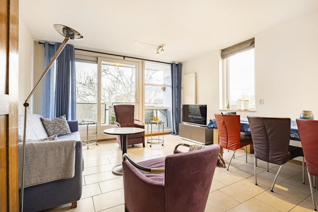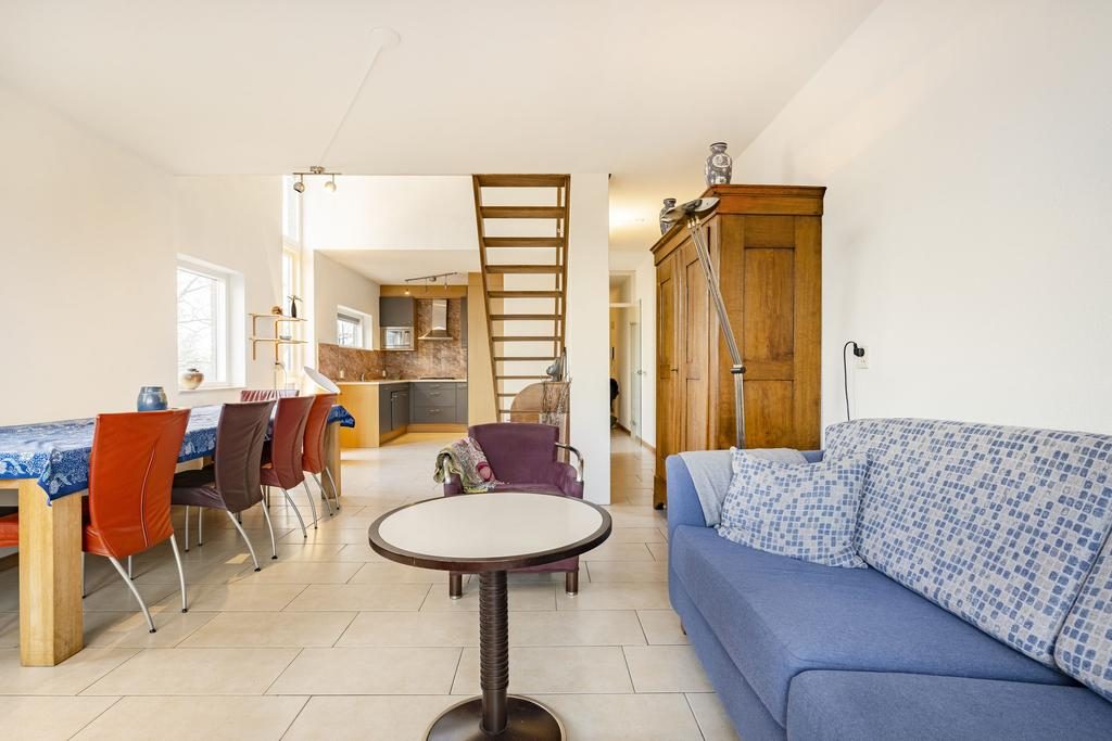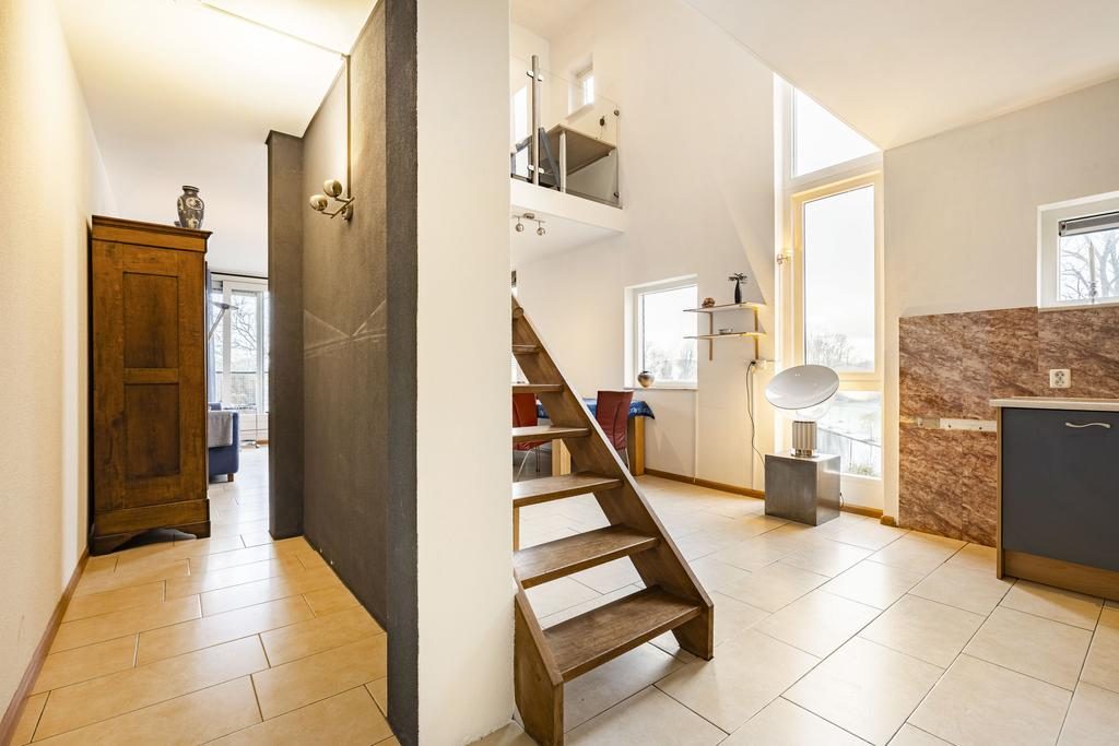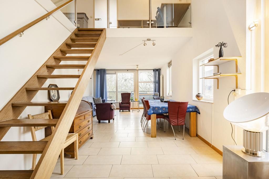 Bij binnenkomst in het appartement tref je een ruime hal aan. Deze hal biedt toegang tot de berging met wasmachine aansluitingen, de woonkamer en een separaat toilet. De woonkamer is een prachtige open ruimte met een stijlvolle open trap naar de eerste verdieping. Dankzij de grote raampartijen en openslaande deuren naar het balkon is de woonkamer heerlijk licht en uitnodigend.