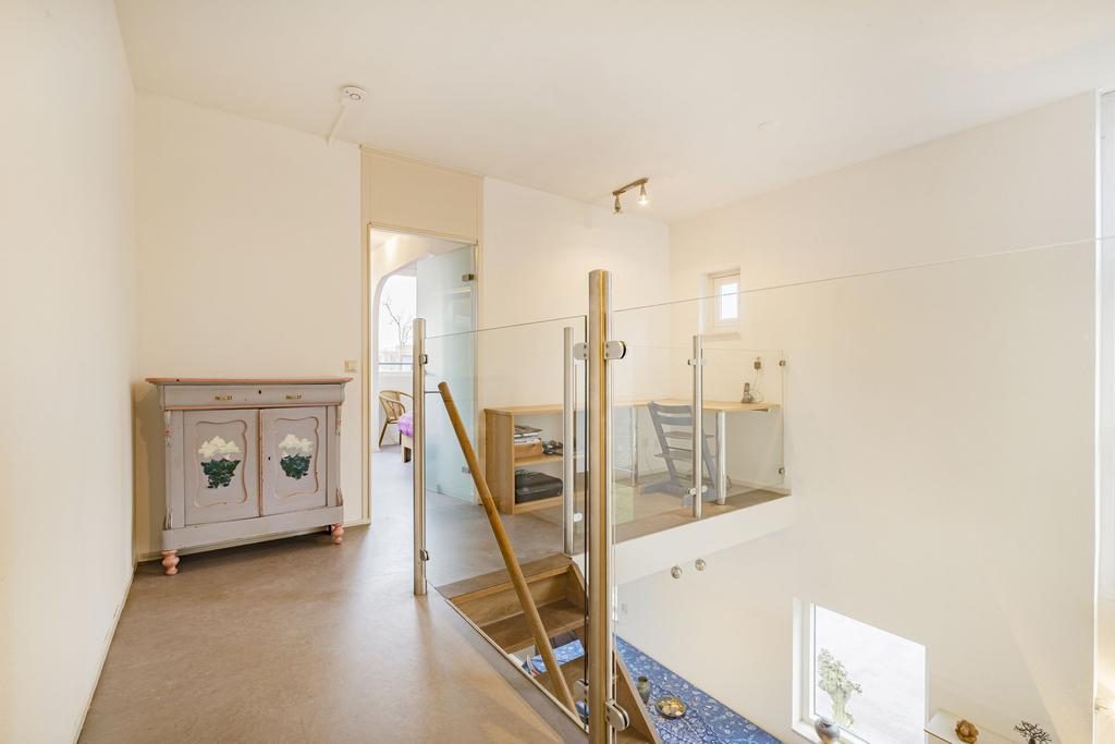 Via de open trap bereik je de eerste verdieping, waar je op de overloop uitkomt. Deze overloop geeft toegang tot twee ruime slaapkamers, een badkamer (vergroot) en een werkruimte. De slaapkamers bevinden zich aan beide uiteinden van de woning. Eén van de slaapkamers beschikt over een inbouwkast en een eigen balkon, terwijl de tweede slaapkamer is voorzien van een grote raampartij voor optimaal daglicht.