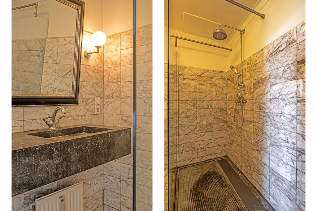 Er zijn twee grote slaapkamers (15m2 en 14m2), beide voorzien van een prachtig grote inbouwkast. De grootste slaapkamer heeft rechtstreeks toegang tot de badkamer. De badkamer is volledig in een passende sfeer betegeld en afgewerkt, er is een ruime inloopdouche en een grote hardstenen wastafel. Separaat van de badkamer is er een toiletruimte.