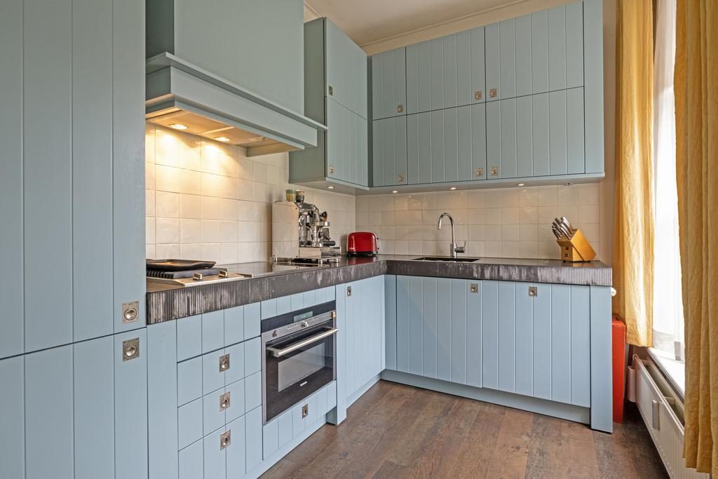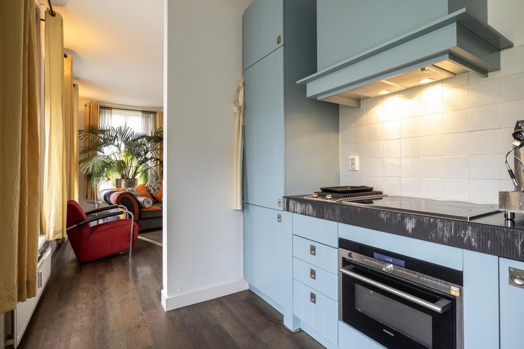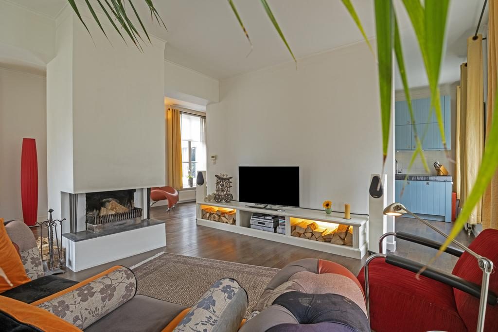 De woonkamer van het appartement (ca. 42m2) is royaal en dankzij de 9 hoge raampartijen heerlijk licht. Vanuit de woonkamer is er een fantastisch uitzicht op de bijbehorende tuin. Uiteraard mogen alle bewoners van Lommerlust hier gebruik van maken. Een eyecatcher in de woonkamer is de sfeervolle haardpartij. Deze is volledig functioneel. In de hoek van de kamer is de half open keukenruimte gesitueerd. Deze is voorzien van een landelijke inbouwkeuken in hoekopstelling inclusief diverse inbouwapparatuur. Er is voldoende kastenruimte aanwezig. Het werkblad is gemaakt van een dikke plaat hardsteen.