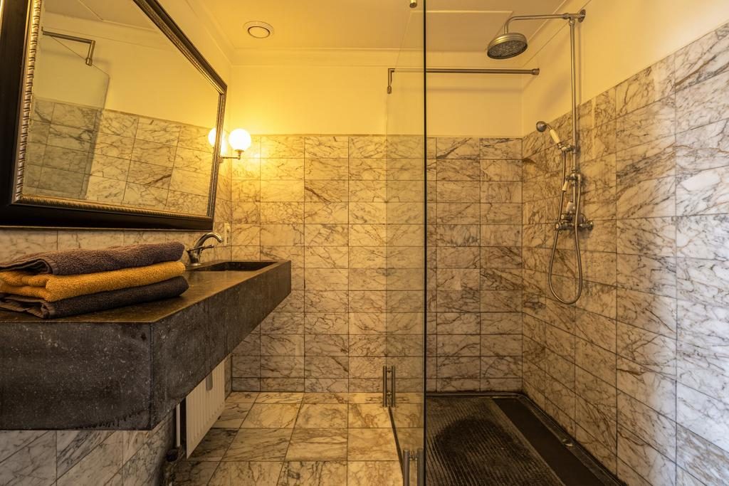 Er zijn twee grote slaapkamers (15m2 en 14m2), beide voorzien van een prachtig grote inbouwkast. De grootste slaapkamer heeft rechtstreeks toegang tot de badkamer. De badkamer is volledig in een passende sfeer betegeld en afgewerkt, er is een ruime inloopdouche en een grote hardstenen wastafel. Separaat van de badkamer is er een toiletruimte.