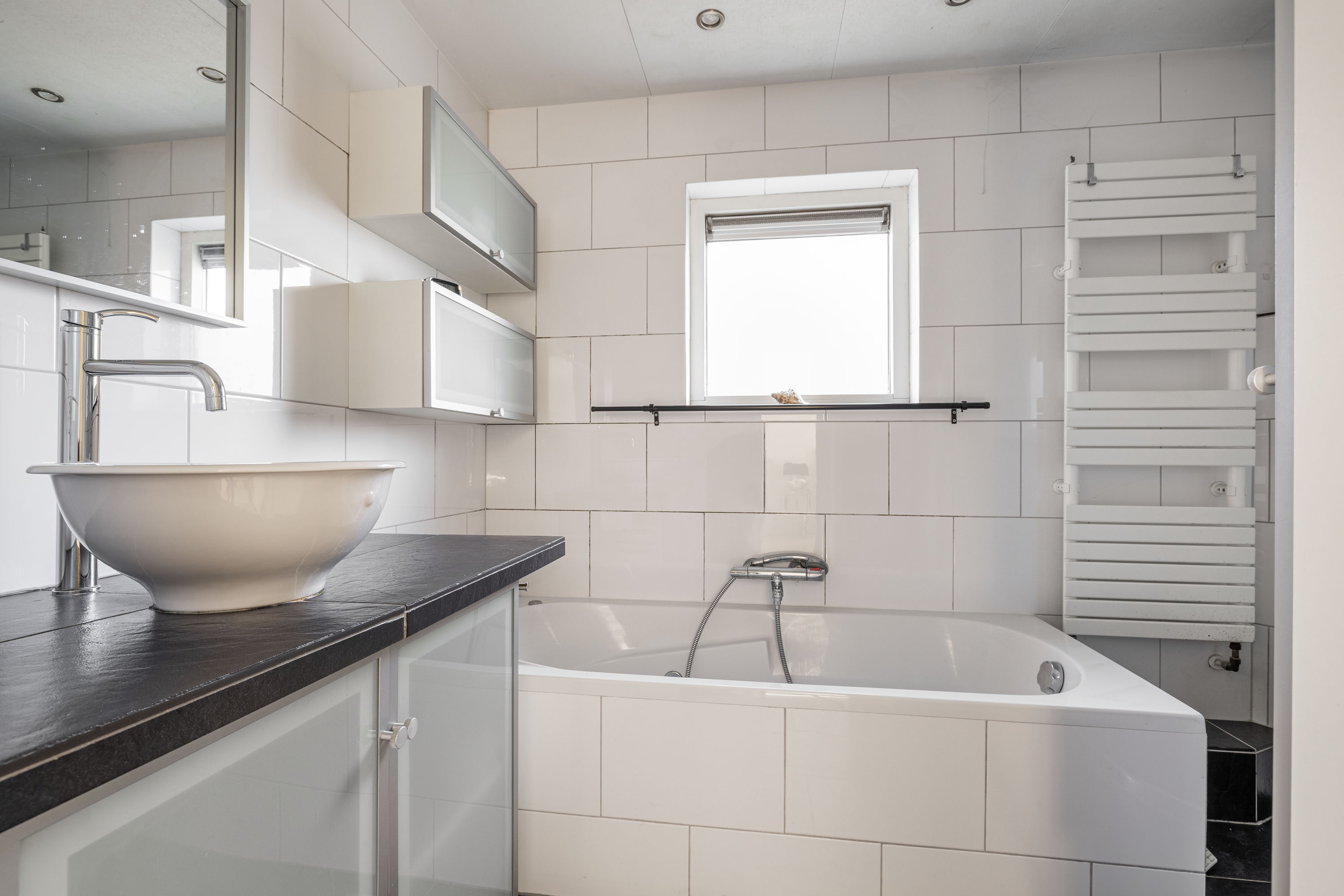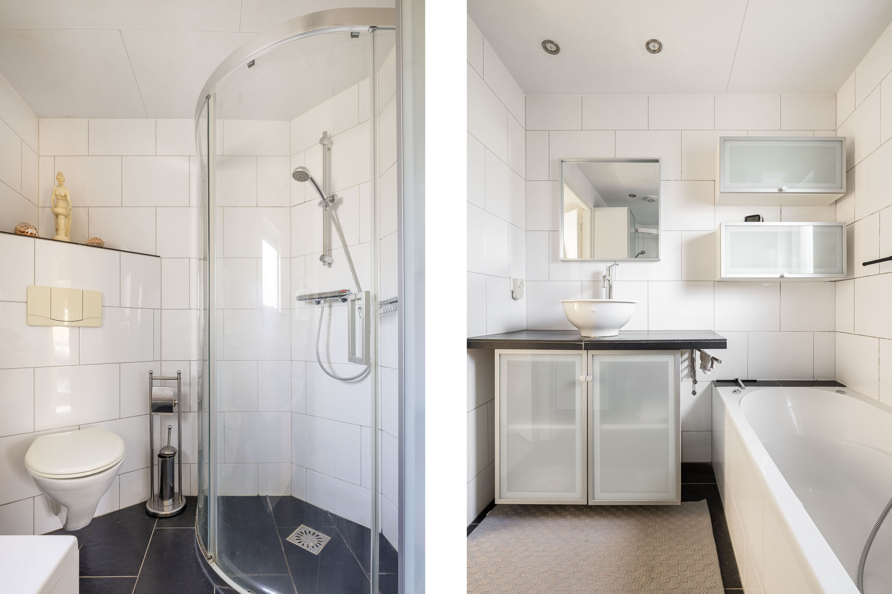 De overloop geeft toegang naar 3 slaapkamers, de badkamer en tussenhal met trapopgang naar de tweede verdieping. De slaapkamers zijn goed bemeten, voorzien van nette vloeren en voldoende lichtinval. De grootste slaapkamer is voorzien van vaste kasten en airconditioning. De slaapkamer aan de voorzijde is eveneens voorzien van vaste kasten en geeft toegang tot een fijn balkon. De tussenhal is erg ruim waardoor deze thans in gebruik is als werkruimte. De badkamer is opgesteld in een moderne kleurstelling en is voorzien van een ligbad, inloopdouche, wastafel met wastafelmeubel, toilet, handdoekradiator en een raam om te kunnen ventileren.